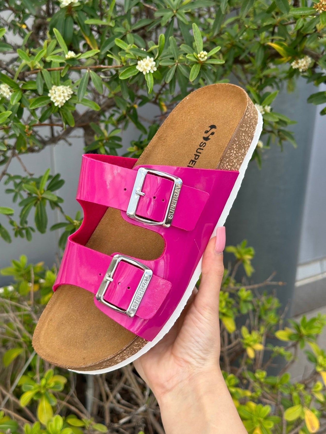 Ciabatta Superga anatomica S31U140 , colore Fuxia con doppia fibbia regolabile. Tomaia in ecopelle e appoggio morbido è in pelle. Il battistrada è in gomma. E' una ciabatta molto comoda da indossare piedi nudi ed è utilizzabile come un sandalo.