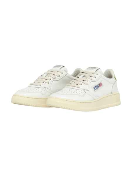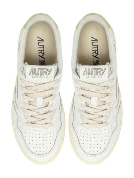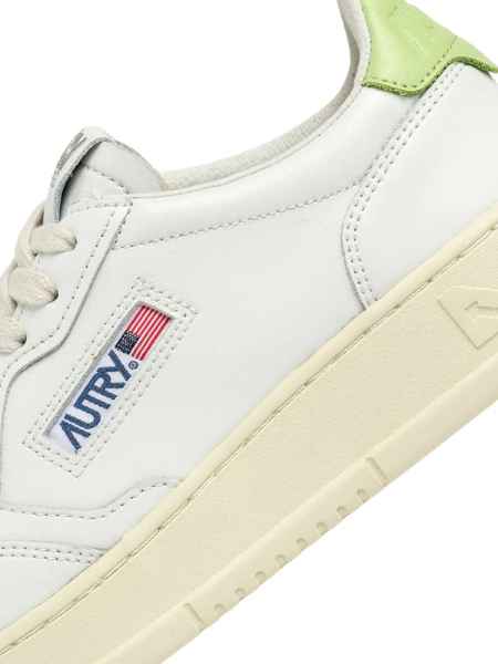 Sneaker con tomaia in pelle bianca con impunture. Punta traforata, collarino imbottito, fodera in pelle e spugna di cotone, linguetta in pelle con imbottitura in spugna e label Autry. Soletta interna in pelle logata, chiusura regolabile tramite lacci piatti in cotone bianchi, talloncino in colore verde con logo Autry. Suola logata in gomma altezza di 3cm.