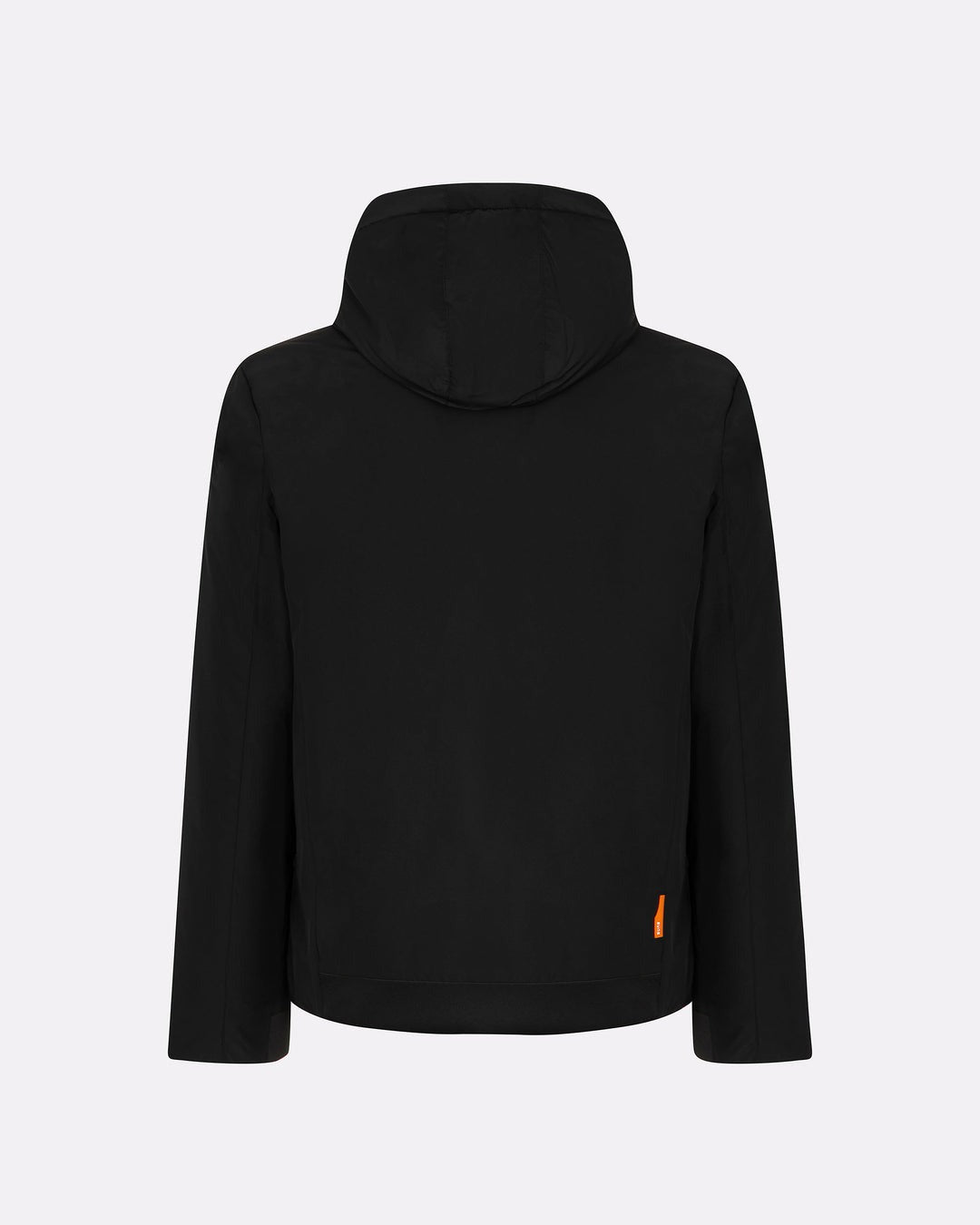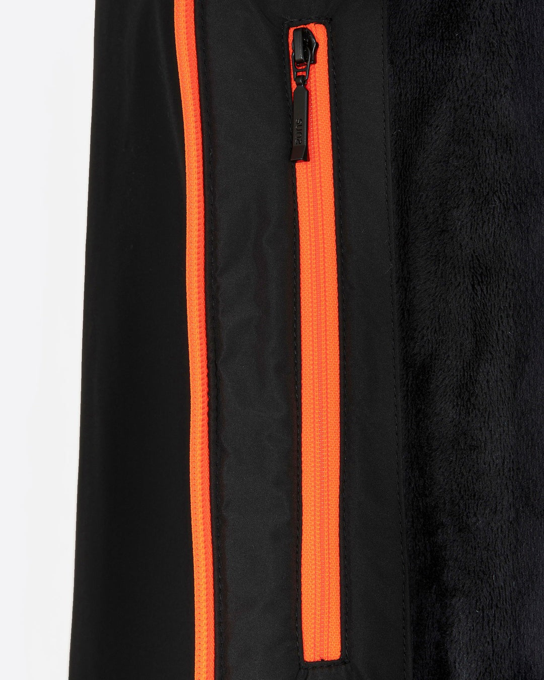 Zip frontale bicolore: parte esterna nera impermeabile, parte interna arancione a contrasto.