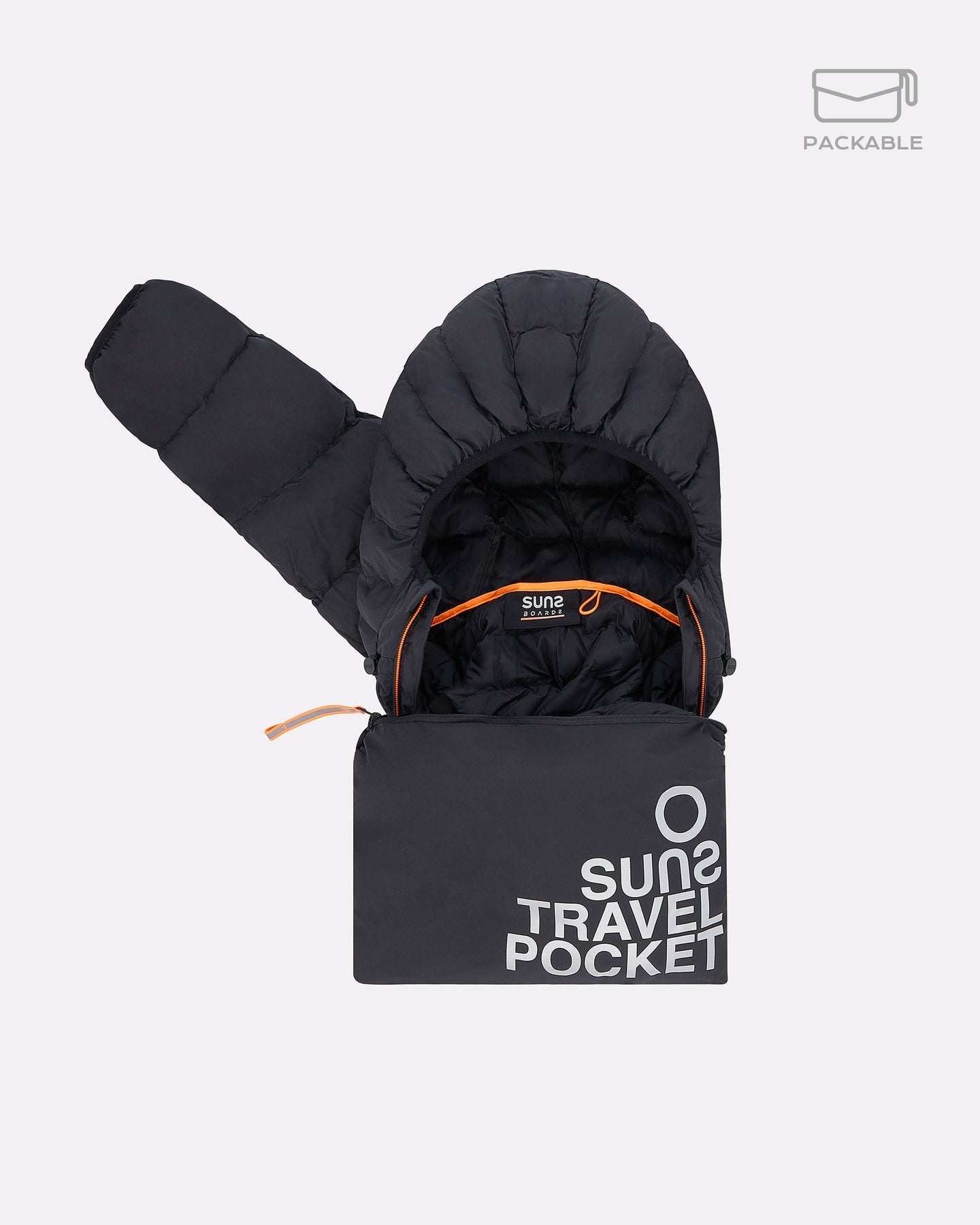 Giubbotto donna pensato per chi è sempre in movimento. La struttura da 100 grammi lo rende ideale nei cambi di stagione, offrendo un giusto equilibrio tra calore e leggerezza. Il cappuccio fisso e la zip frontale a doppio cursore garantiscono praticità e protezione nelle giornate più fresche. Il capo è richiudibile nella sua tasca interna con stampa, rendendolo estremamente pratico da trasportare ovunque. Completano il design la vestibilità confortevole, la silhouette compatta e la pinnetta arancione fluo, elemento distintivo del brand Suns, sempre posizionata sul fianco lato destro.