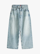 I jeans, caratterizzati dal taglio ampio e dalla vita media, sono completati dalla cintura coordinata per un tocco di originalità in più.