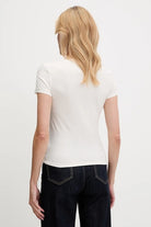 T-shirt donna T-shirt realizzata in maglia fine elasticizzata. Il modello realizzato in un materiale estremamente confortevole e traspirante perfetto per la stagione calda. Il modello è stato in parte realizzato in materiali provenienti dall'agricoltura rigenerativa, che significa la collaborazione degli agricoltori con il ritmo della natura. Questo tipo di agricoltura consente un maggiore riposo e una maggiore ricrescita,