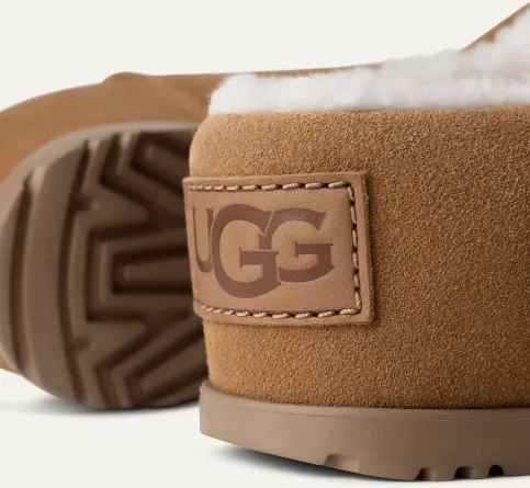 Etichetta in tessuto con logo UGG® sulla soletta, etichetta in pelle con logo UGG® in rilievo sul tallone