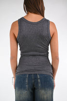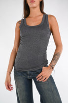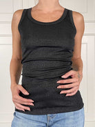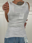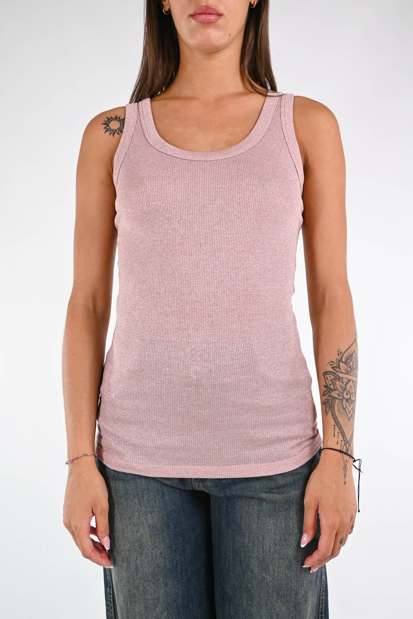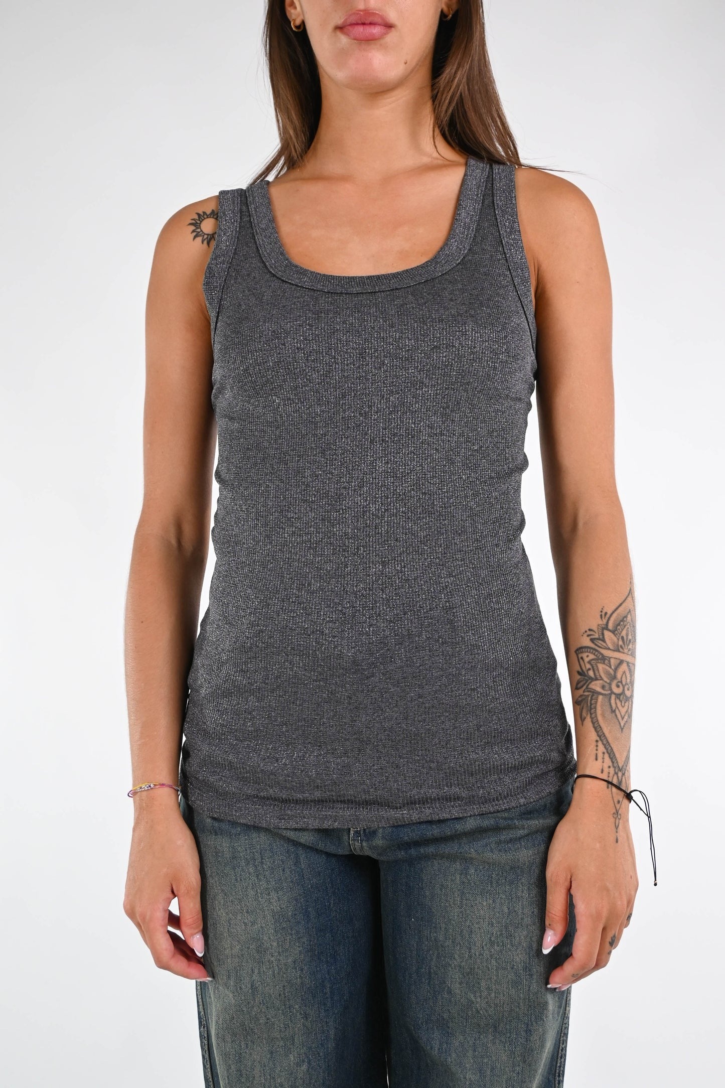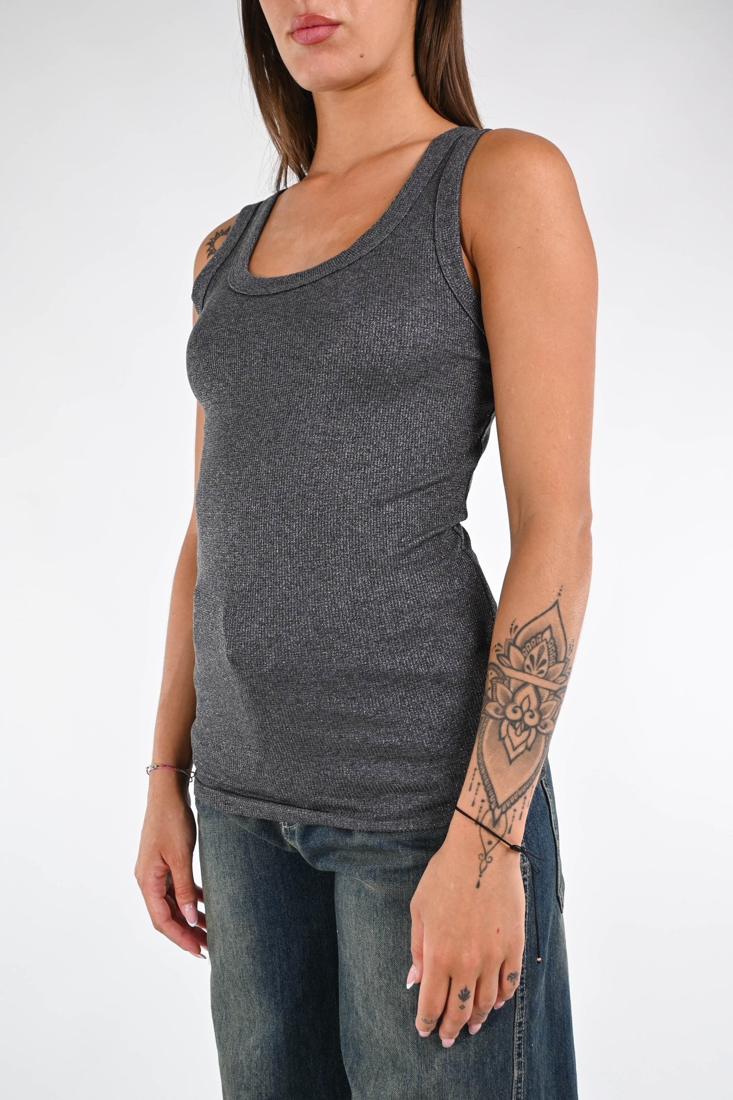 Canotta in lurex con lavorazione a costine, caratterizzata da un taglio aderente che valorizza la silhouette. Il girocollo classico e le spalline larghe la rendono comoda e raffinata allo stesso tempo.