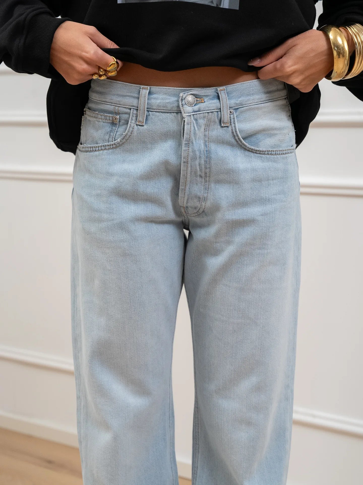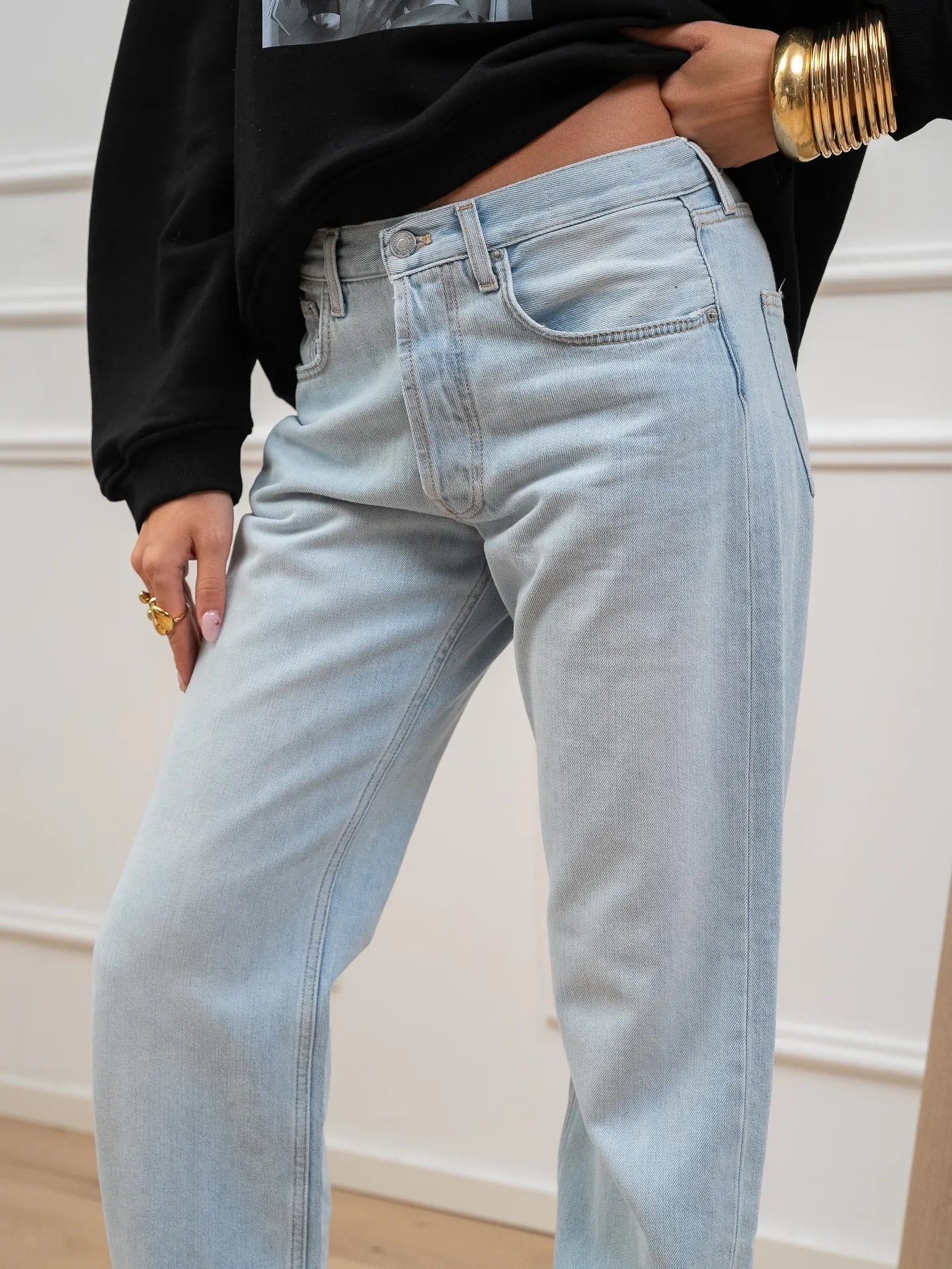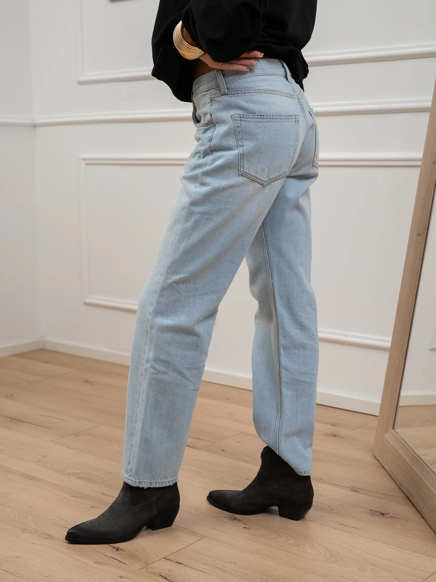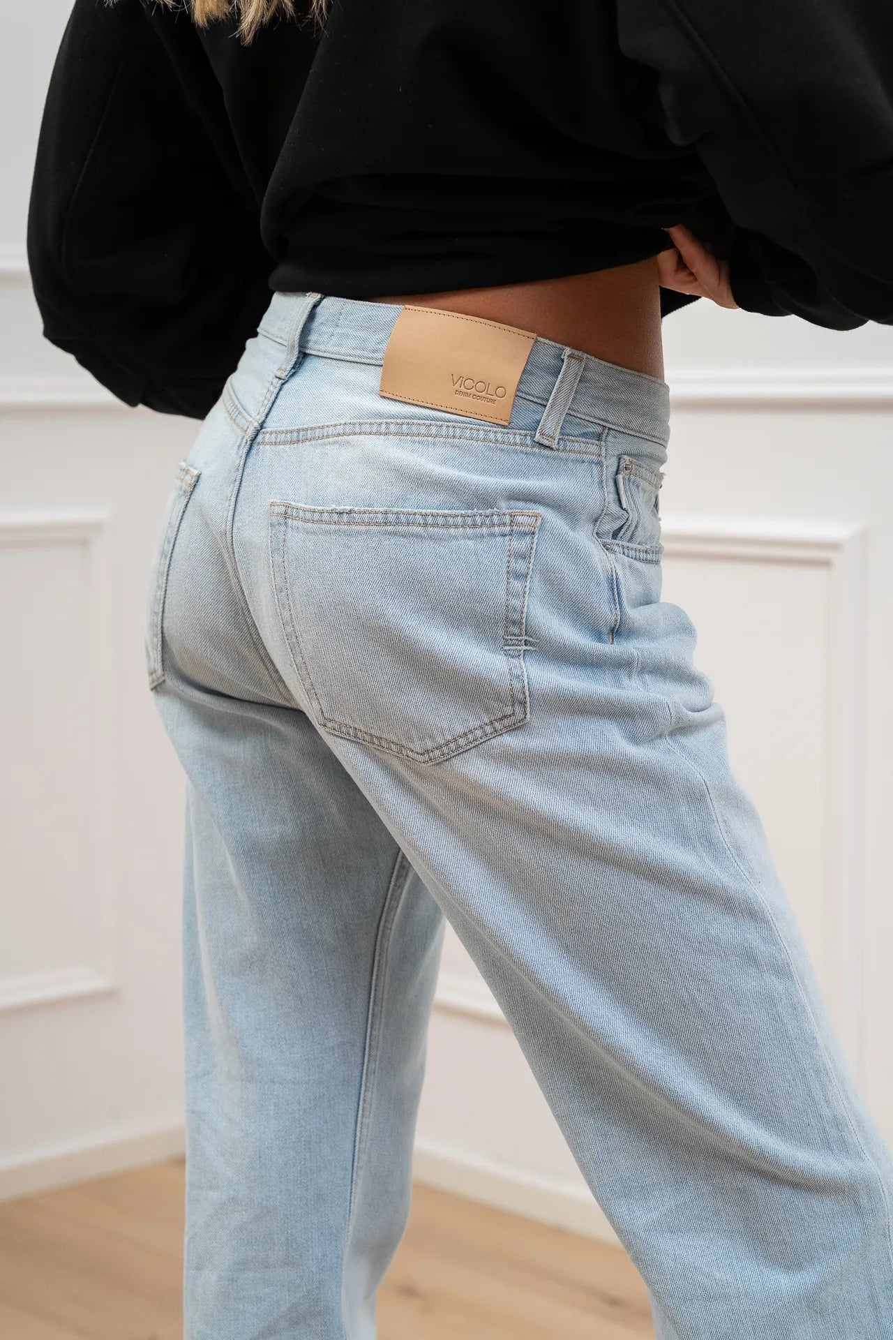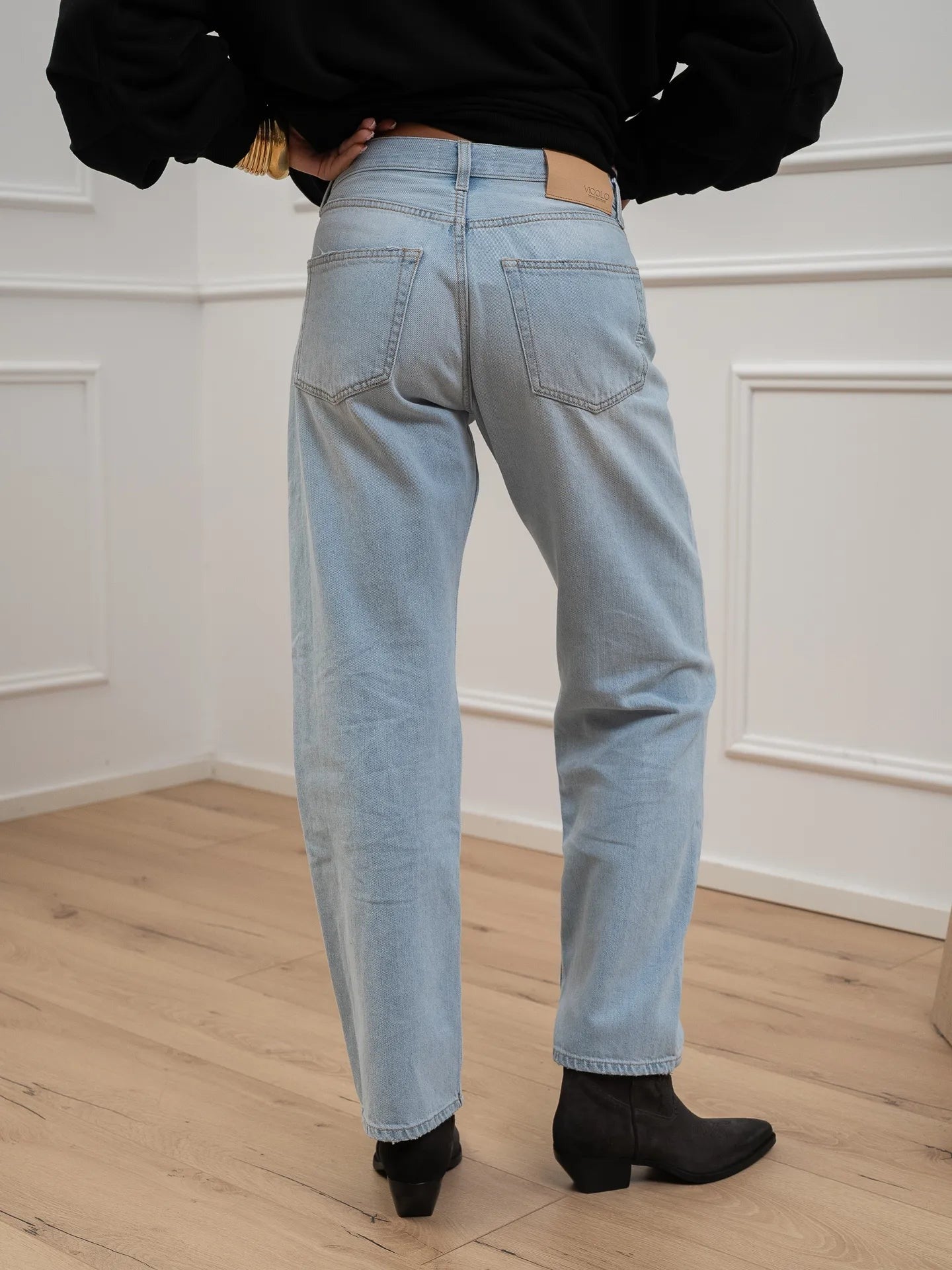 Jeans Emy lavaggio chiaro Vicolo. Modello sigaretta relaxed fit a vita medio alta. Chiusura bottone e zip.
