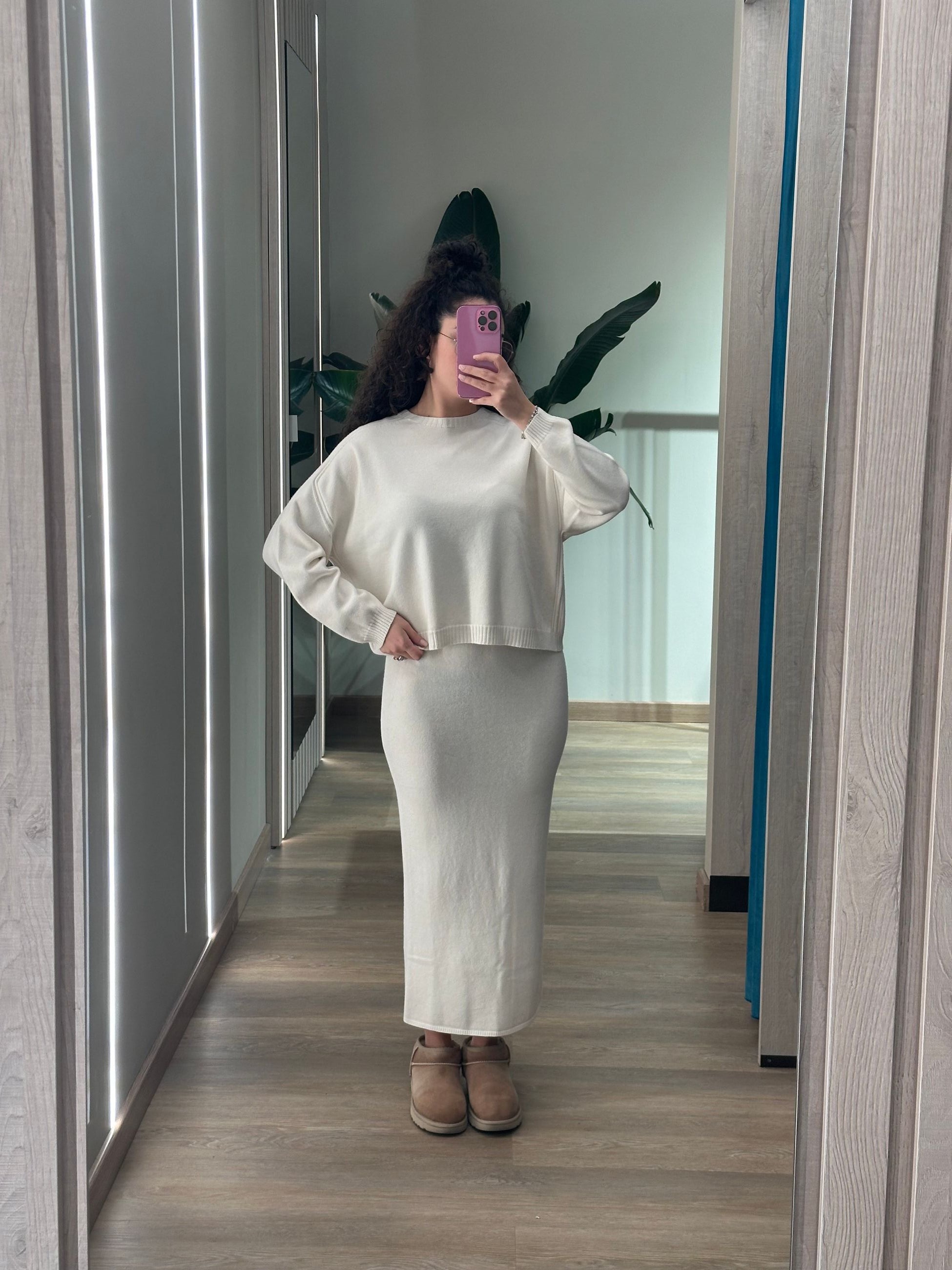 Dal design essenziale e contemporaneo, questa maglia a forma scatola presenta un girocollo classico e cuciture in rilievo che ne valorizzano la struttura. Un capo minimal ma di carattere, perfetto per completare look casual-chic con un tocco sofisticato. la modella è alta 1.73cm