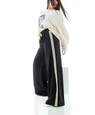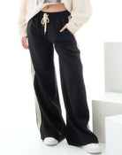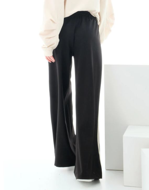 Pantalone donna con bande laterali Un capo aderente e versatile, realizzato in tessuto morbido e confortevole. Dotato di elastico in vita per una vestibilità perfetta, è ideale per look casual o per essere abbinato a capi più eleganti con un tocco contemporaneo.