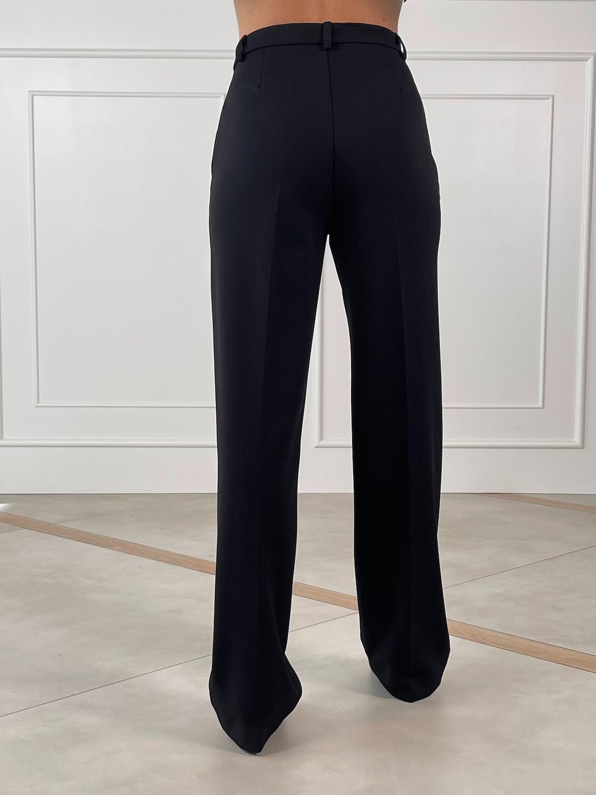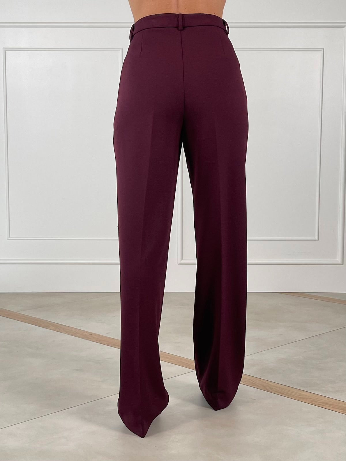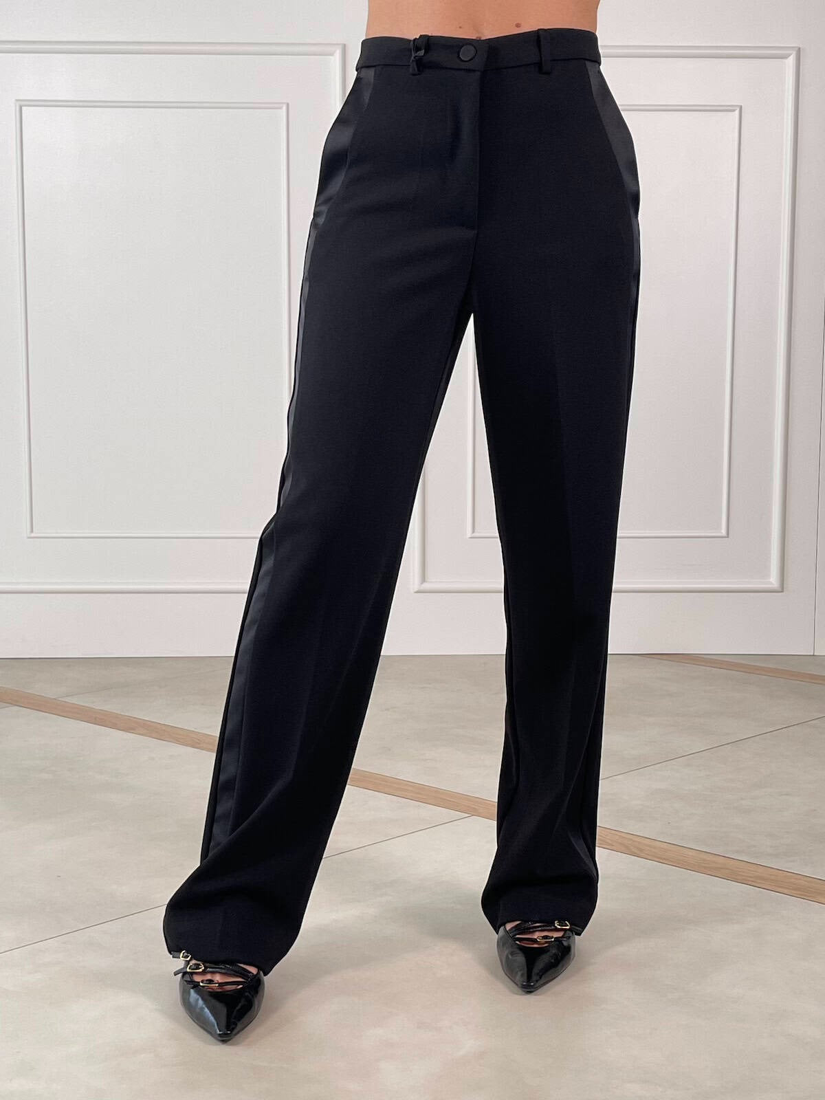 VICOLO Pantalone elegante da donna. Realizzati in tessuto fluido, presentano una vestibilità dritta e gambe larghe che slanciano la figura e garantiscono comfort. La vita a vita media con passanti per cintura e chiusura con bottone e zip assicura una vestibilità classica, mentre la banda laterale in raso tono su tono aggiunge un dettaglio luminoso e raffinato, perfetto per aggiungere un tocco di originalità al design. Questi pantaloni versatili possono essere abbinati a una giacca abbinata per un outfit audace, oppure a bluse e camicie per outfit più moderni e femminili. La modella indossa una taglia S ed è alta 170 cm. Si consiglia una stiratura a fuoco medio. Stagione autunno/inverno.