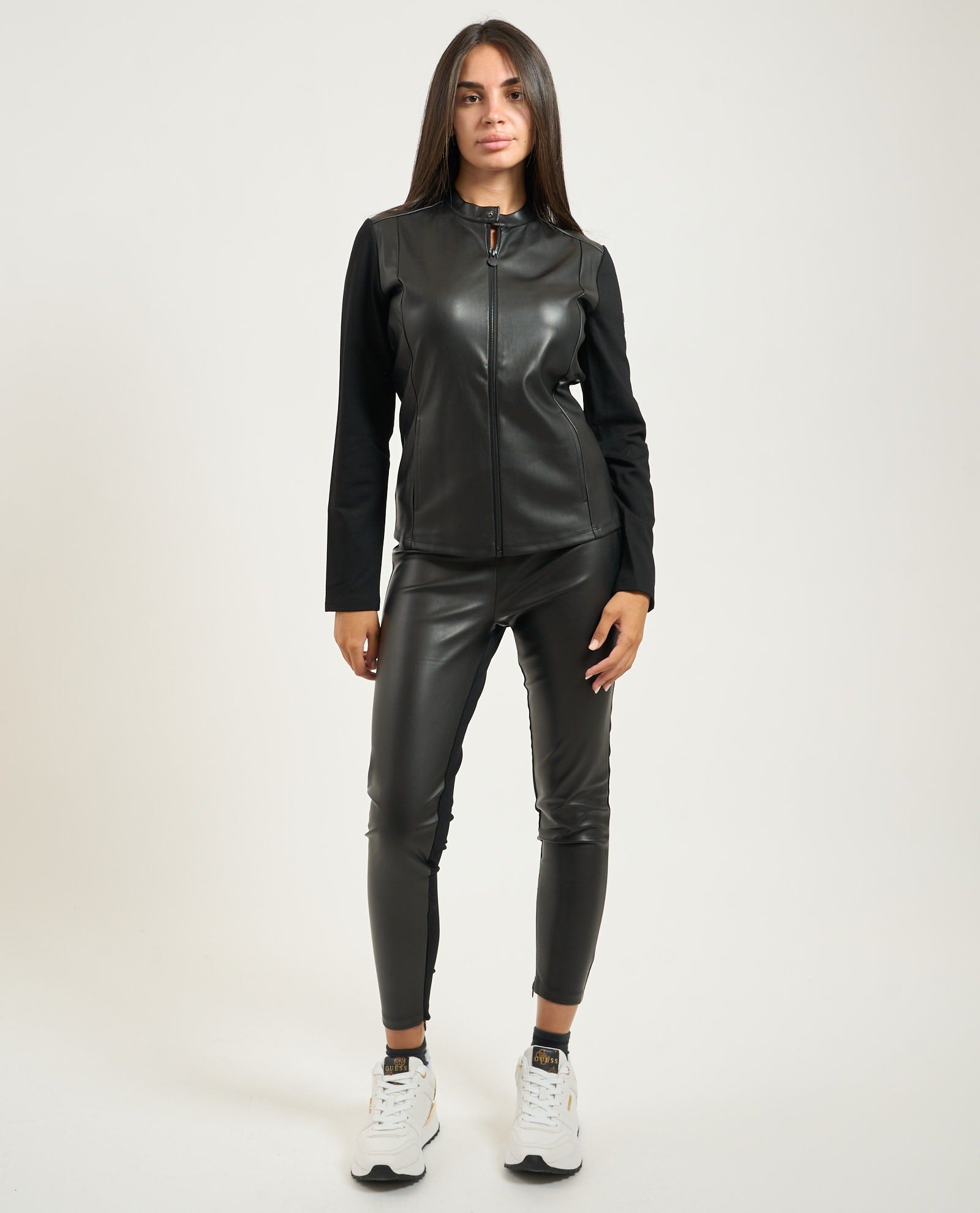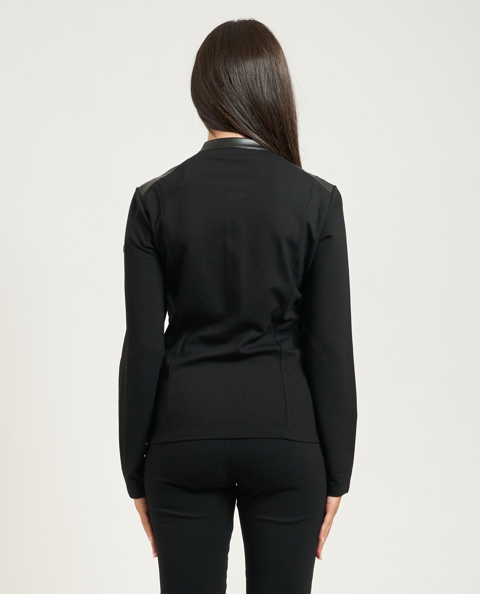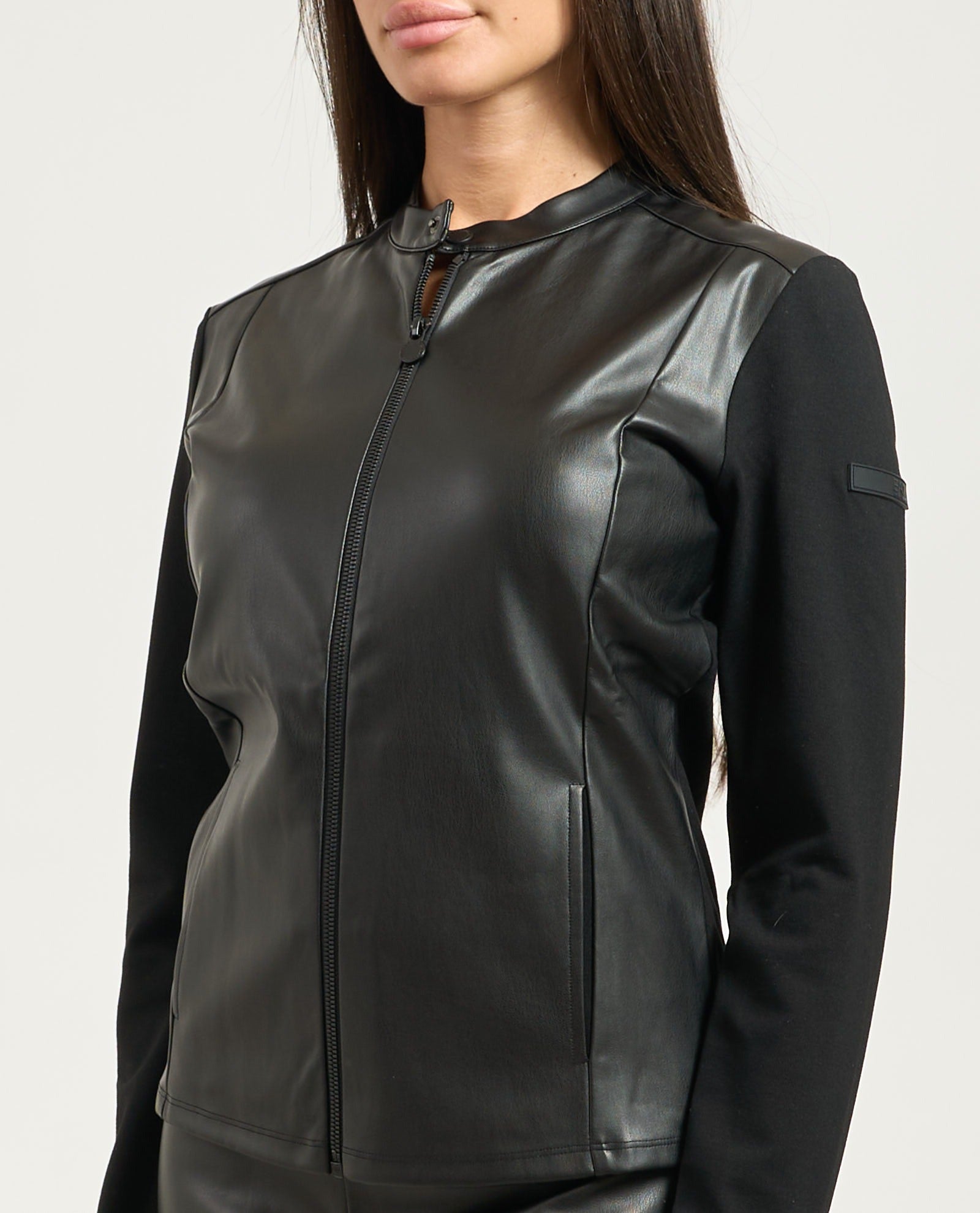 Felpa donna fullzip realizzata in misto viscosa stretch e in tessuto effetto pelle. Collo a listino con bottone, due tasche laterali, patch gommata in tono sulla manica sinistra.