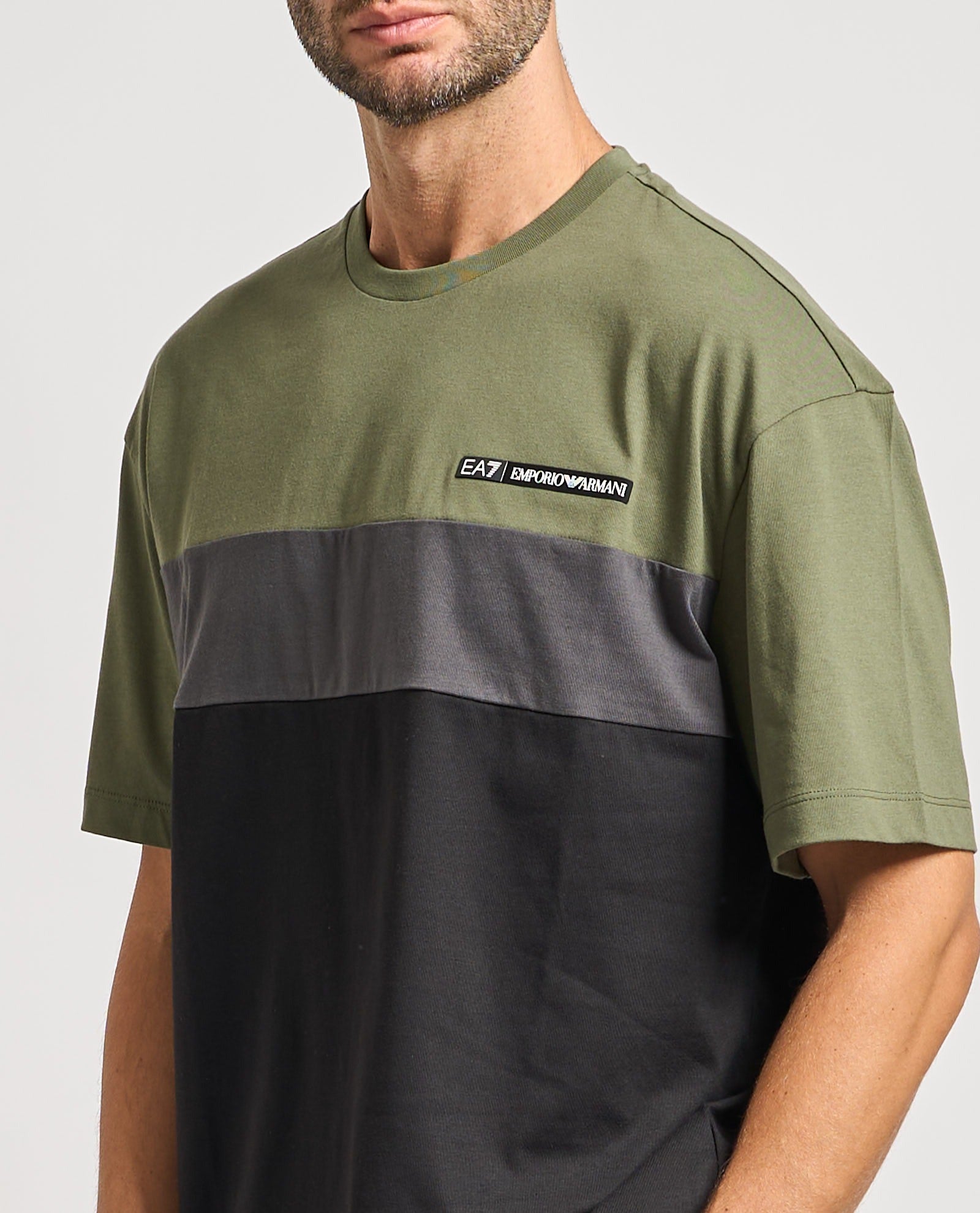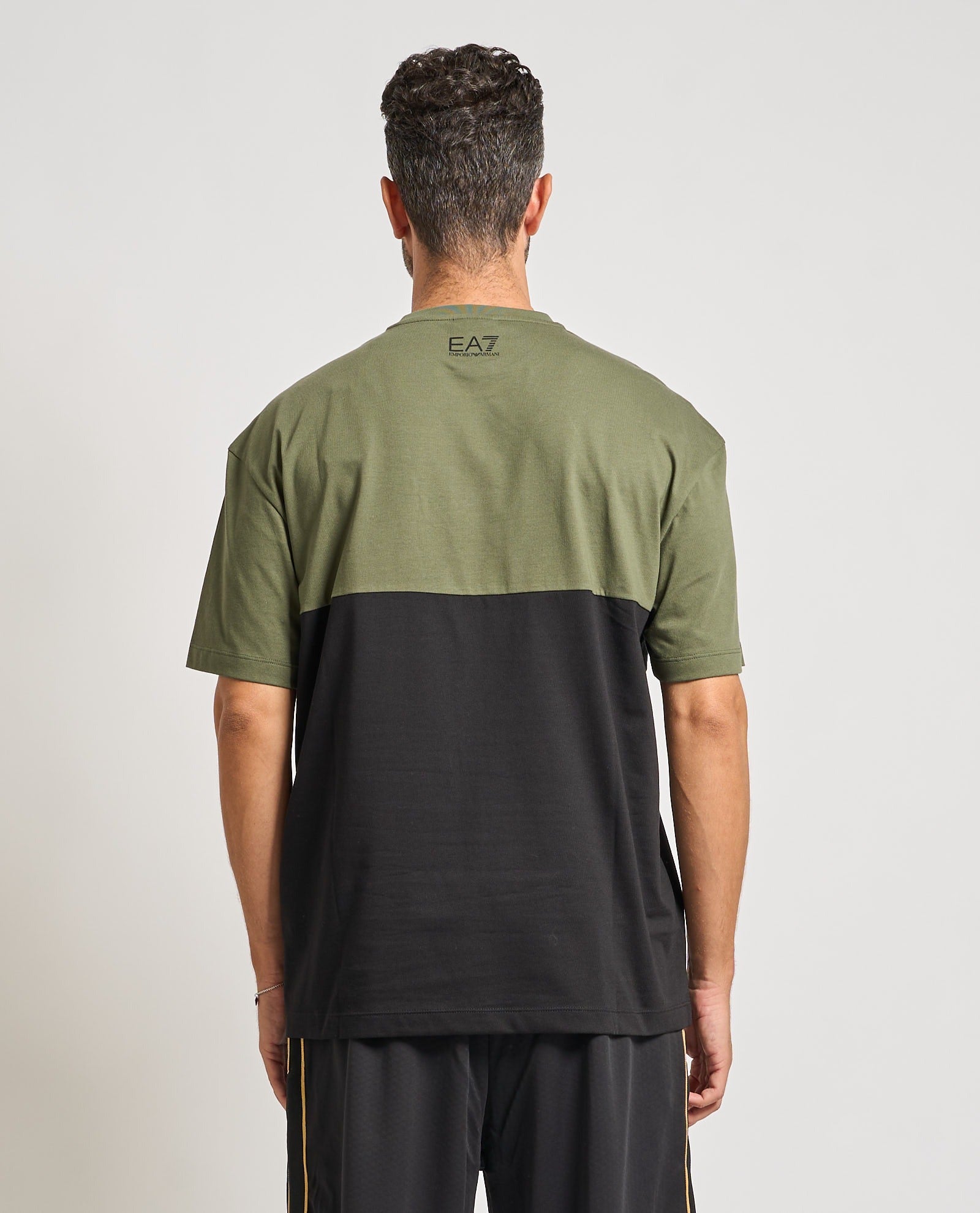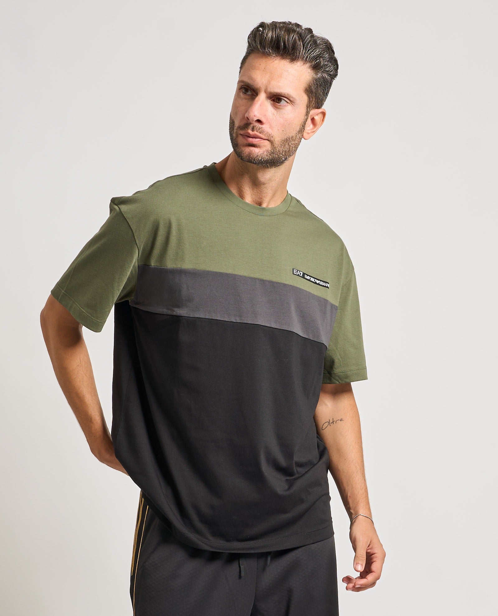 Armani EA7 T-shirt Girocollo Athletic Colour Block in Misto Cotone Verde Nero