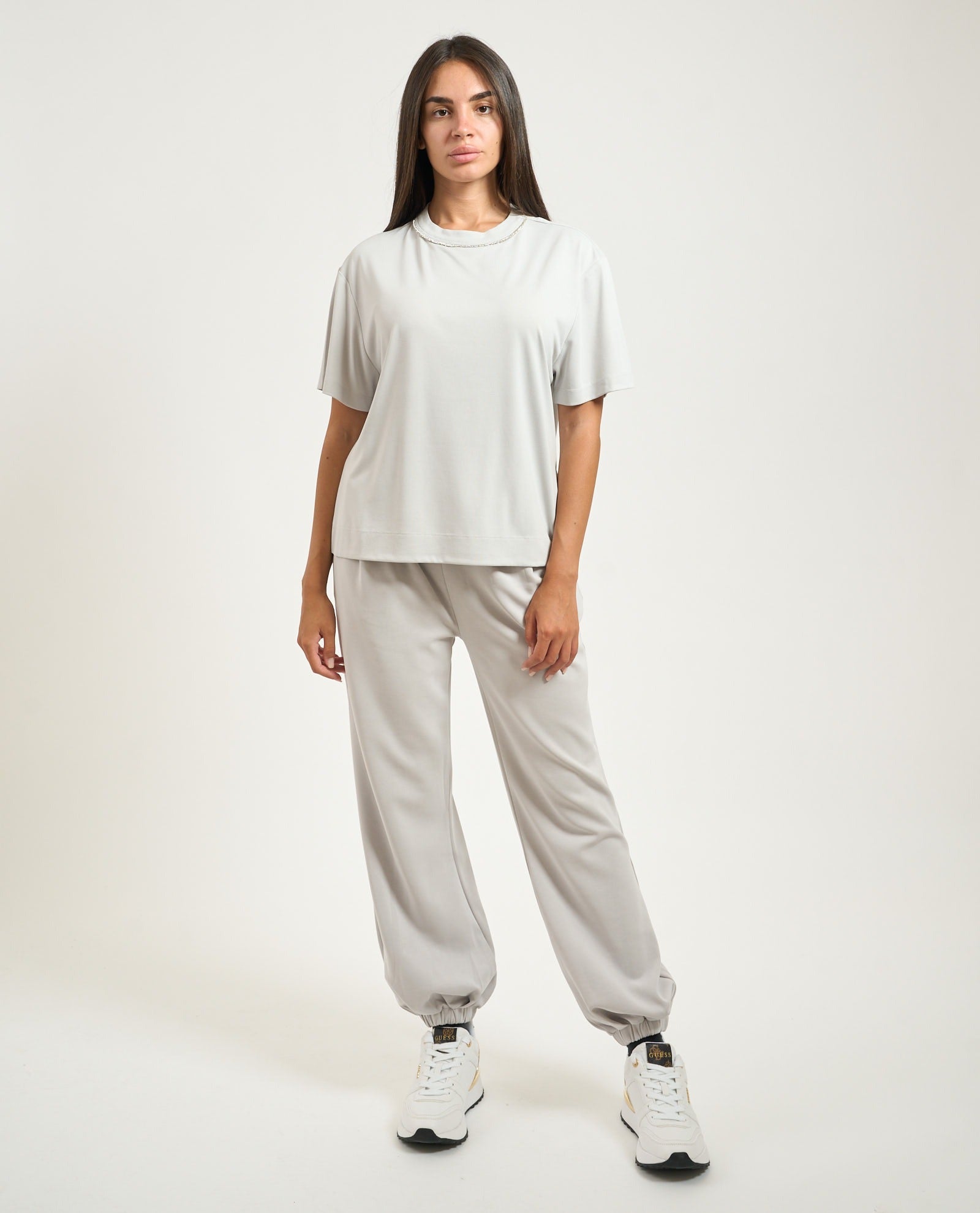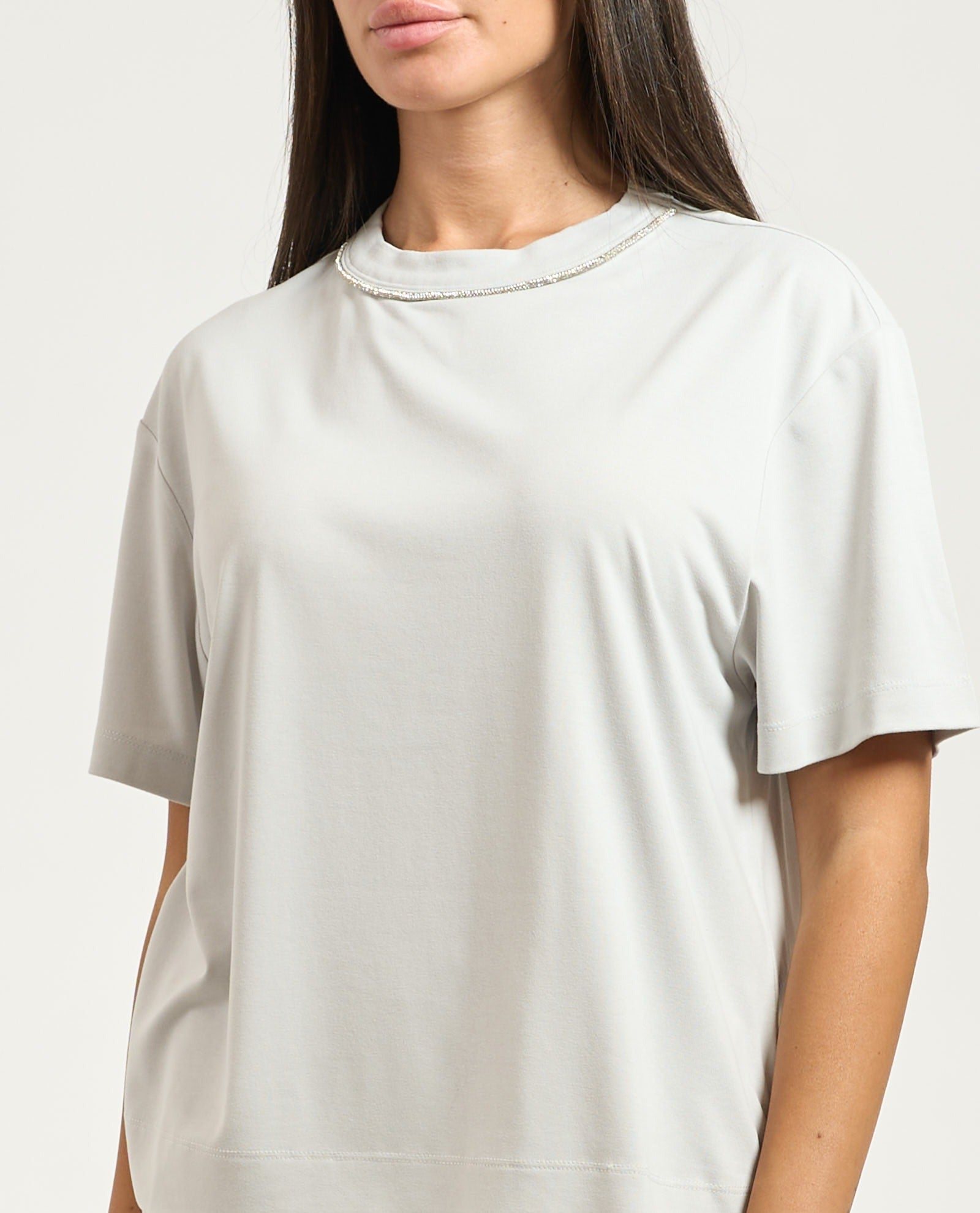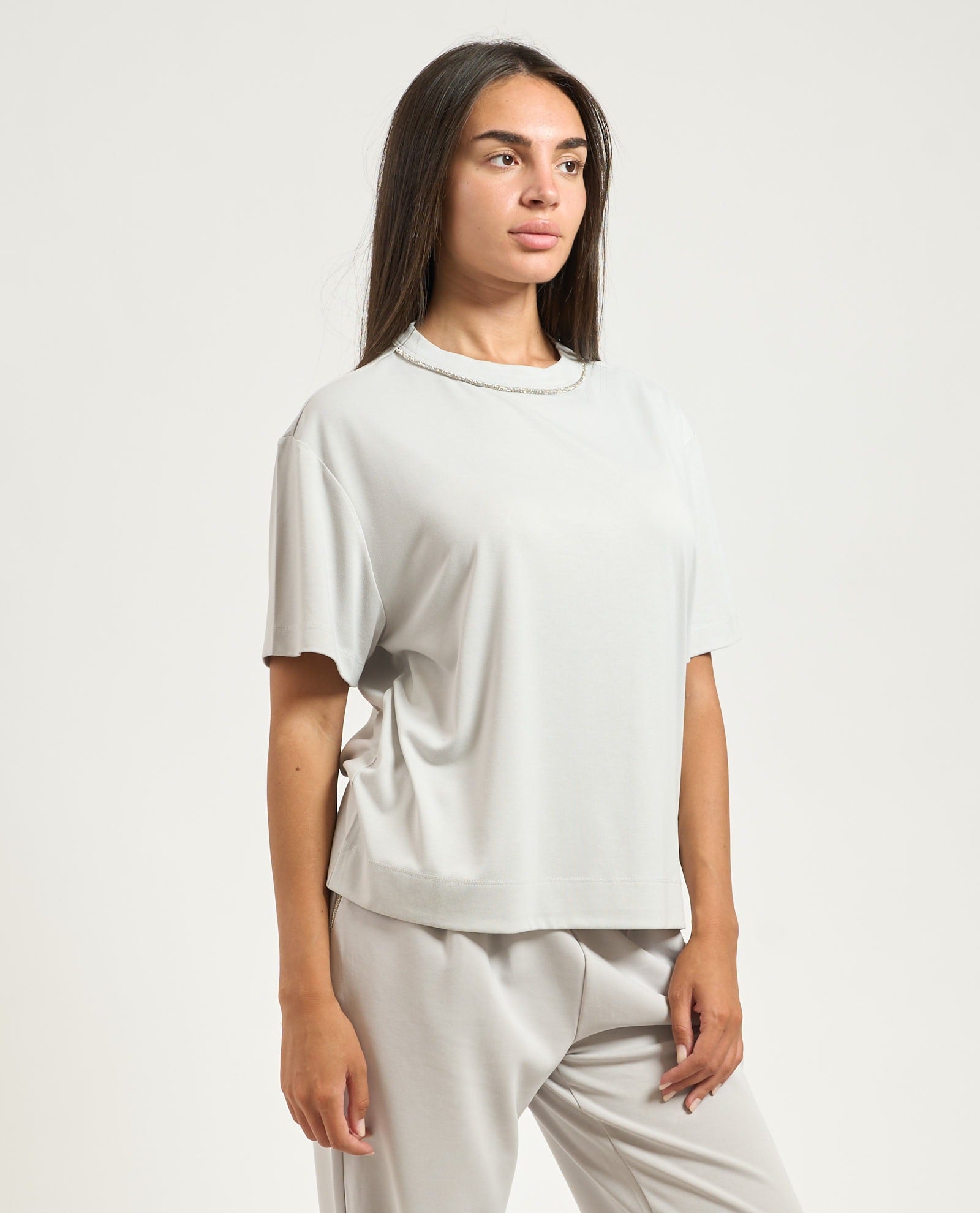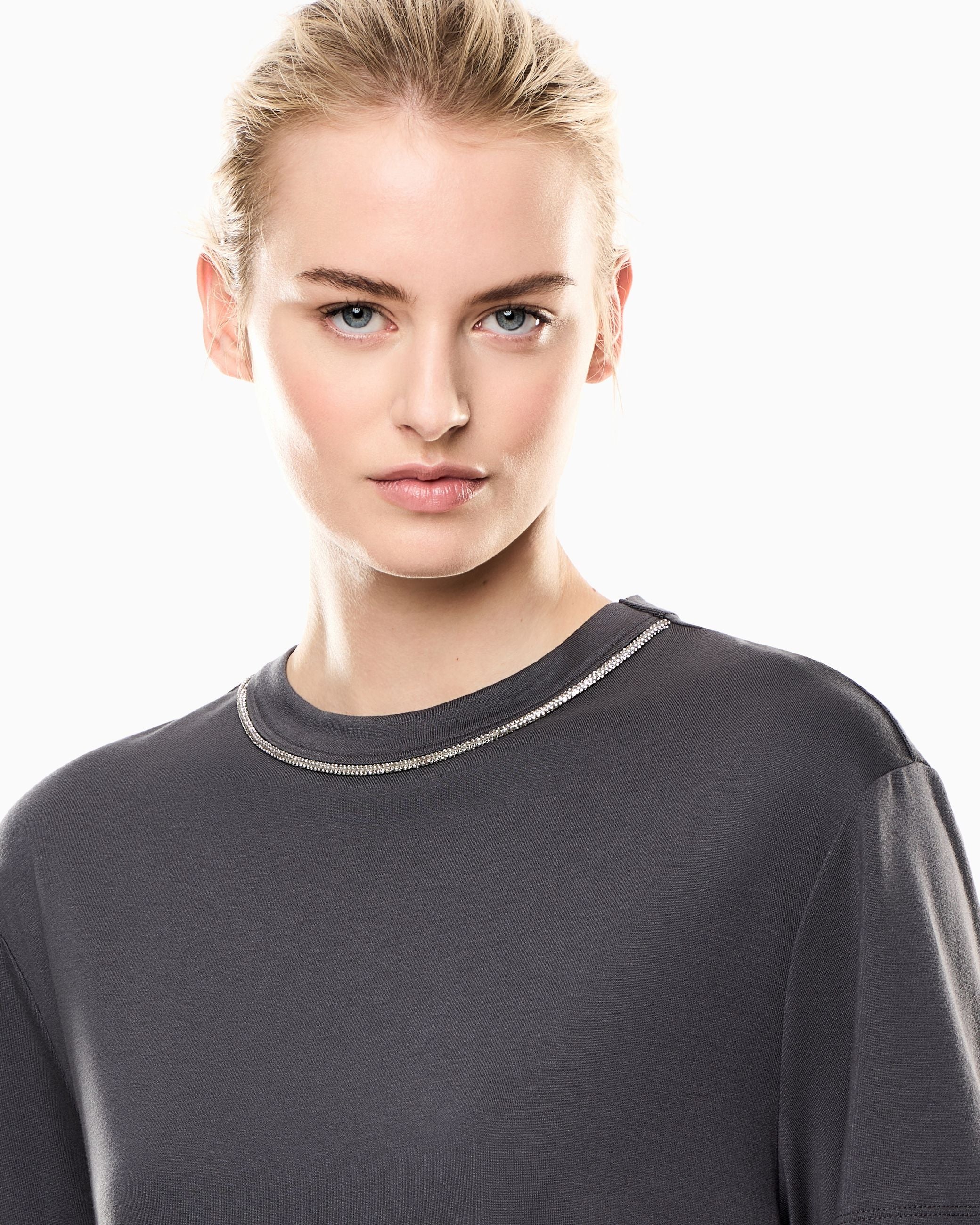 T-shirt donna Stile confortevole e rilassato per questa t-shirt girocollo a maniche corte realizzata in misto viscosa, un tessuto dalla mano morbida e setosa. Il modello si distingue per i dettagli in strass che profilano il collo, donando al capo un tocco di luce. Logo dal finish metallizzato sul retro. Il modello appartiene alla linea Precious, una selezione di capi pensati per accompagnare momenti di relax con stile e comfort.