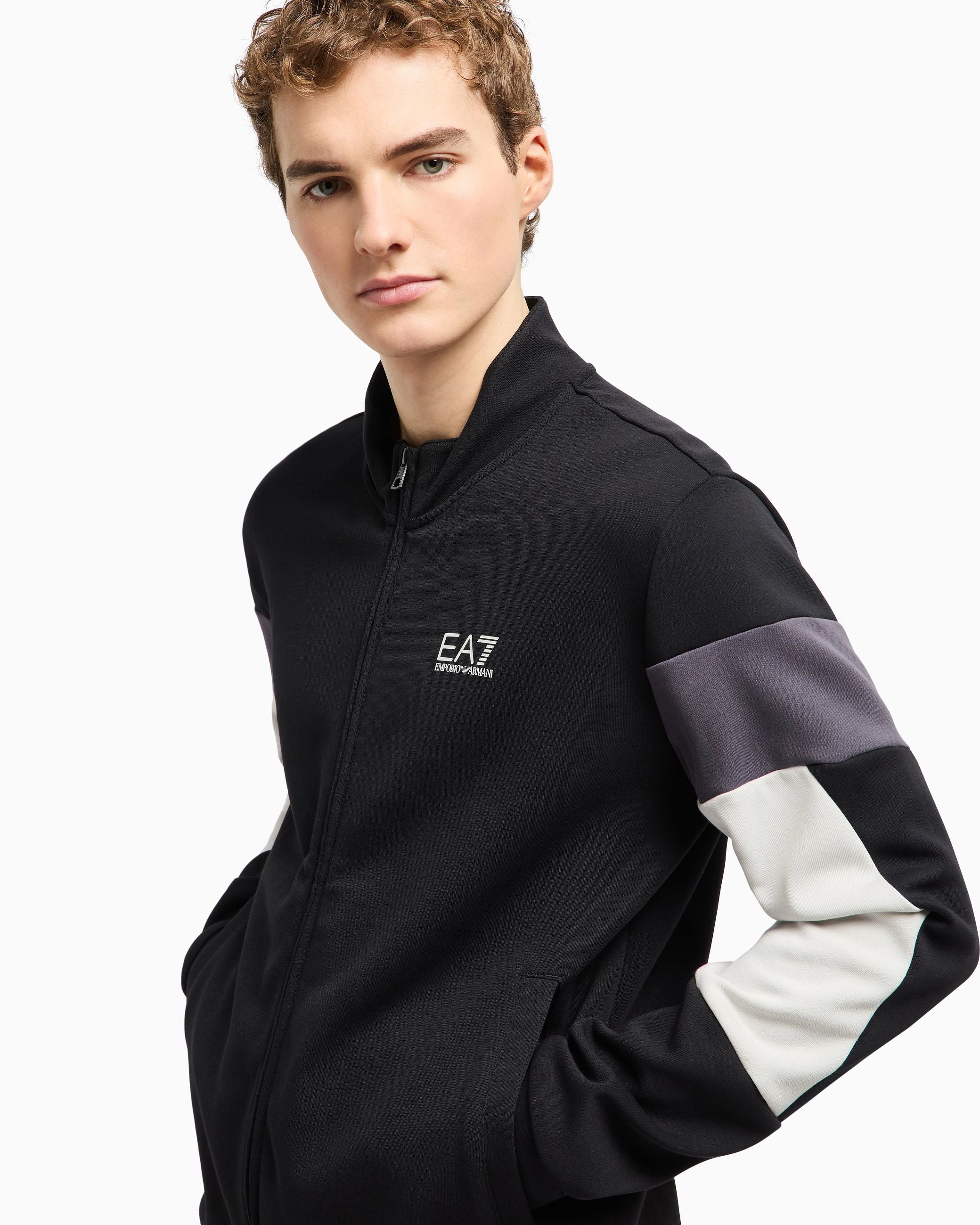 Linee semplici e giochi di colore caratterizzano questa tuta realizzata in misto cotone. Il modello si compone di una felpa con collo montante e chiusura con zip, e un pantalone con vita elastica e due tasche laterali. I contrasti cromatici e il logo EA7 che personalizza entrambi i capi, rendono questa creazione unica e adatta sia per momenti di sport che per il tempo libero.