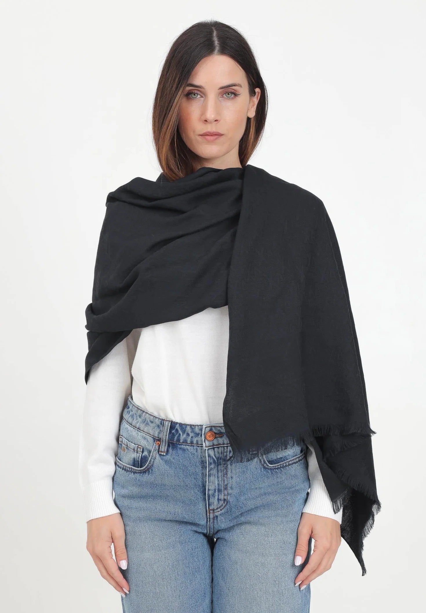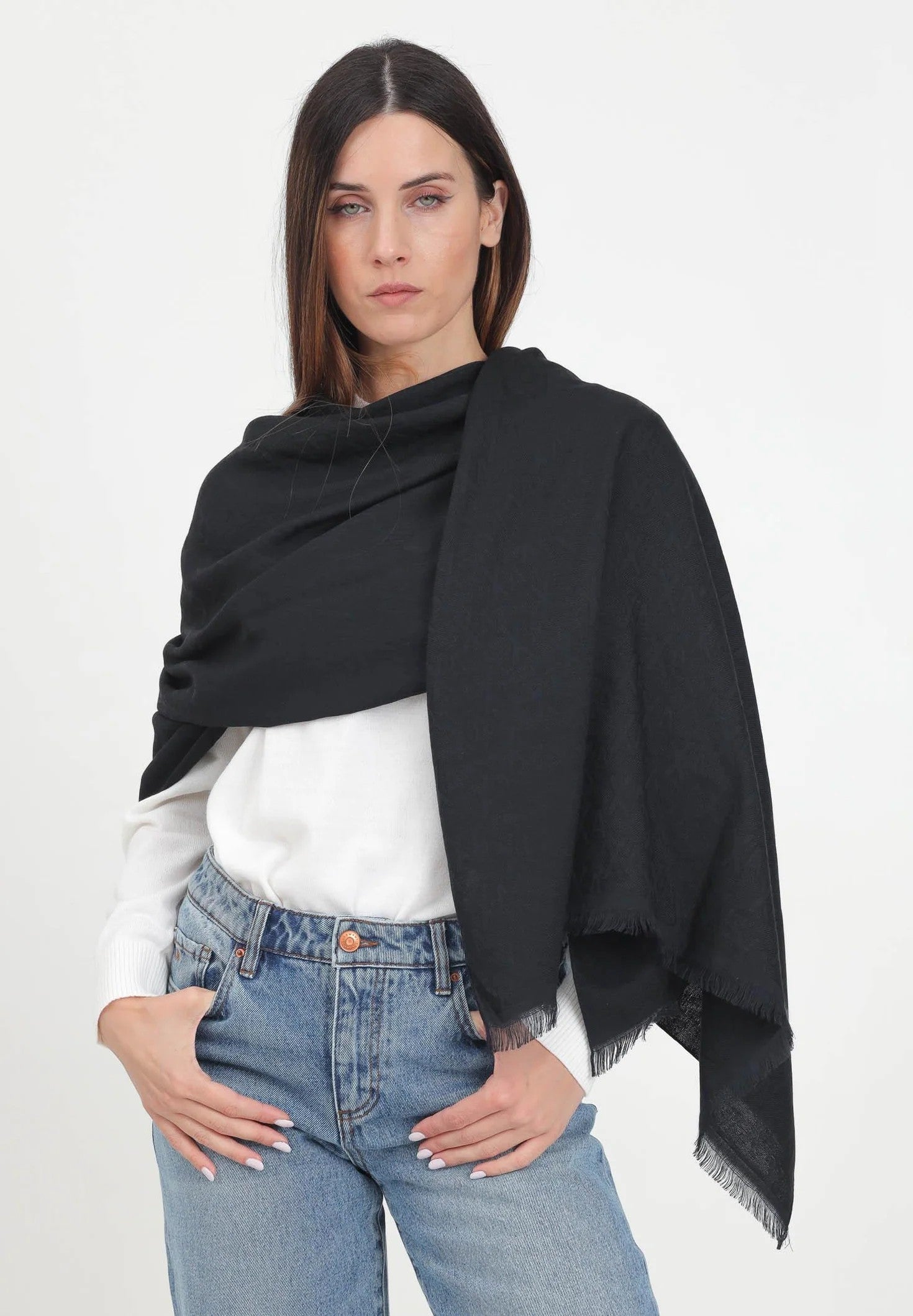 Sciarpa nera da donna con logo AX tono su tono all-over. Il capo presenta orli sfrangiati. Si consiglia una stiratura a media temperatura. Stagione autunno inverno.