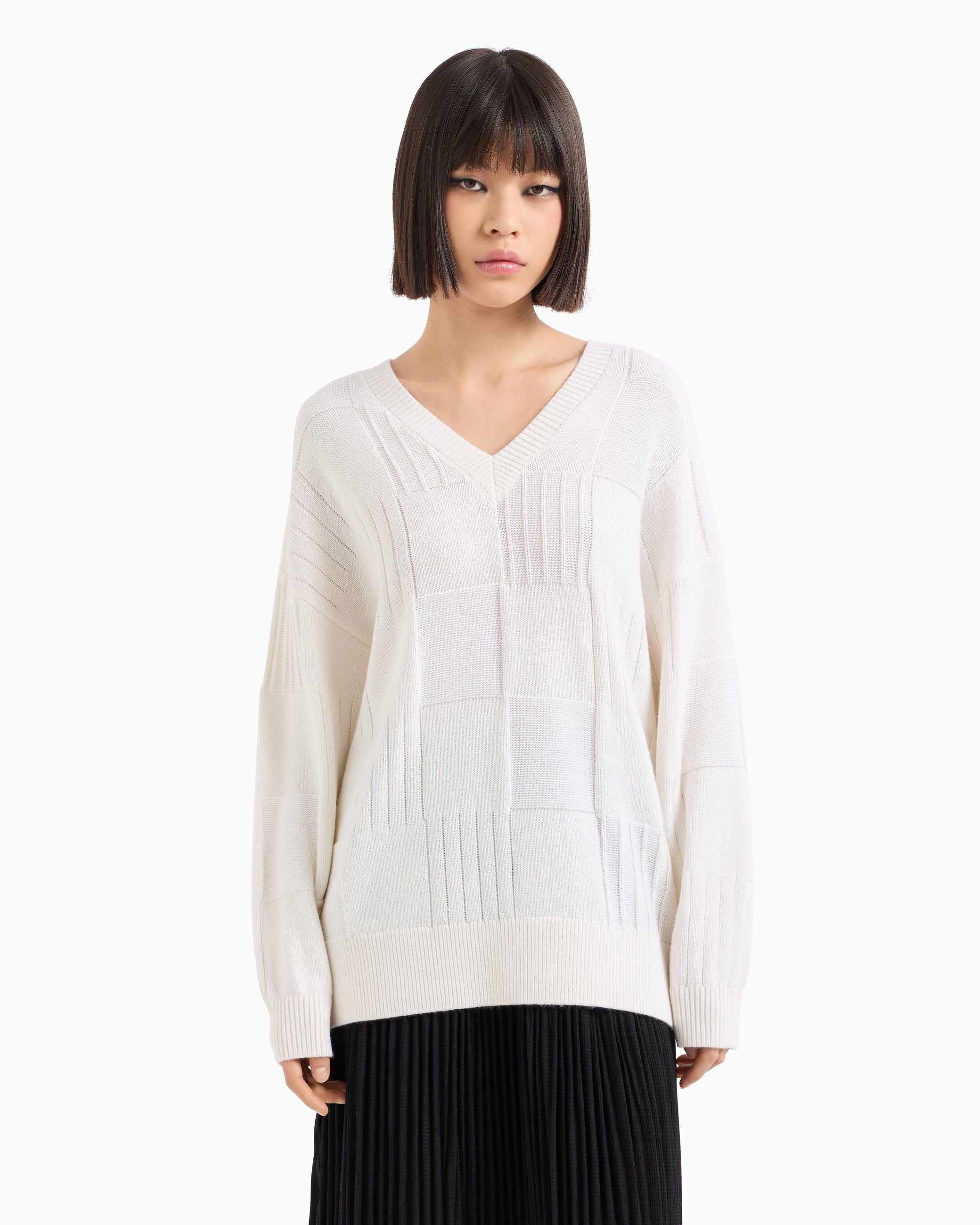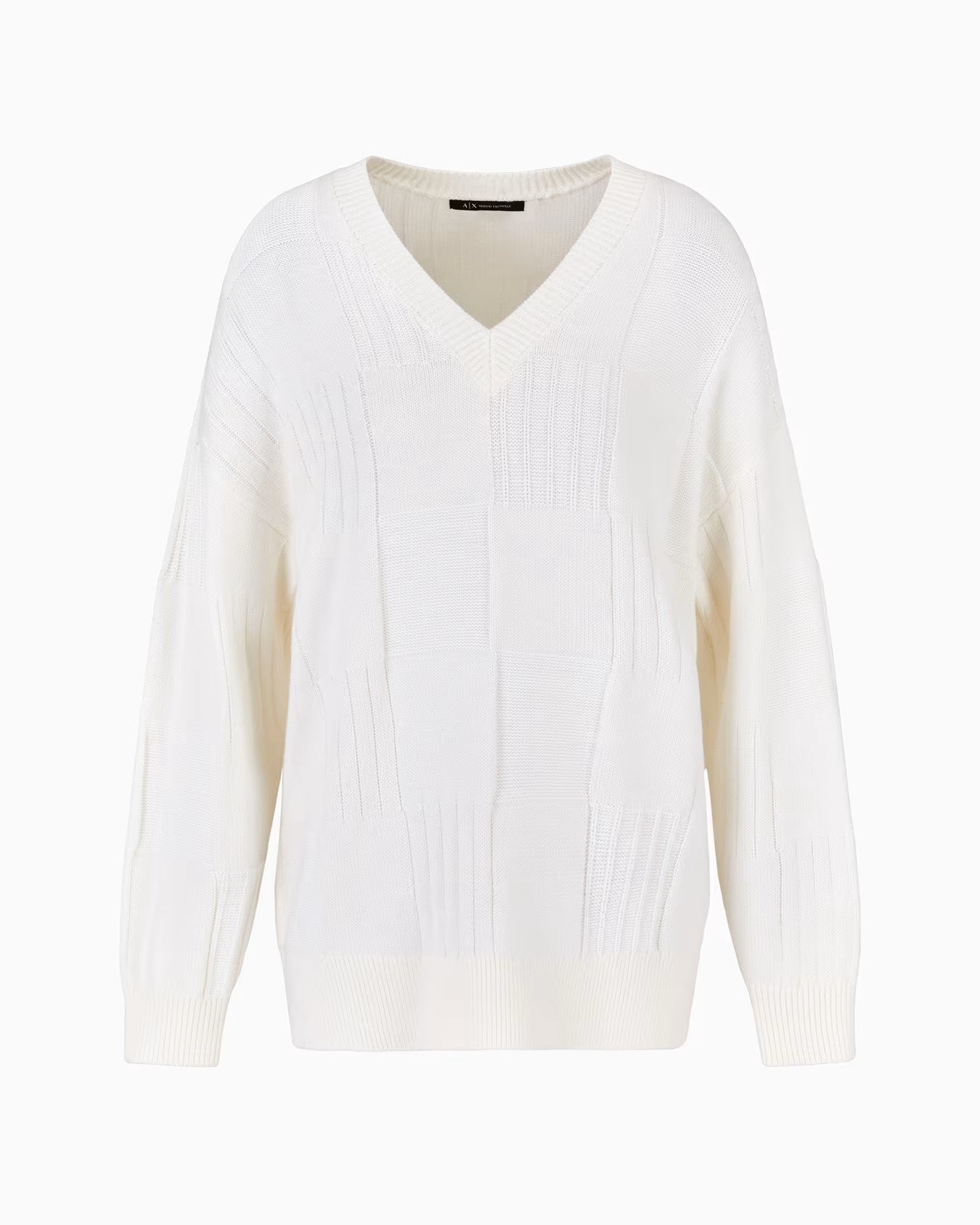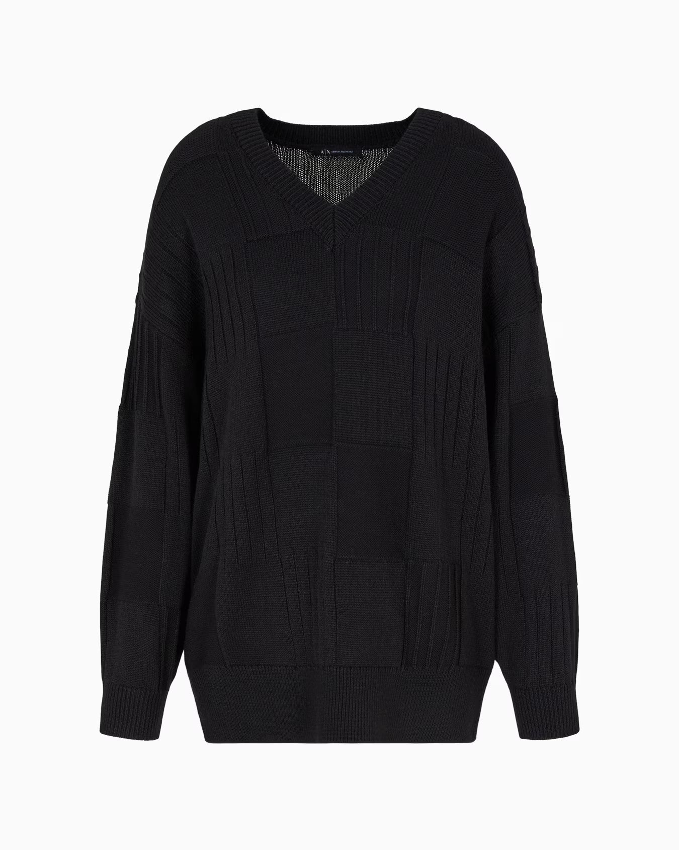 Maglione con scollo a V realizzato in filato di qualità con lavorazione a quadri alternati. Questo capo fa parte della selezione ASV perché il tessuto è realizzato con materiale sostenibile o riciclato certificato: un modello che unisce lo stile A|X con l'impegno del brand verso una sempre più alta attenzione.