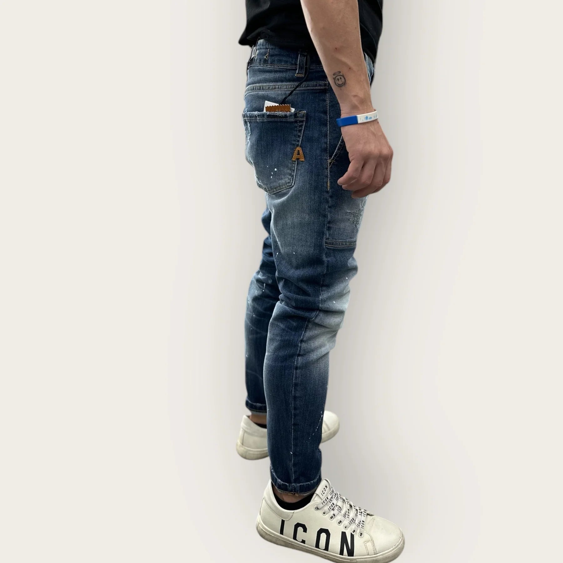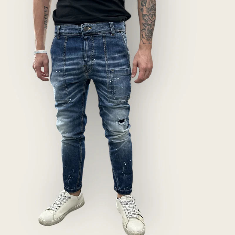 Jeans uomo con tasche applicate chiusura con bottoni passanti per cintura piccoli strappi e striature