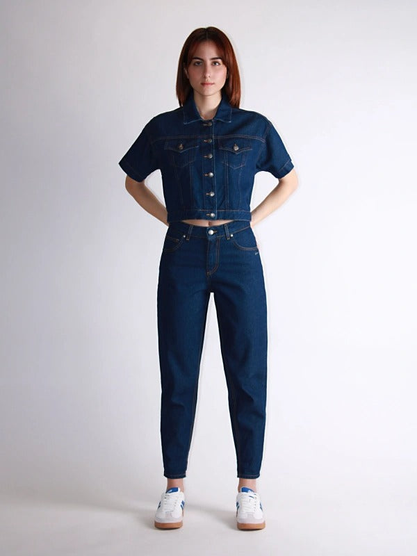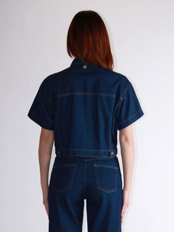 Giacca donna in denim a maniche corte in puro cotone con impunture a contrasto lavaggio scuro.