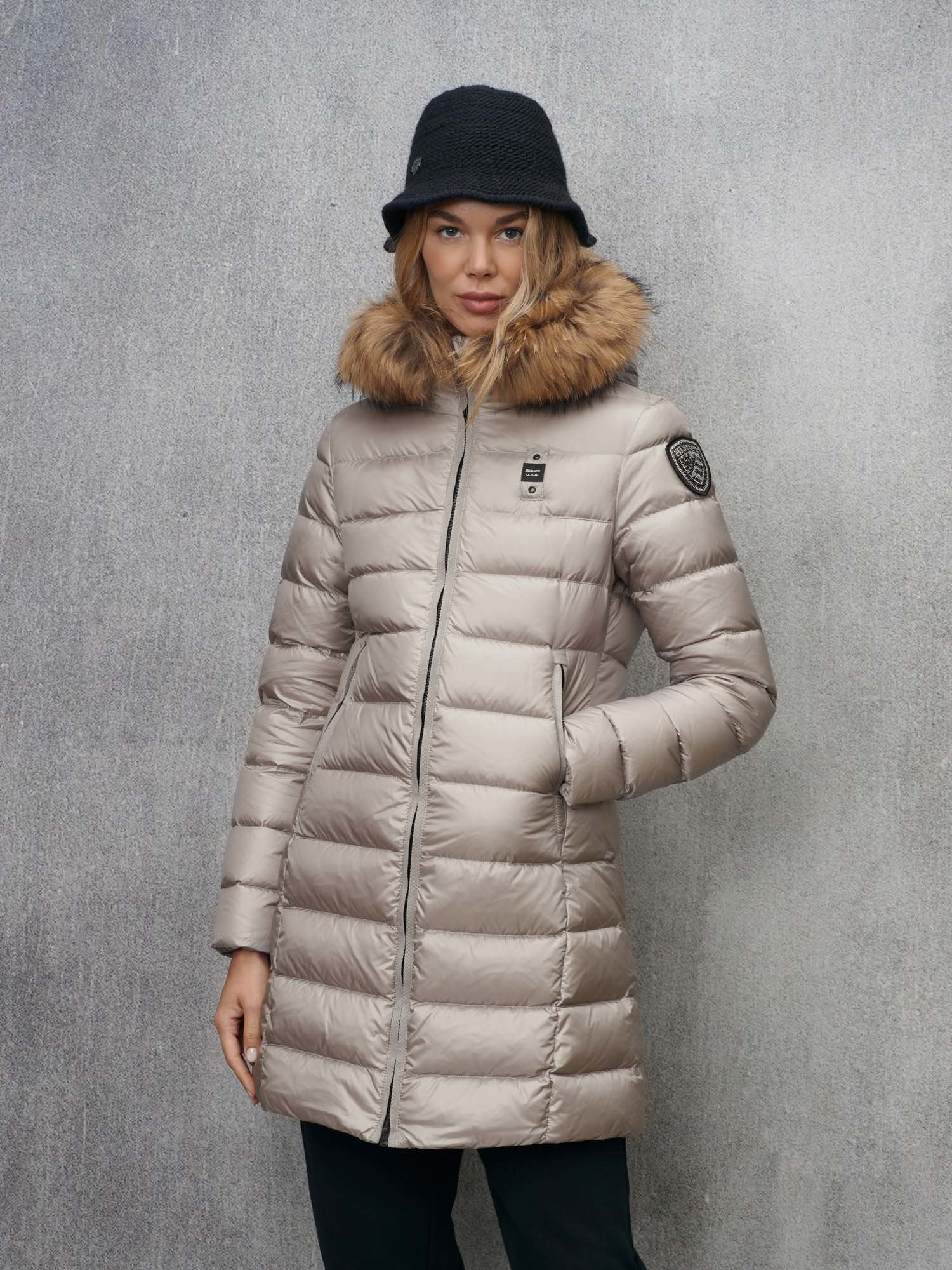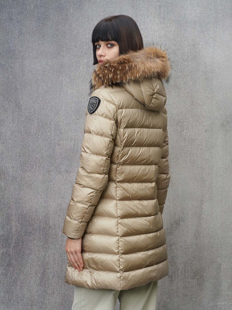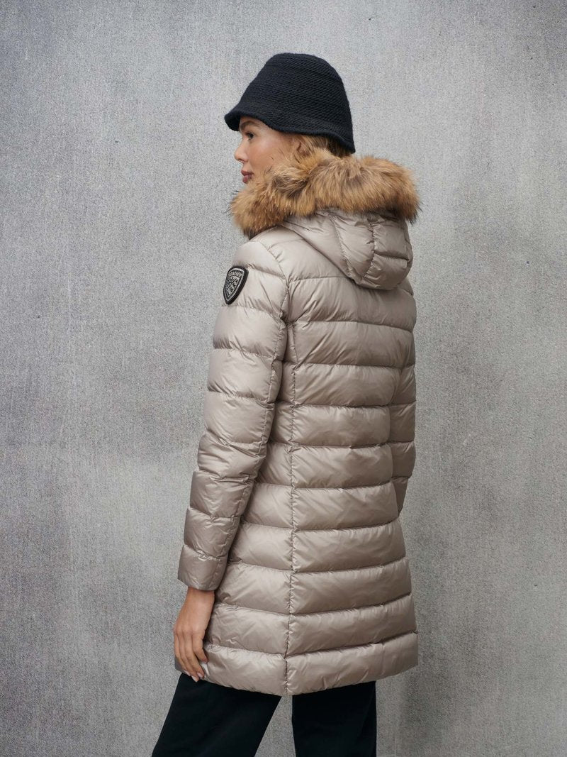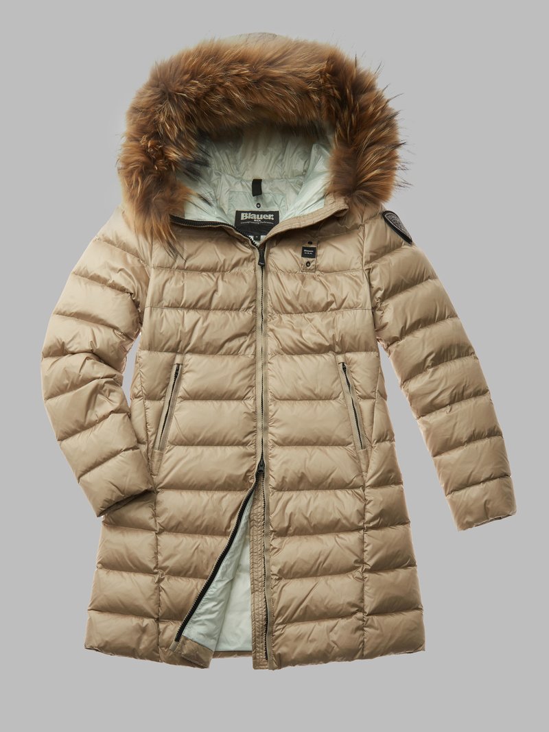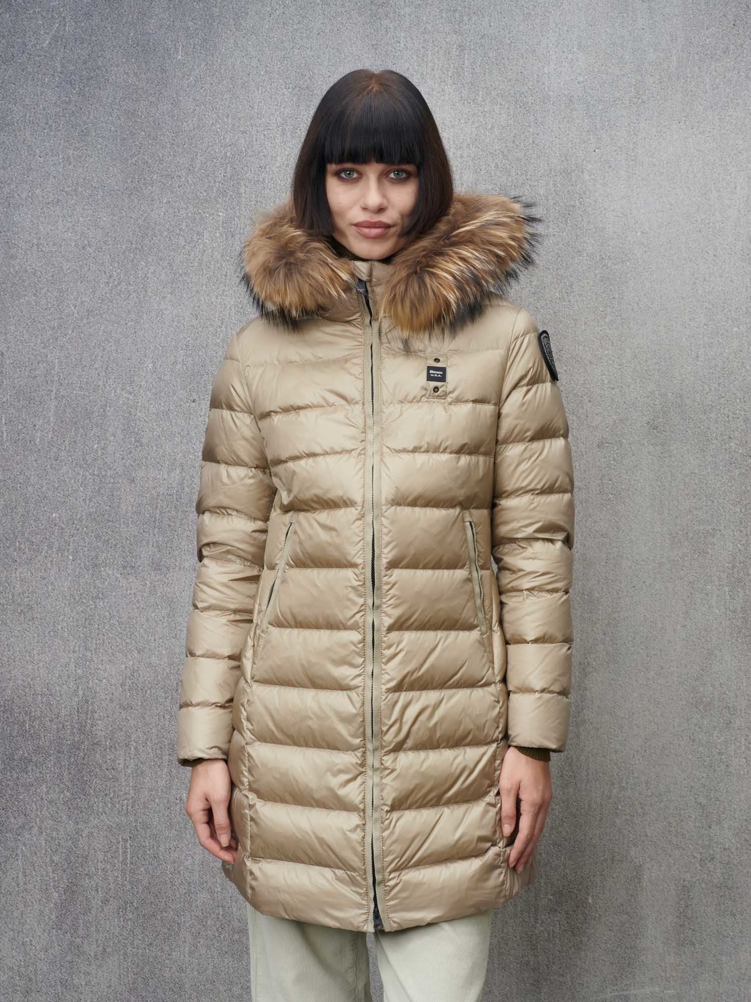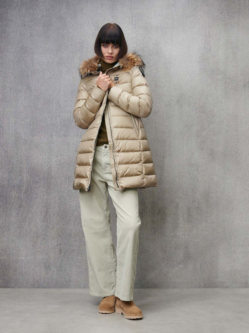 Piumino lungo idrorepellente trapuntato a righe orizzontali, bordo in pelliccia removibile ed interno in contrasto colore. Capo con colori fashion e dal taglio che risalta il punto vita.