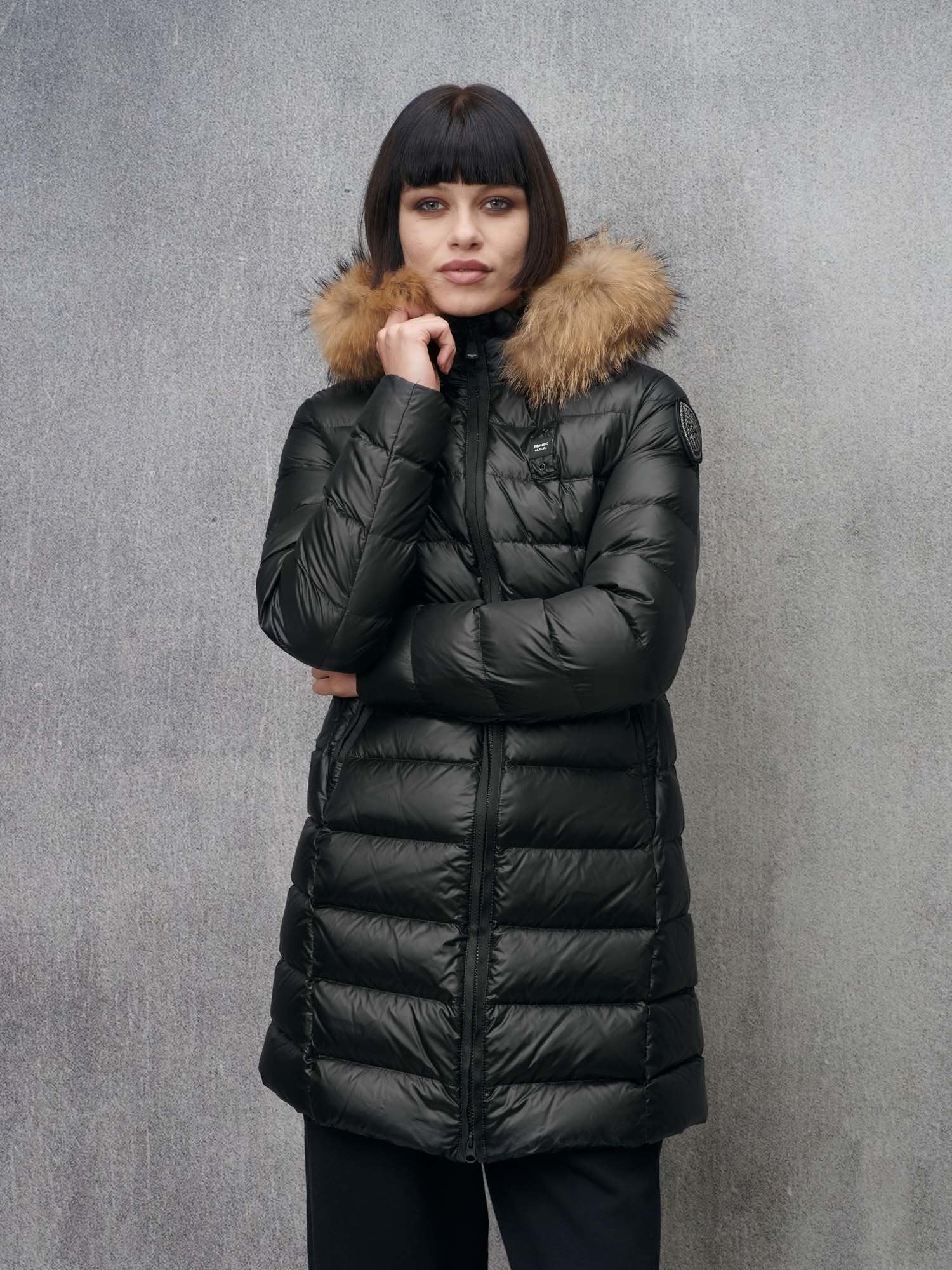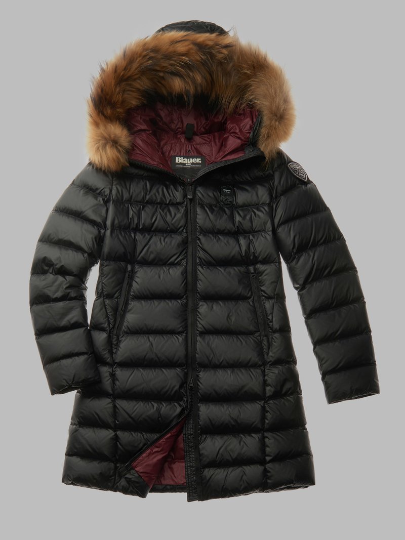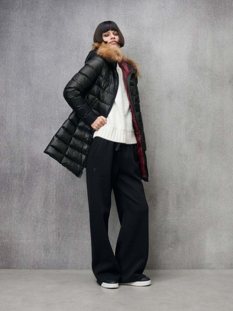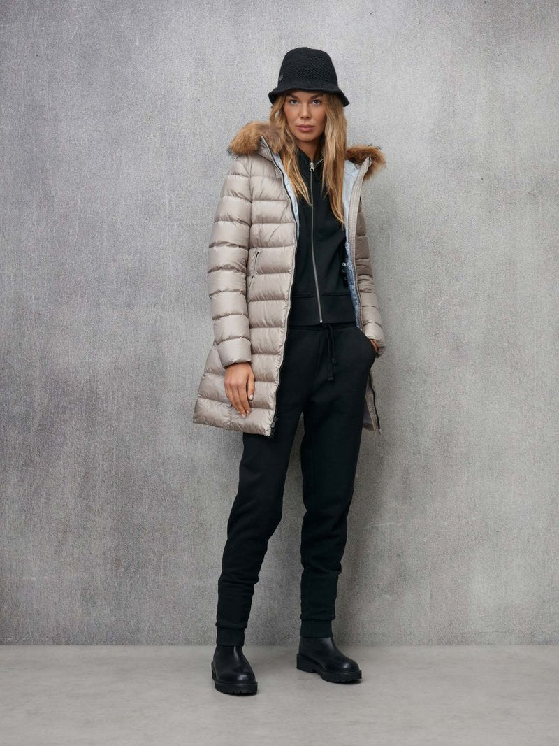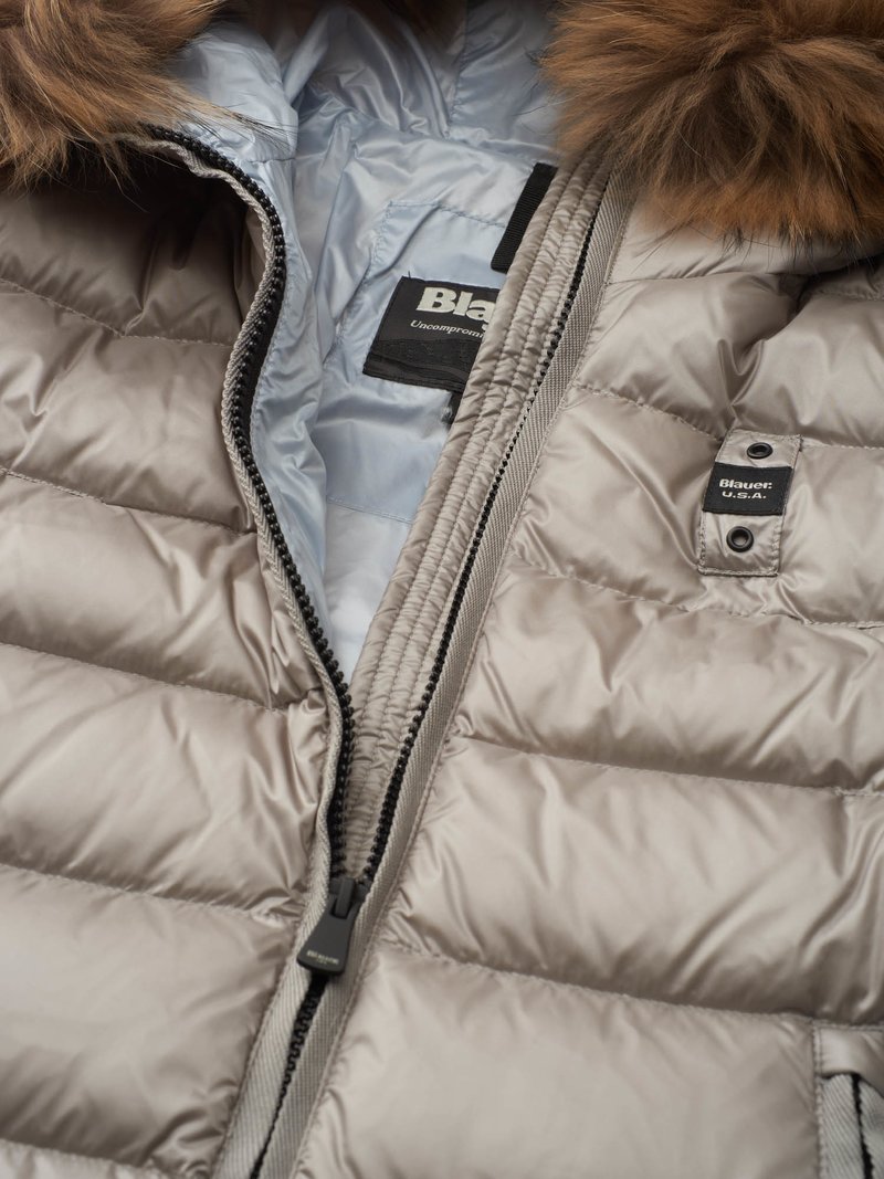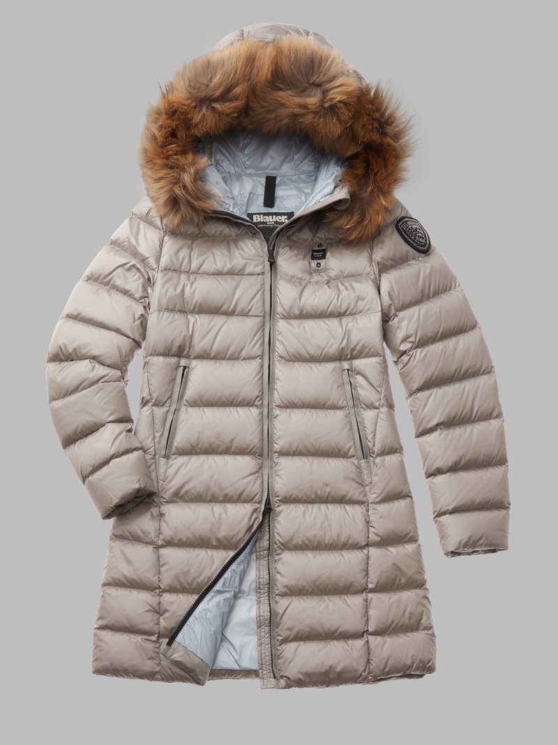 Piumino lungo idrorepellente trapuntato a righe orizzontali, bordo in pelliccia removibile ed interno in contrasto colore. Capo con colori fashion e dal taglio che risalta il punto vita.