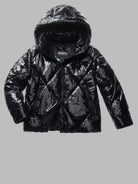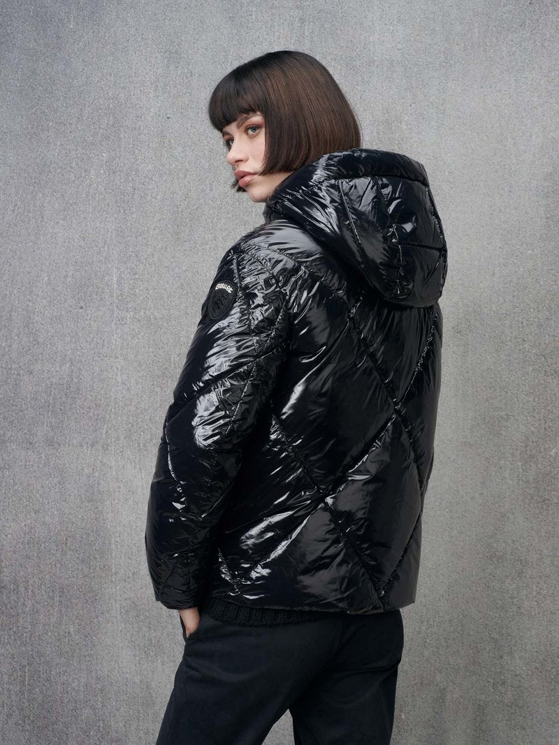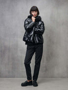 Giubbetto invernale simil laccato ed idrorepellente con colletto alto fisso. Tessuto lucido e colore solido per un capo versatile e resistente.