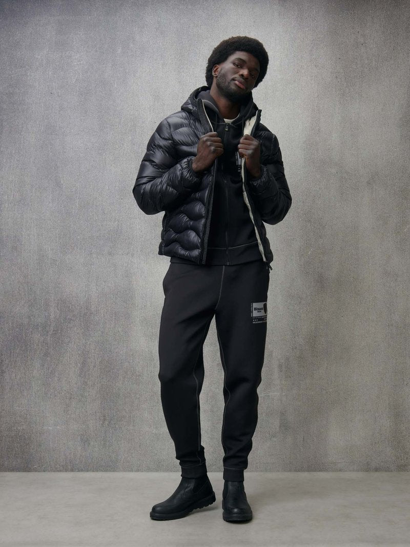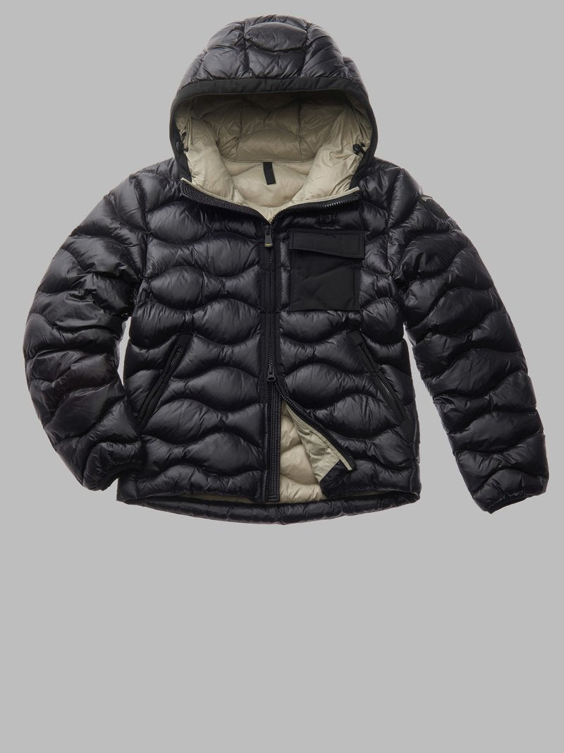 Inserti in taslan in tono sul profilo del cappuccio e delle zip e nel taschino applicato sul petto.