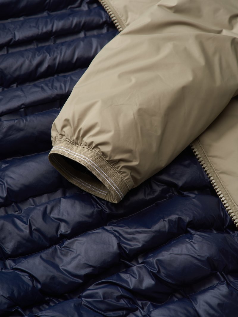Giubbetto reversibile liscio da una parte e con cuciture nastrate a righe orizzontale dall’altra. imbottitura sostenibile ottenuta dal riciclo di bottiglie di plastica. Capo con due versioni e due colori per offrire versatilità e alternativa per le diverse occasioni.
