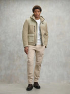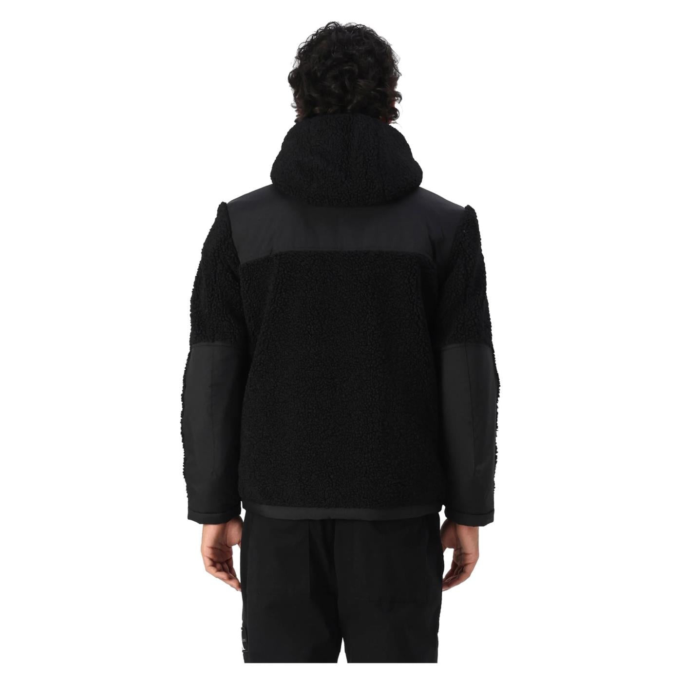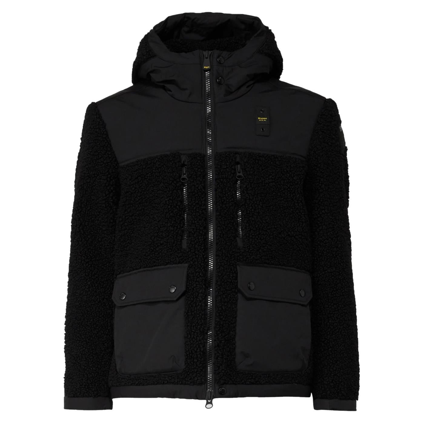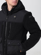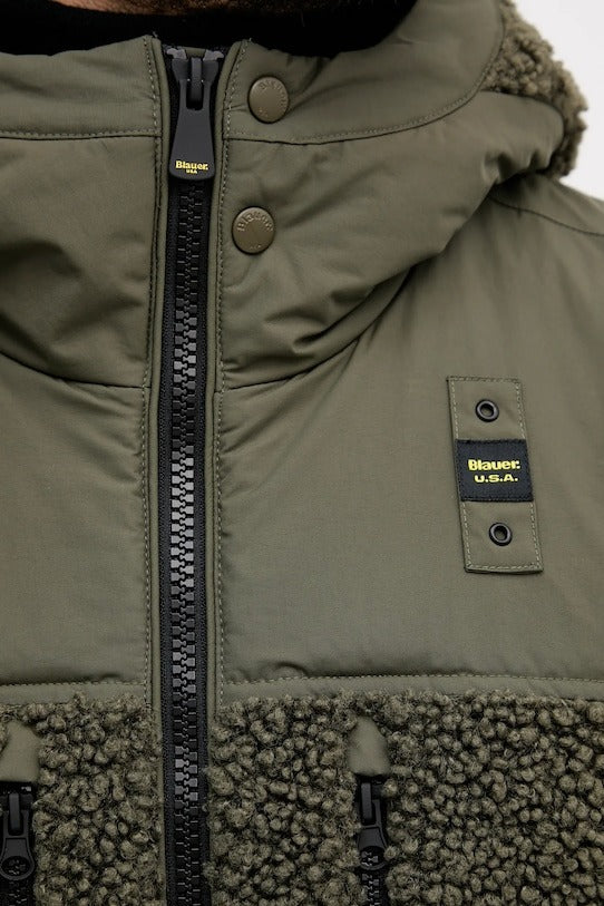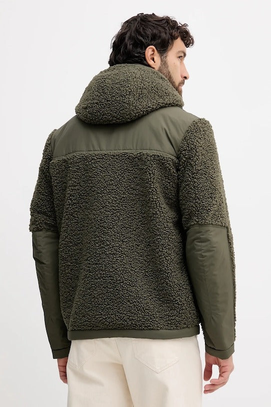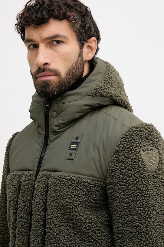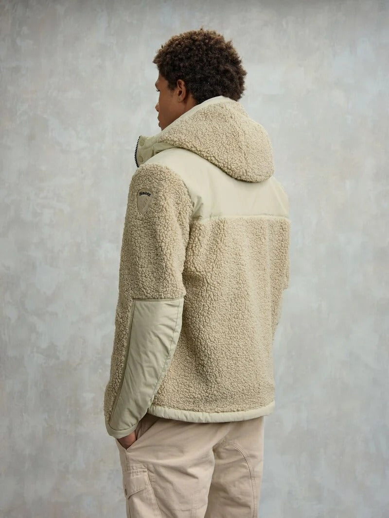 Giubbino uomo cappuccio in montone ecologico con dettagli in taslan. Capo casual, facile da coordinare e pratico da indossare.