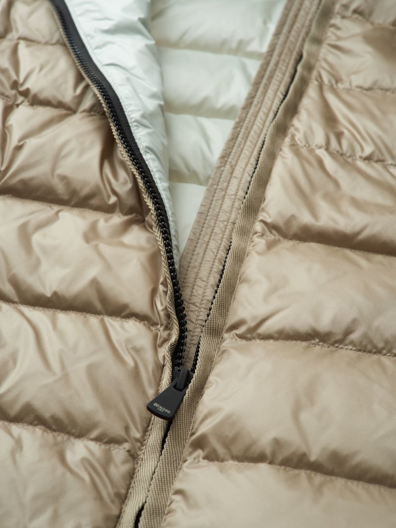 Piumino idrorepellente trapuntato a righe orizzontali. Capo con imbottitura leggera, calda e non ingombrante, dai colori fashion e dal taglio che risalta il punto vita.