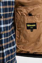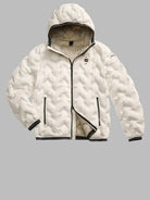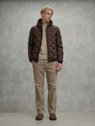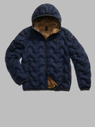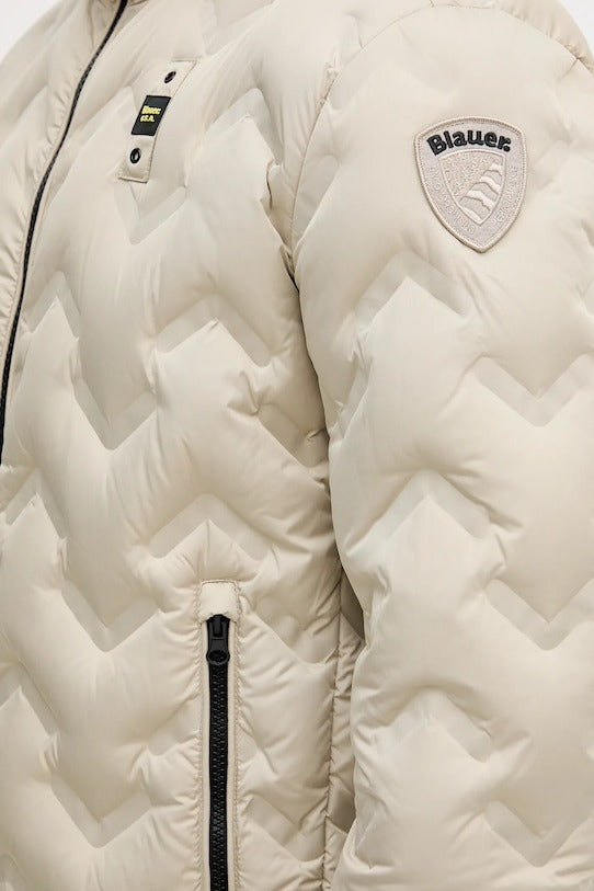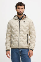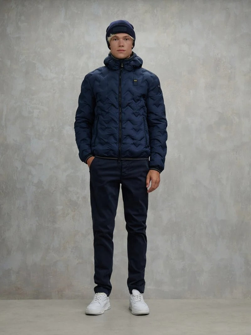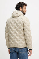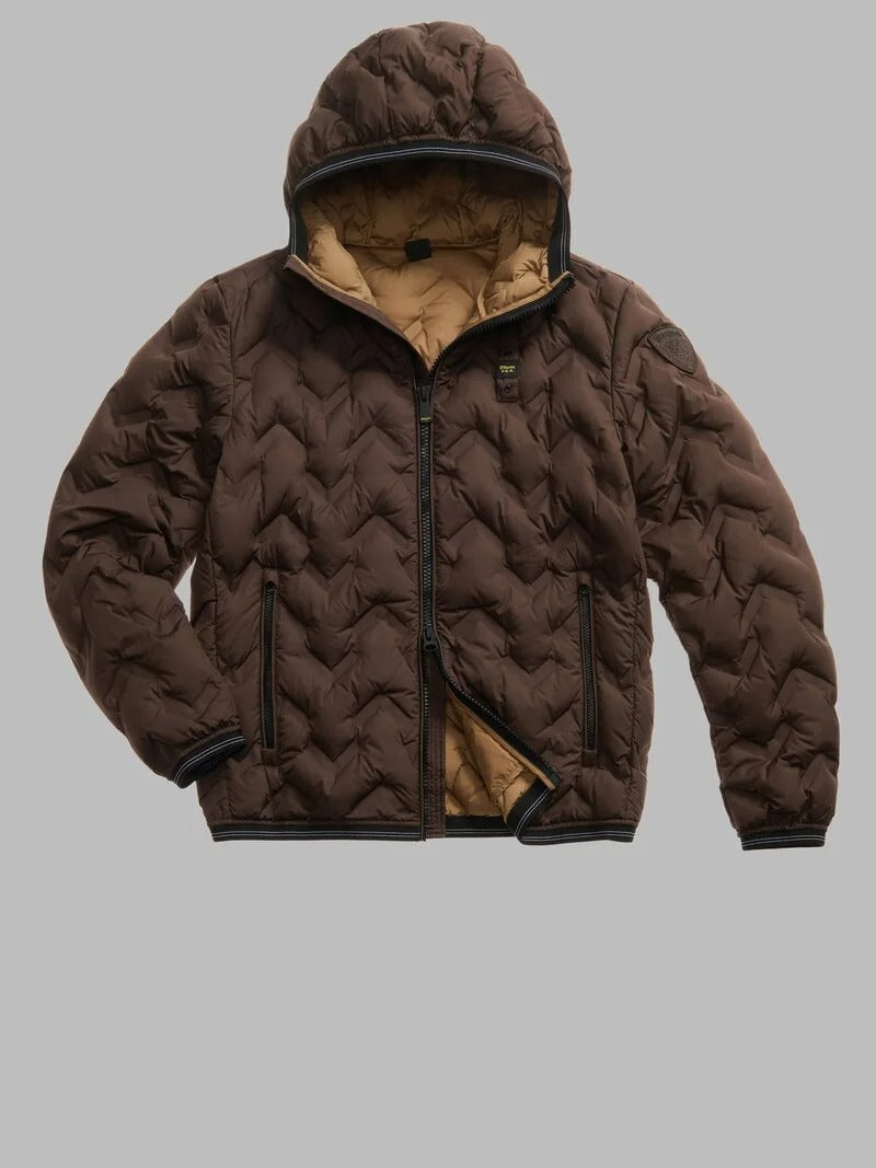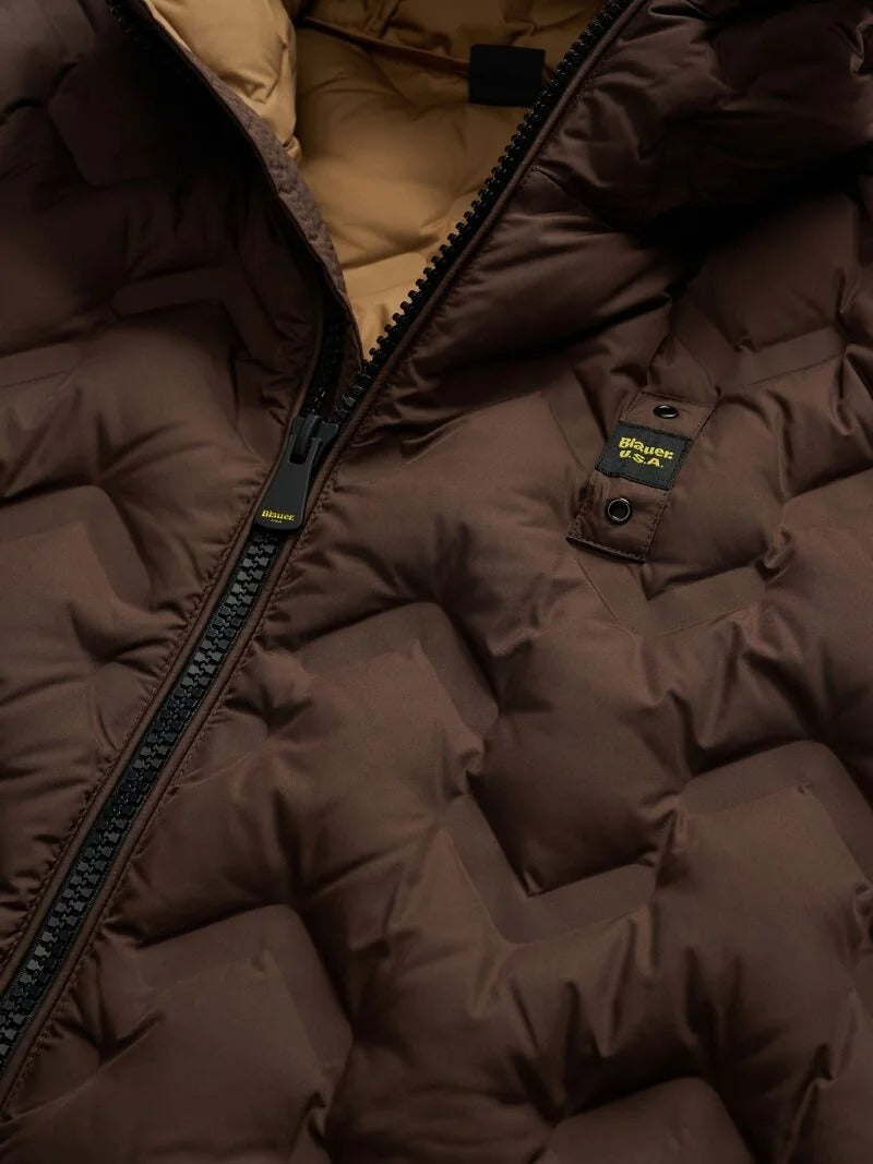 Piumino uomo con cappuccio fisso e profilo dall'aspetto aderente e arricciato. Cuciture nastrate ad angoli che donano un tocco innovativo e dinamico.