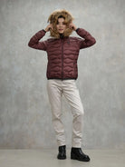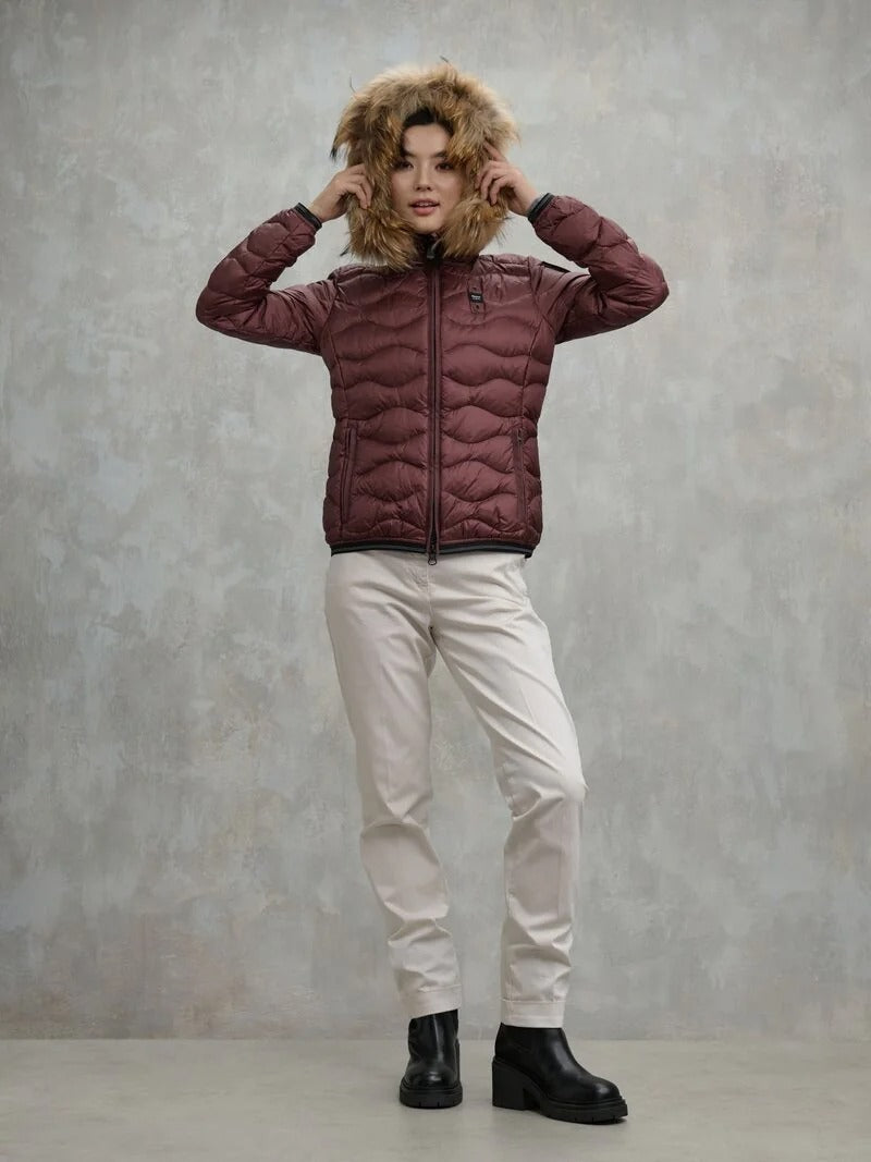 Piumino donna idrorepellente trapuntato ad onde orizzontali e con profilo del cappuccio in vera piuma. Capo iconico Blauer con imbottitura naturale, calda e non ingombrante, per essere sempre alla moda.