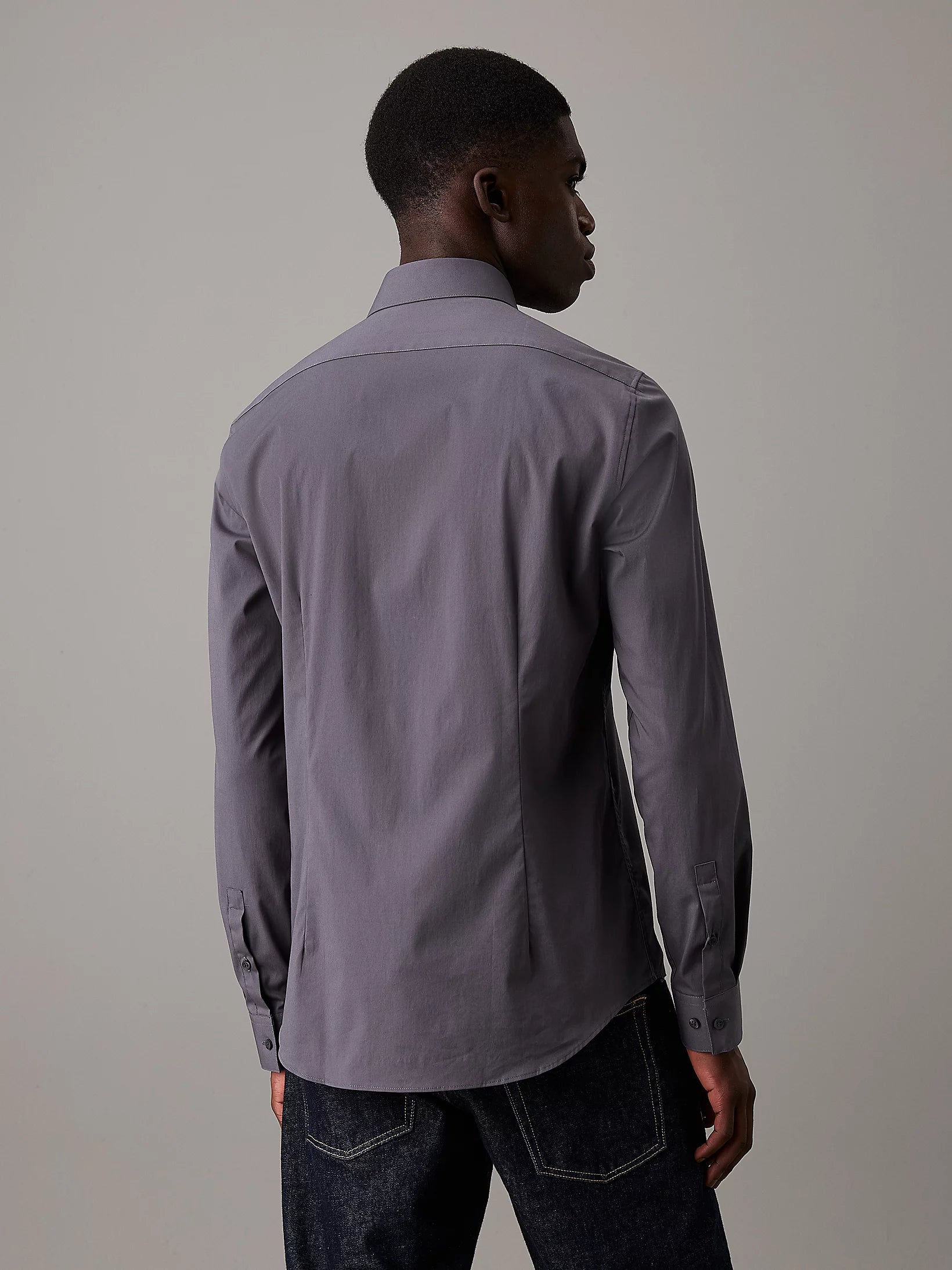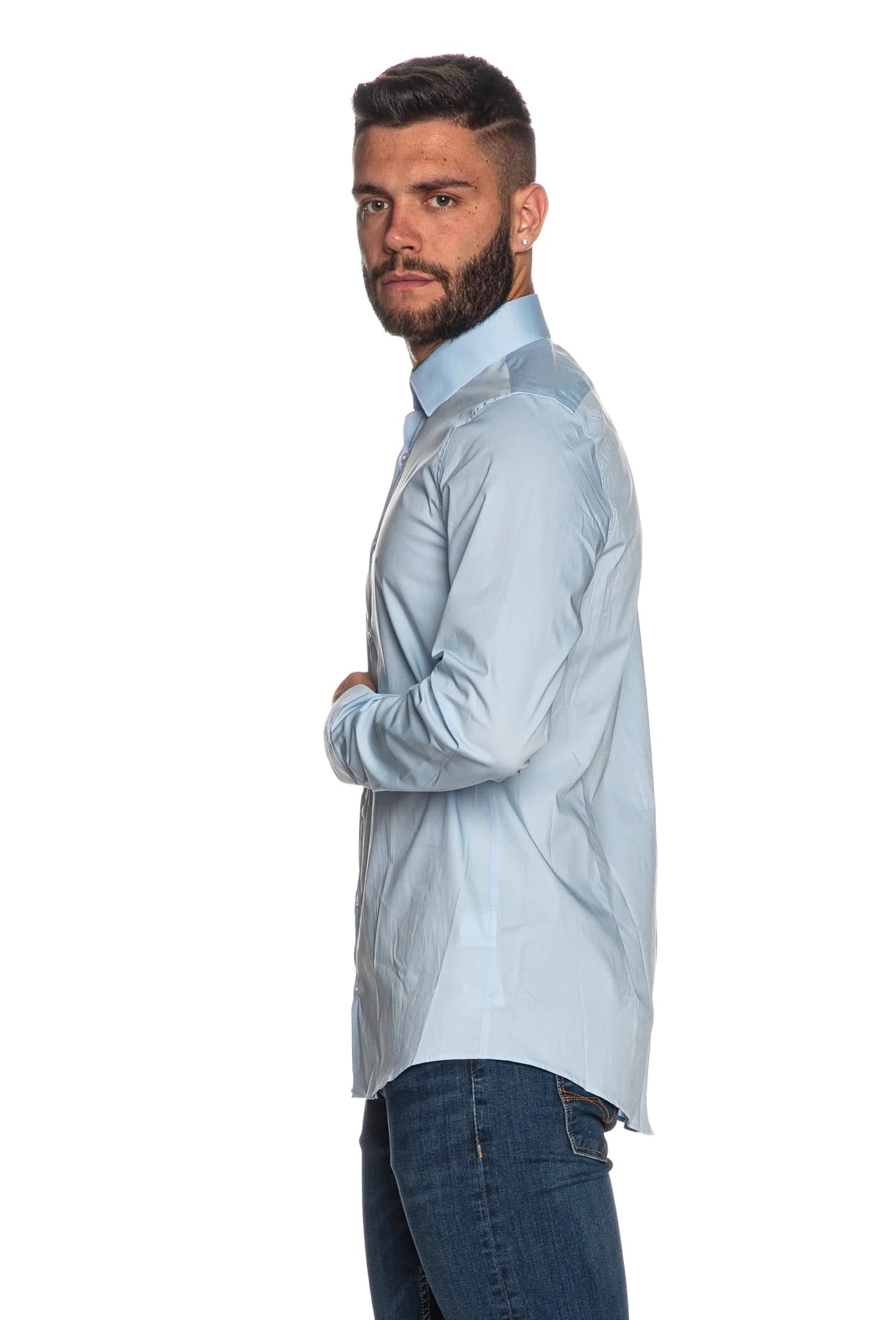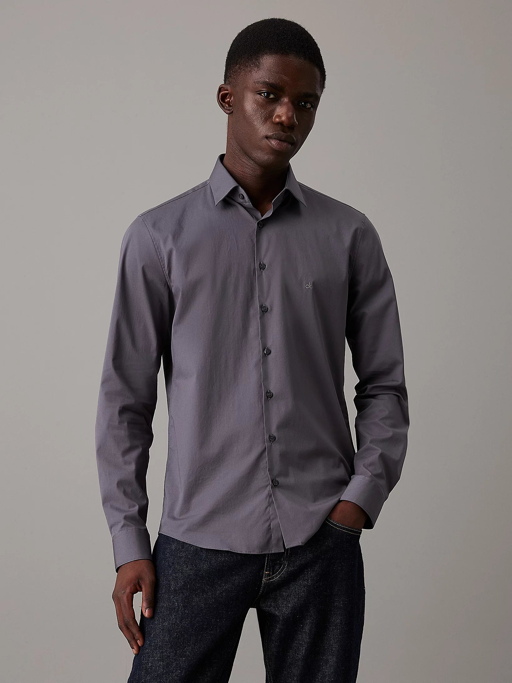 in popeline stretch di cotone, slim fit,,abbottonatura centrale senza cuciture, piccolo monogramma ricamato a filo tono su tono sul petto, carrè sulla schiena, manica lunga con polsino ad un bottone regolabile e fondo stondato