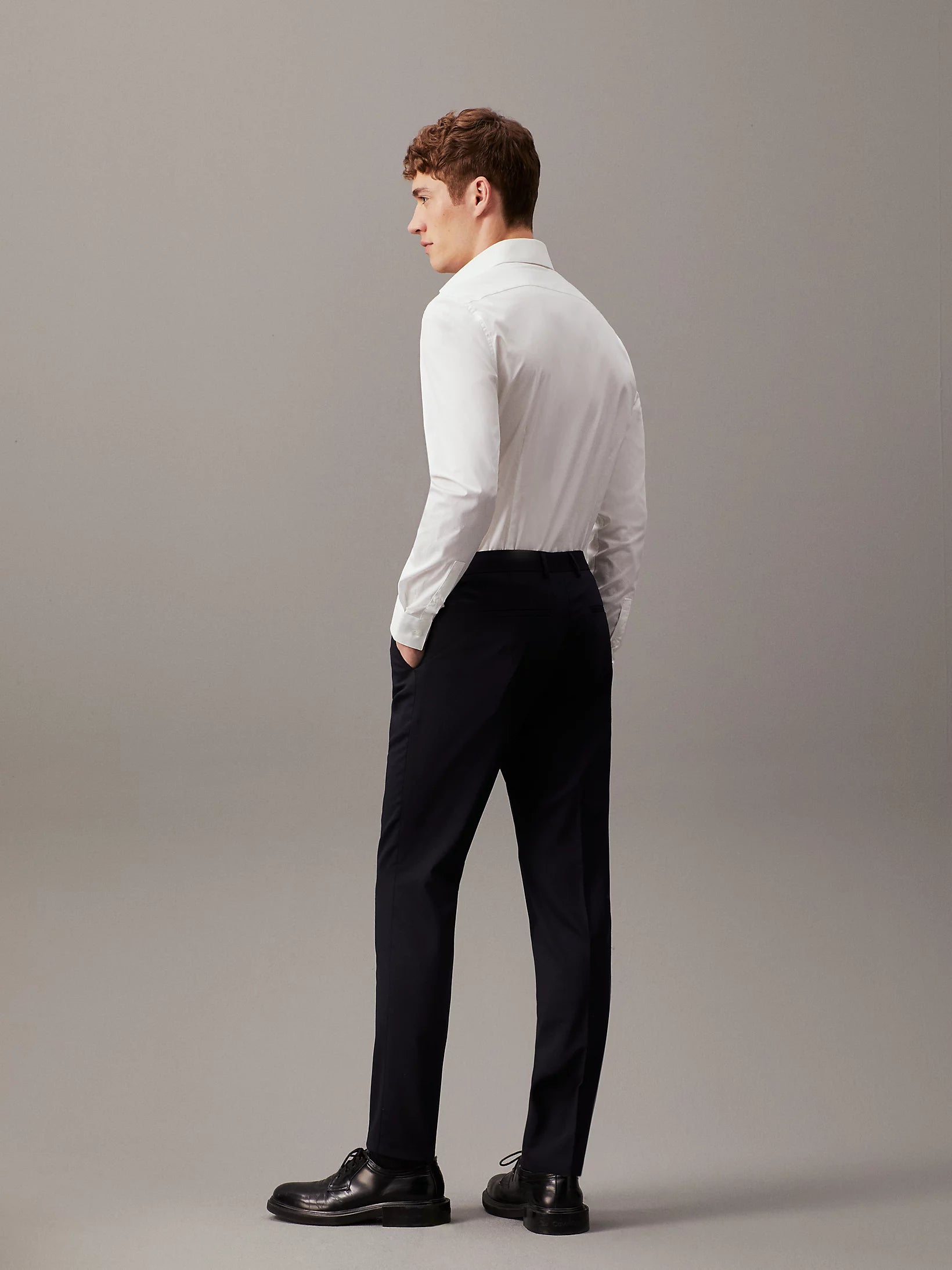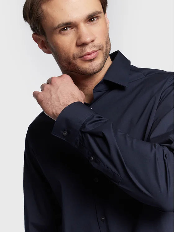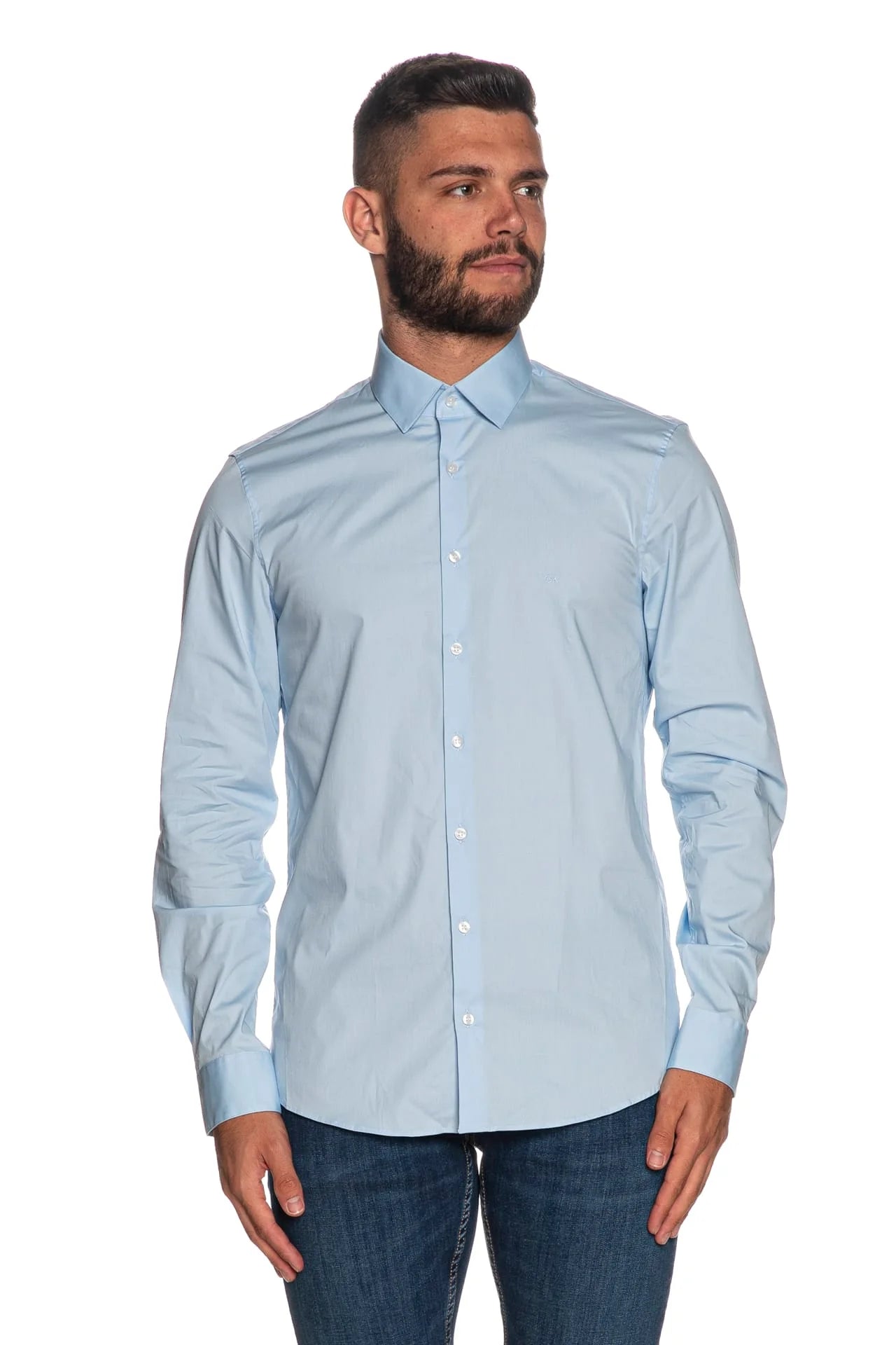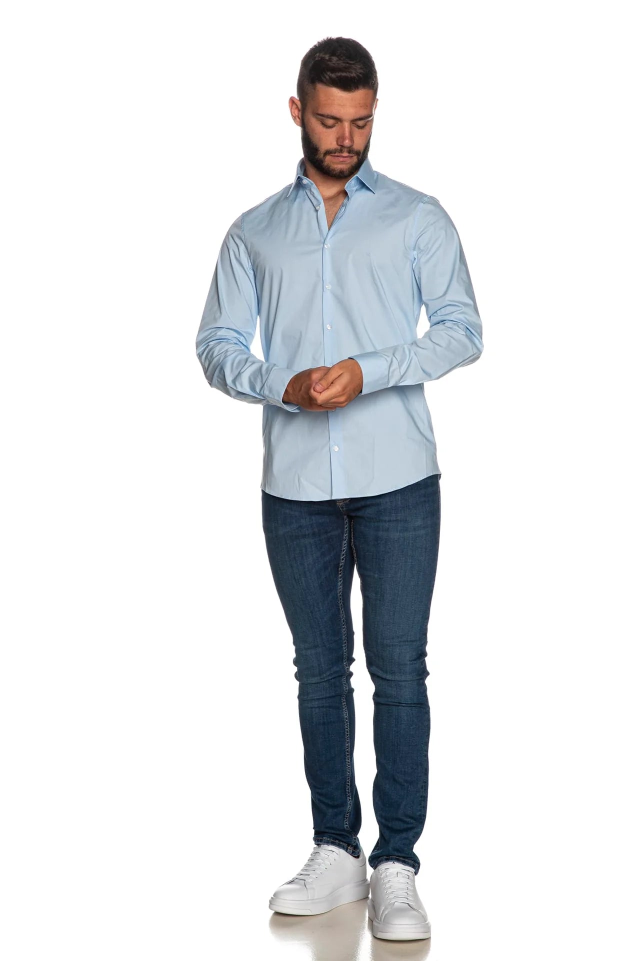 in popeline stretch di cotone, slim fit,,abbottonatura centrale senza cuciture, piccolo monogramma ricamato a filo tono su tono sul petto, carrè sulla schiena, manica lunga con polsino ad un bottone regolabile e fondo stondato