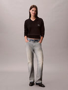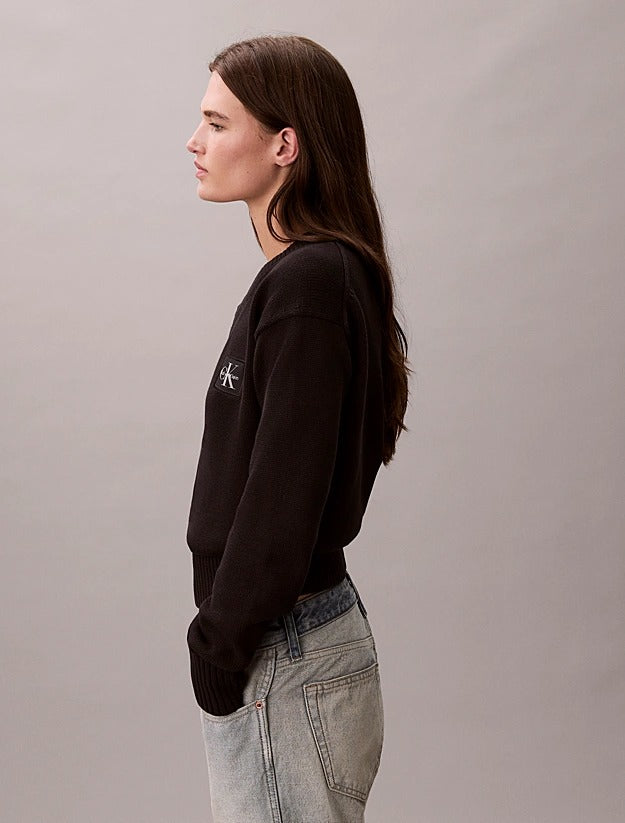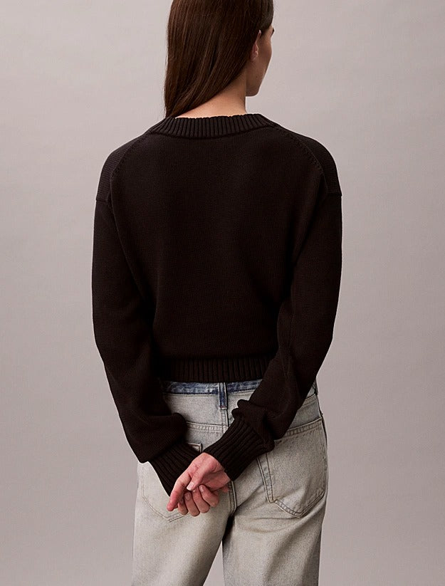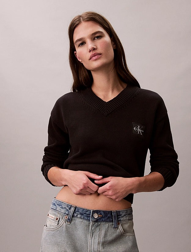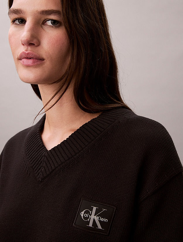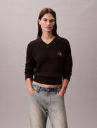Calvin Klein Jeans Maglione con Stemma e Scollo a V in Maglia di Cotone Nero