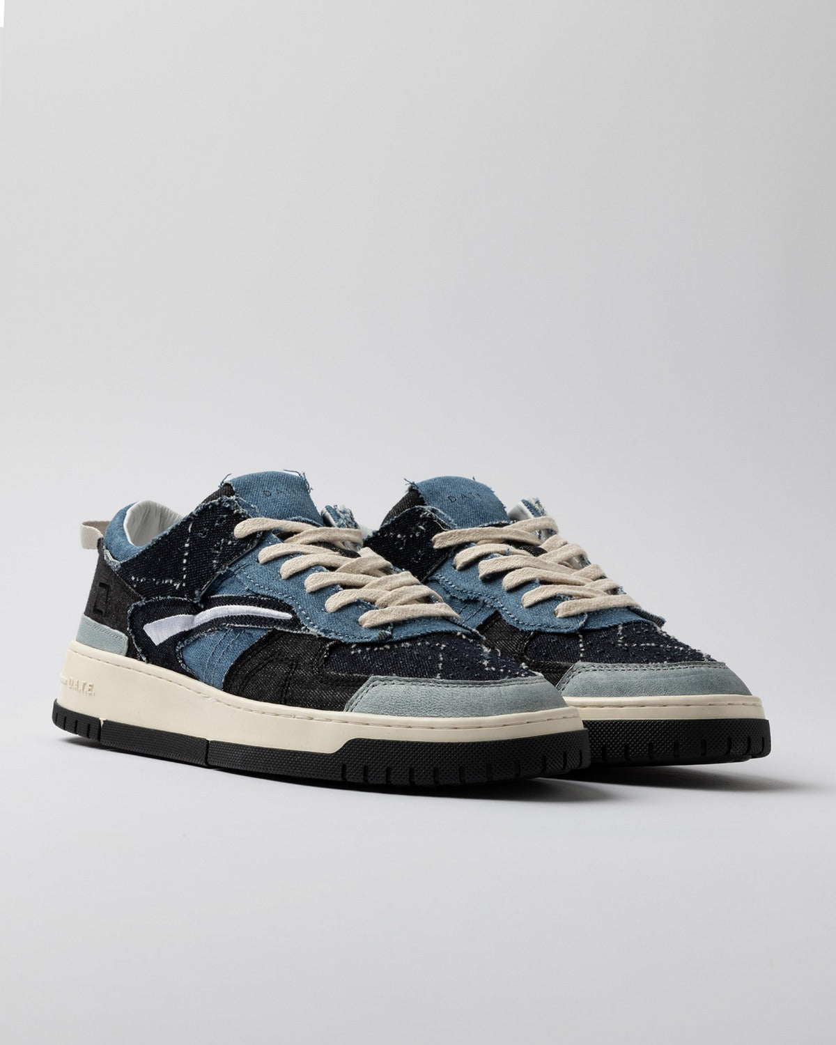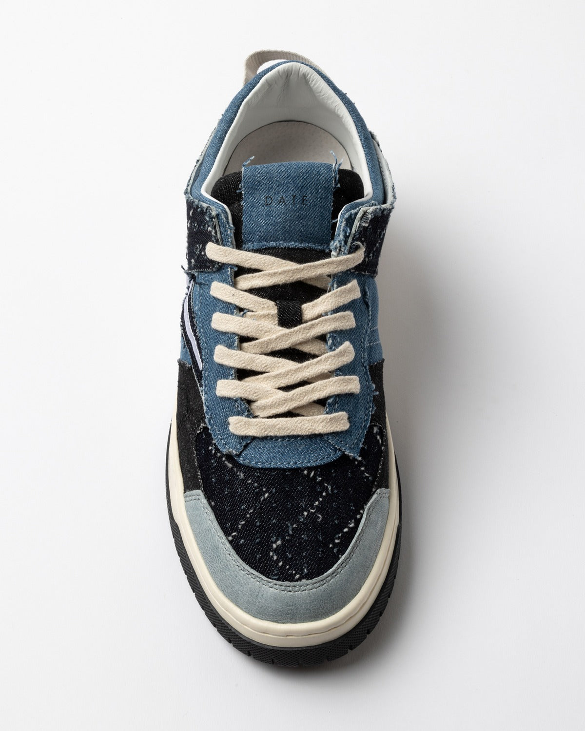 Sneakers bassa in denim colore blu con dettagli in pelle celeste.