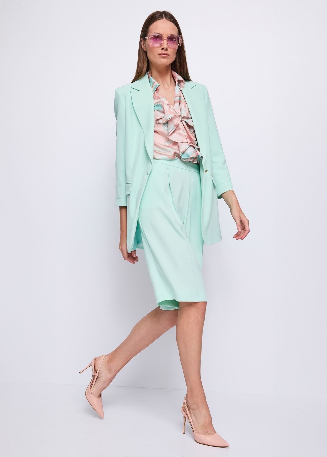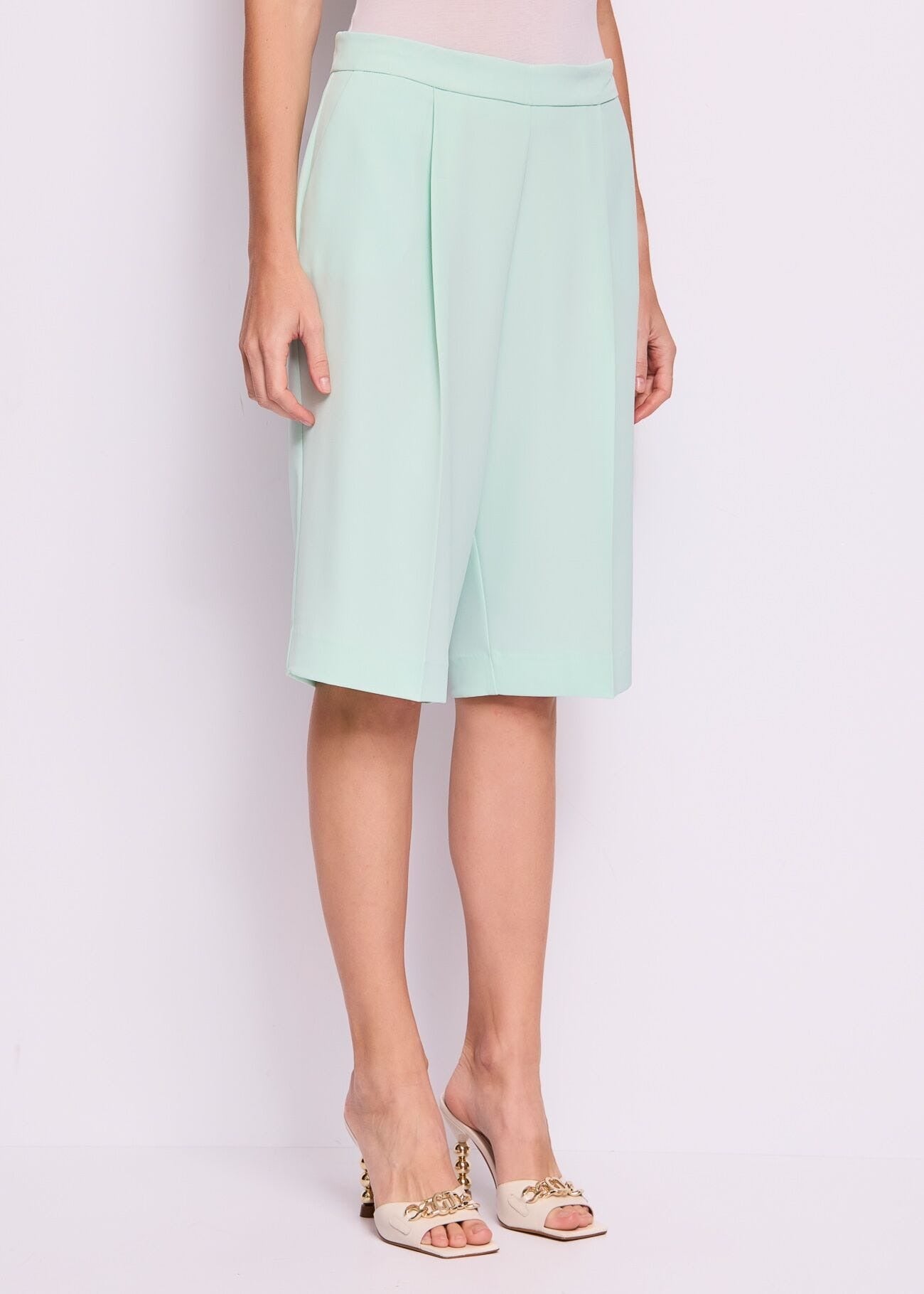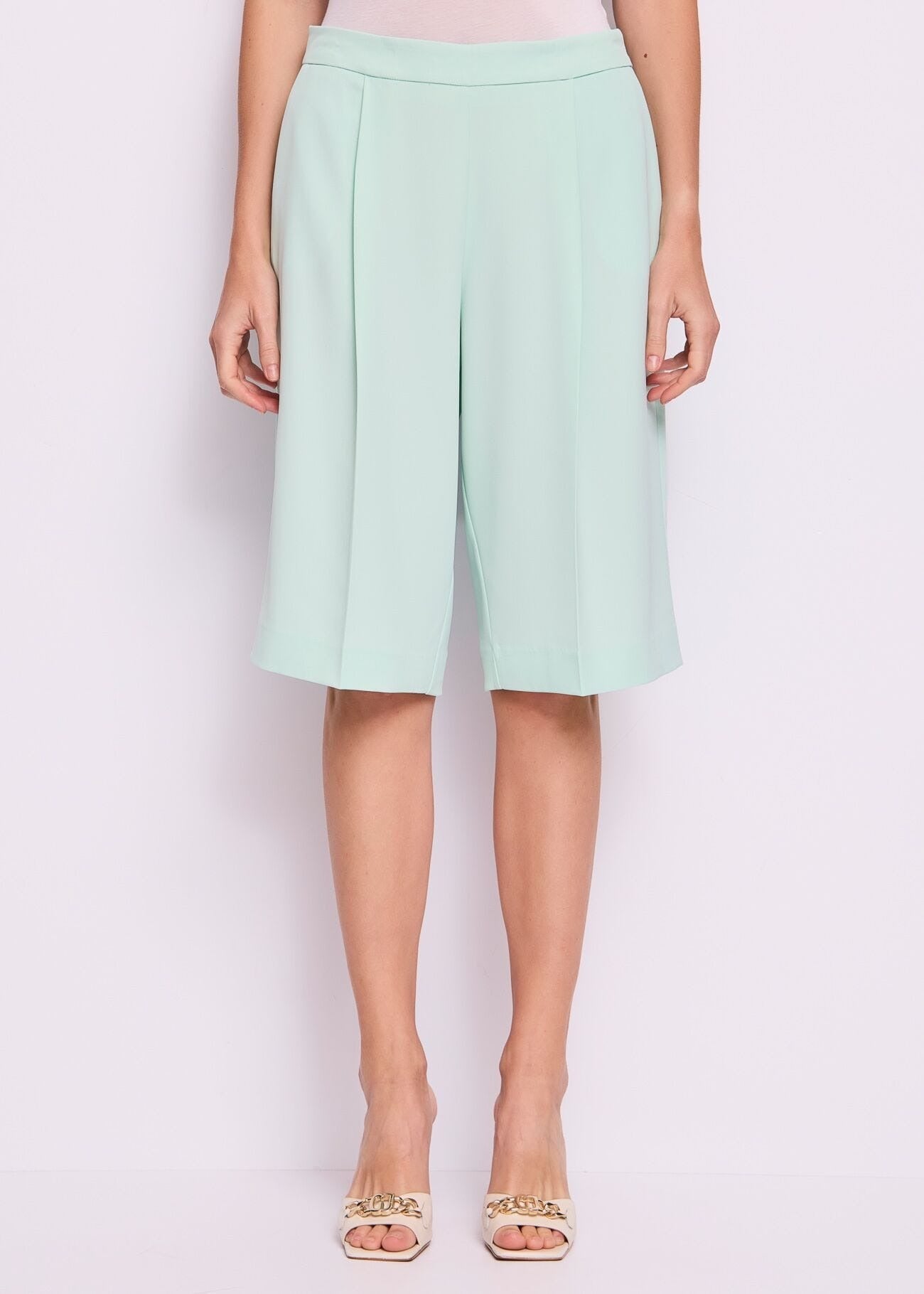 Bermuda donna con vestibilità ampia e armoniosa, possono essere abbinati a un blazer coordinato, una blusa stampata con rouches e sandali per un'eleganza moderna e versatile.