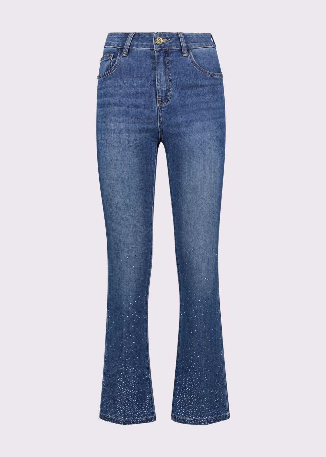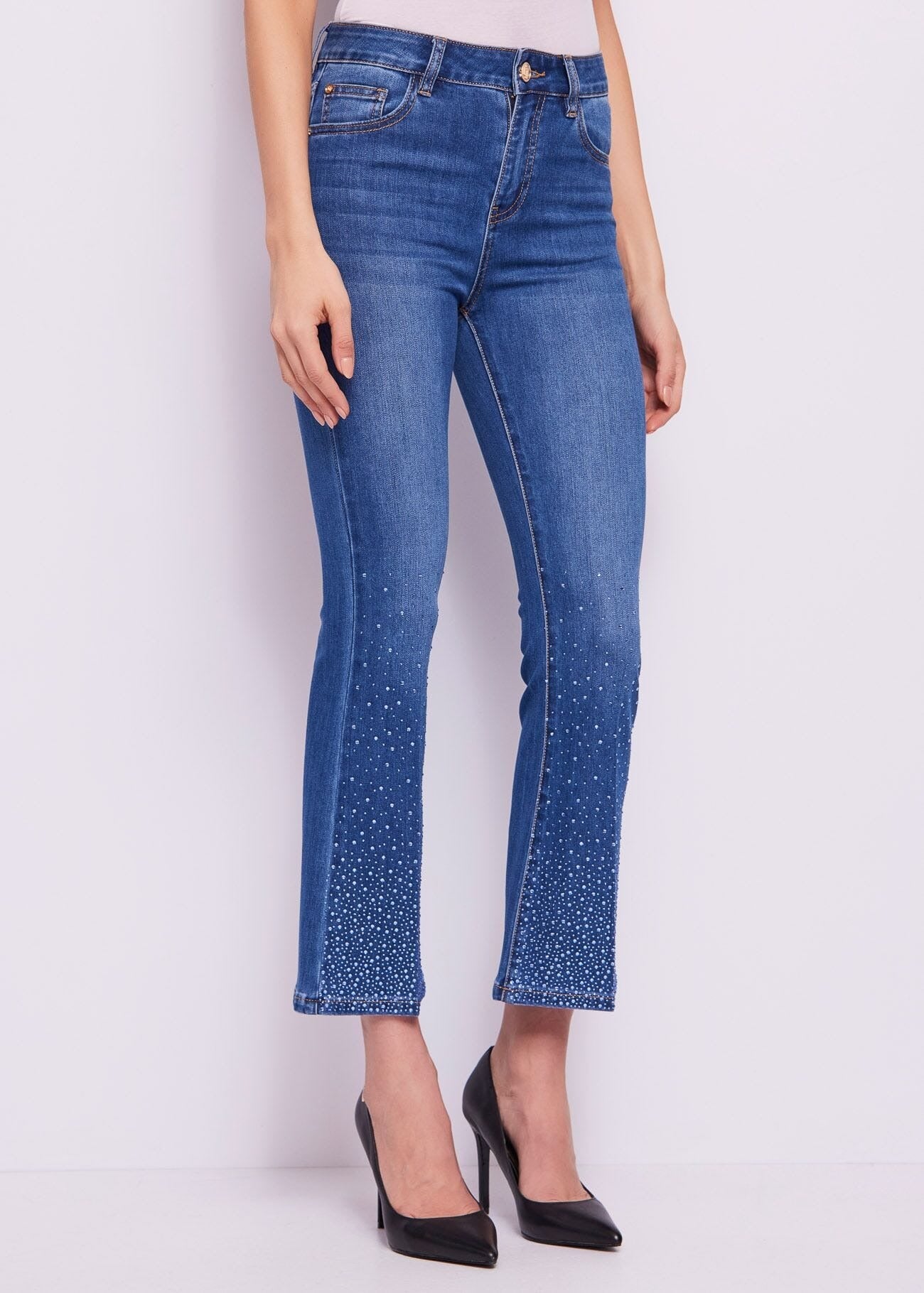 Jeans donna flare cropped in cotone used impreziositi con strass. Modello cinque tasche per un look cool e scintillante.