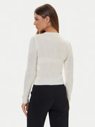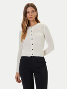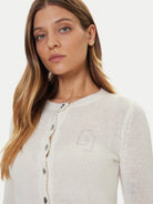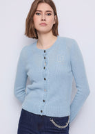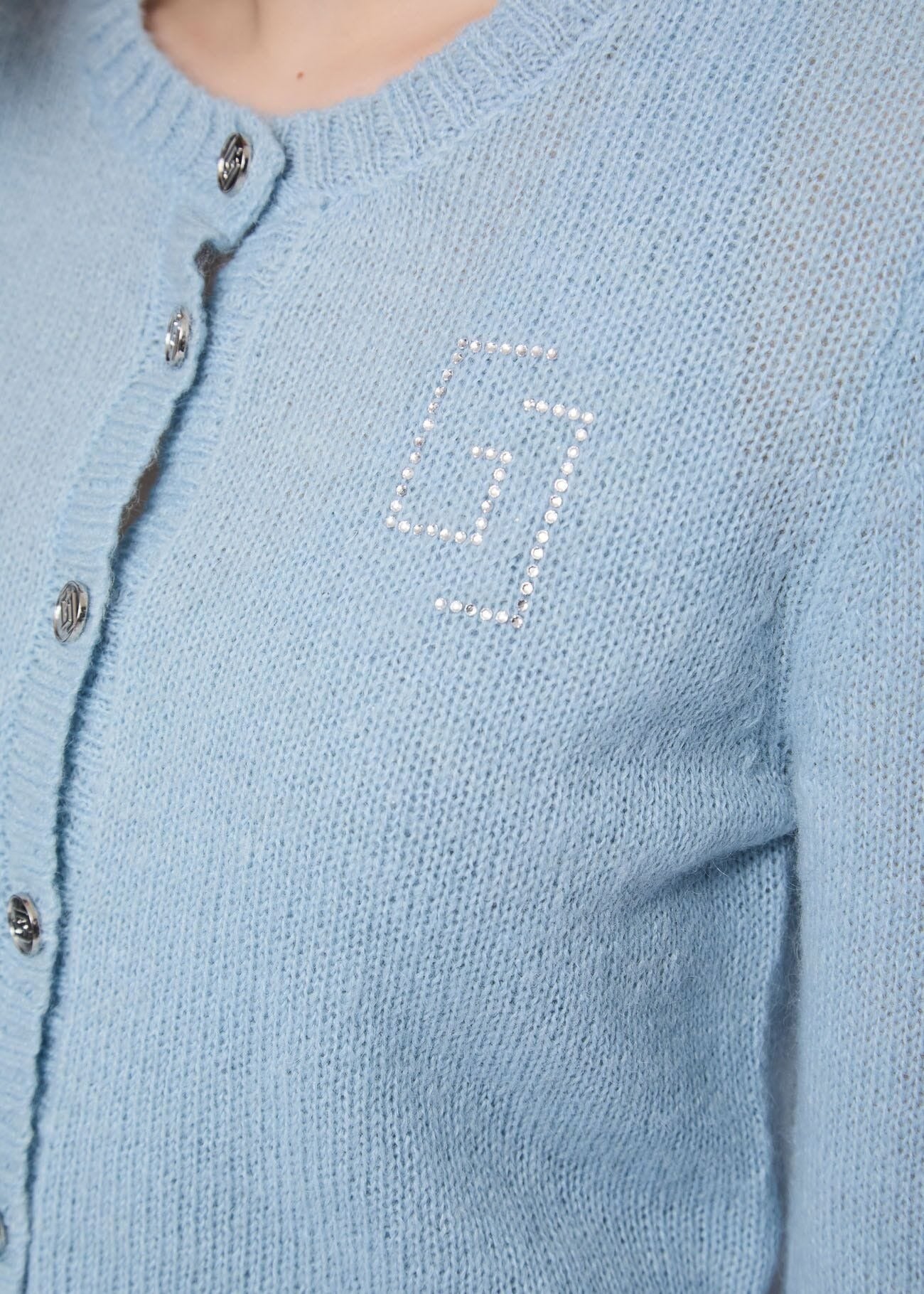 il cardigan in filato di misto lana e mohair con bottoni e logo GJ con strass. Morbidezza e comfort per un look raffinato.