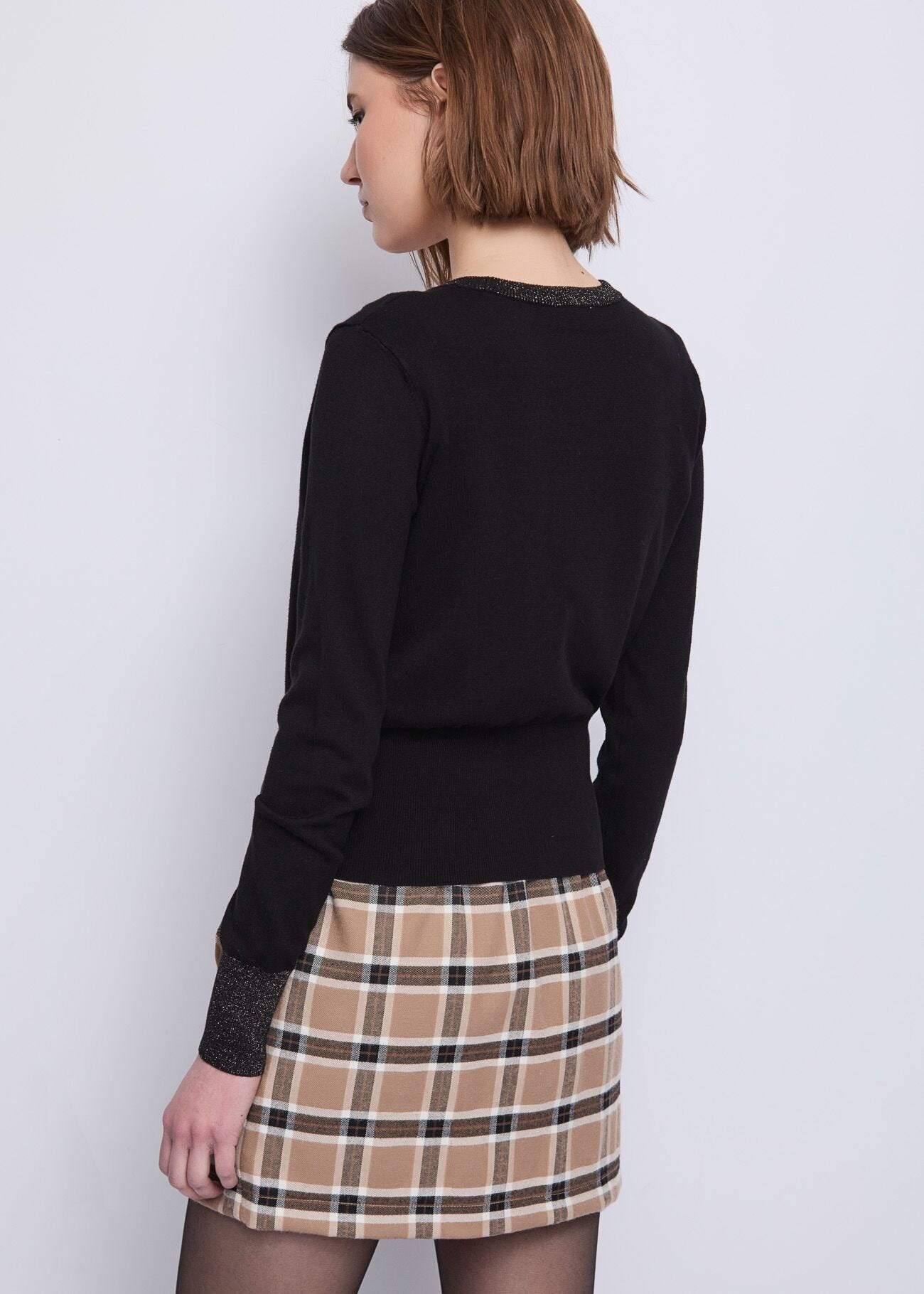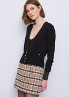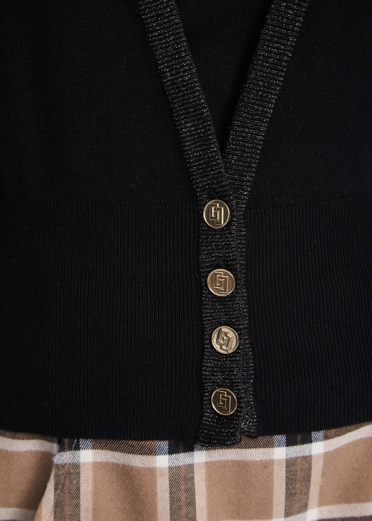 il cardigan in morbido filato con dettagli in lurex e bottoni logati. Perfetto per valorizzare ogni look con un tocco glamour.