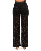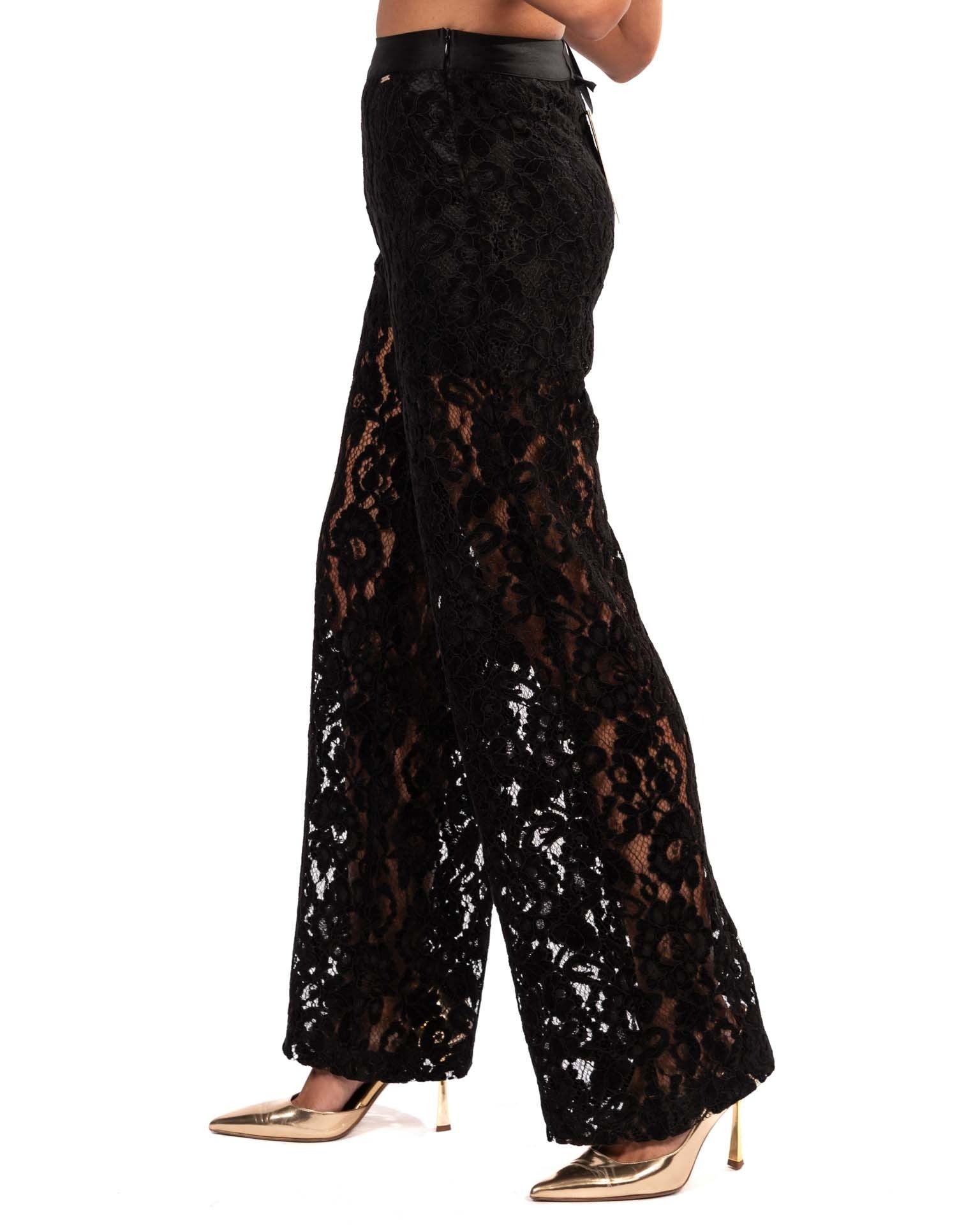 pantaloni in pizzo floreale con dettagli in raso, tasche sui fianchi e logo in metallo. Linea ampia e fluida per un look seducente.