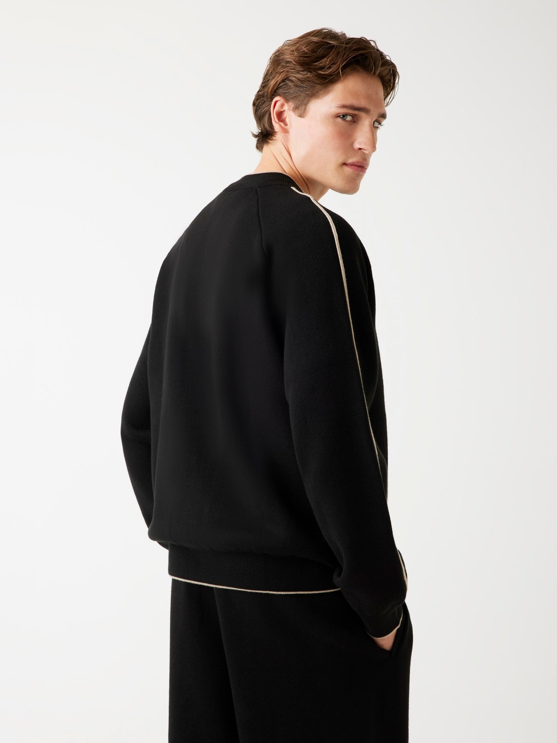 Finitura a righe su collo a lupetto, polsini e orlo.