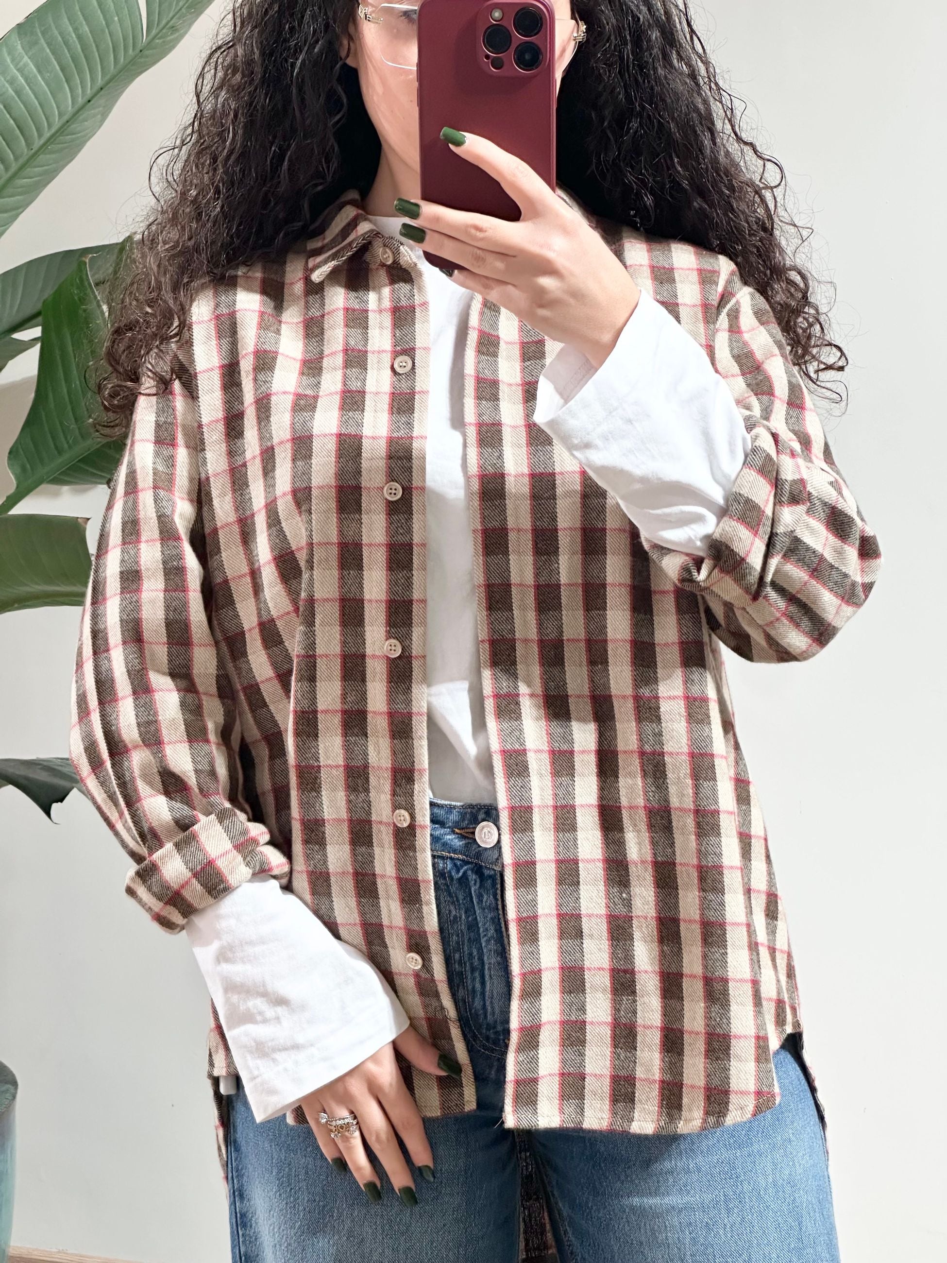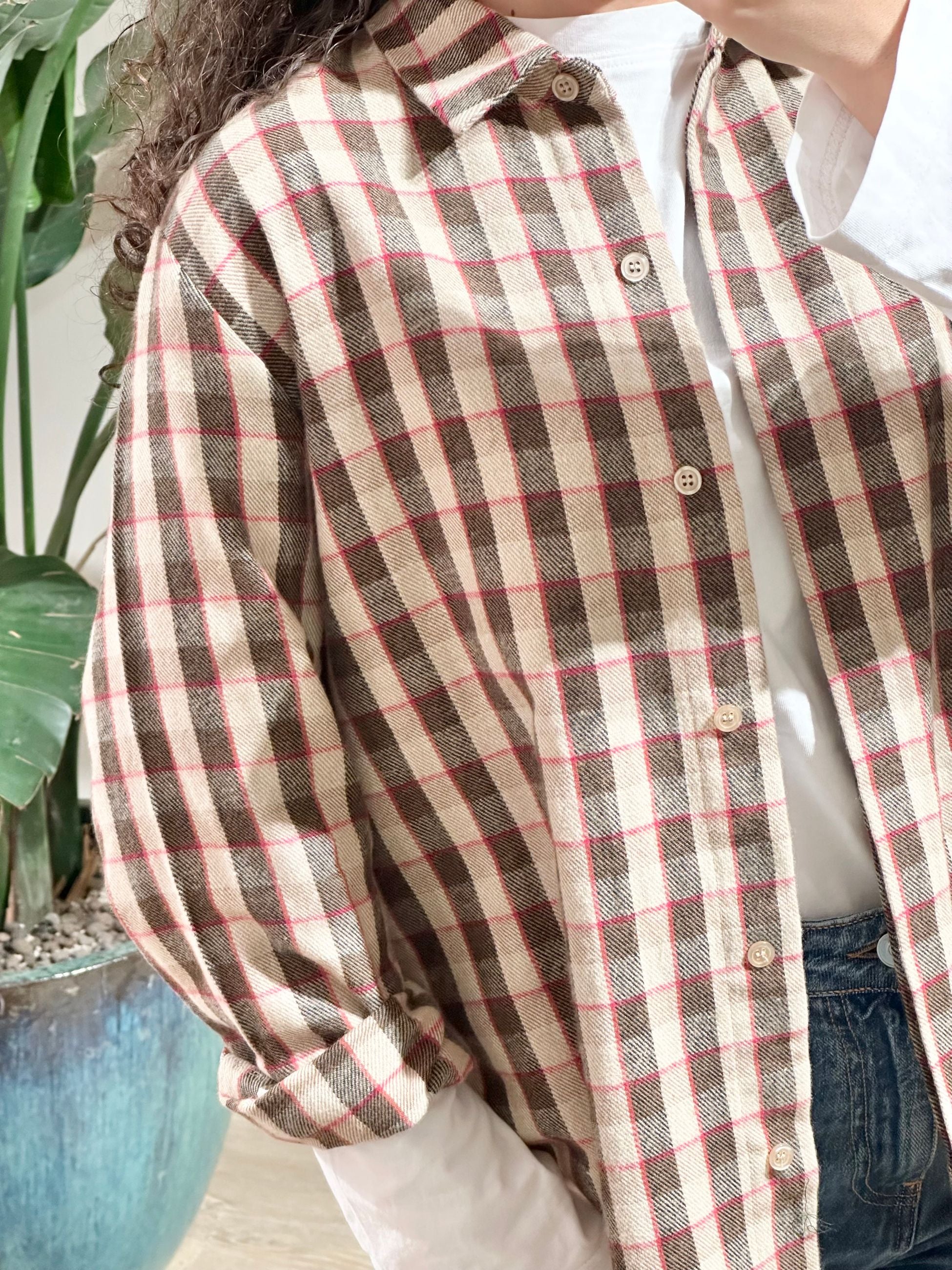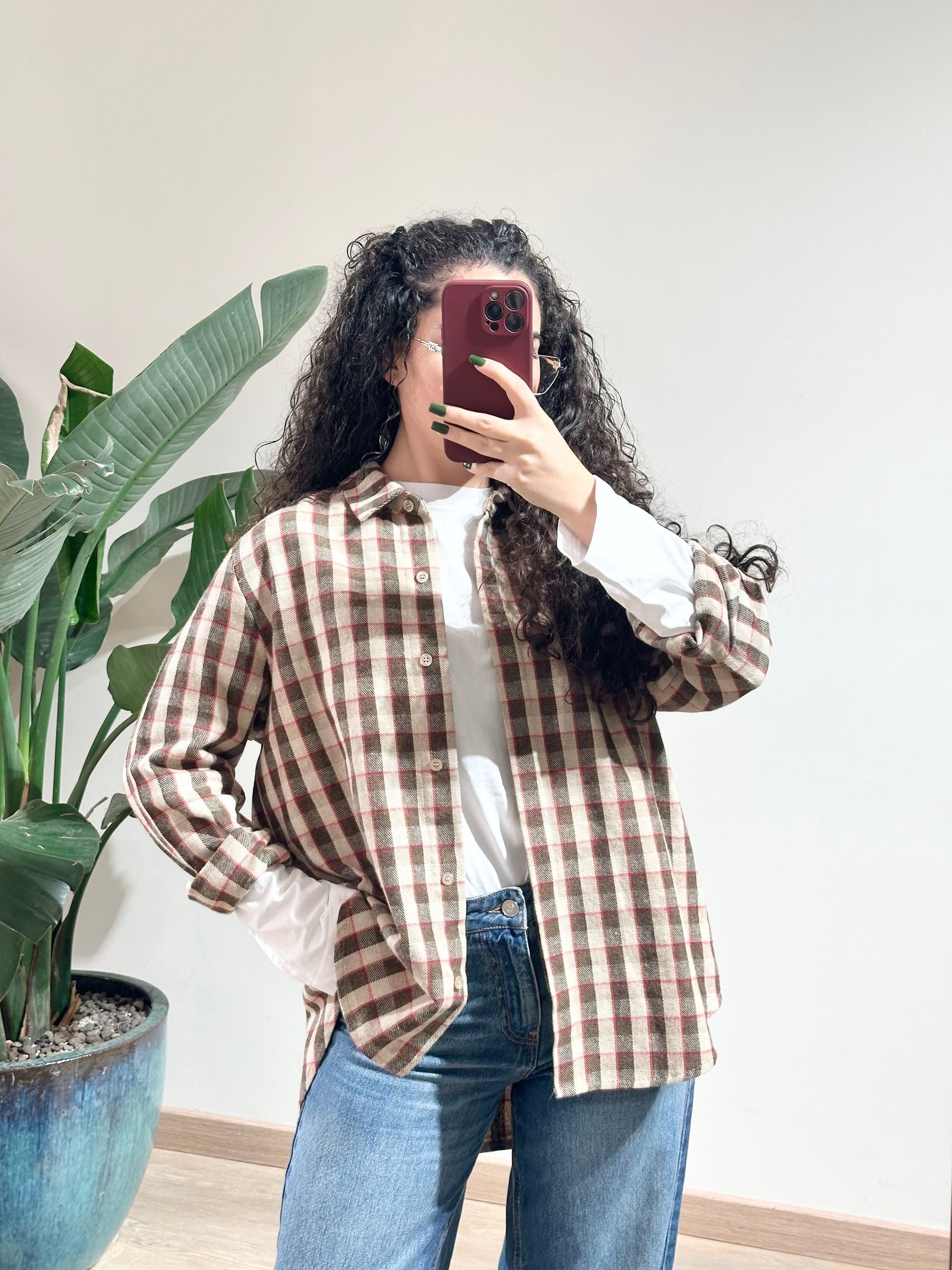 Camicia donna in flanella con collo a revers e maniche lunghe con polsino e bottone orlo svasato sul retro chiusura nascosta con bottoni.