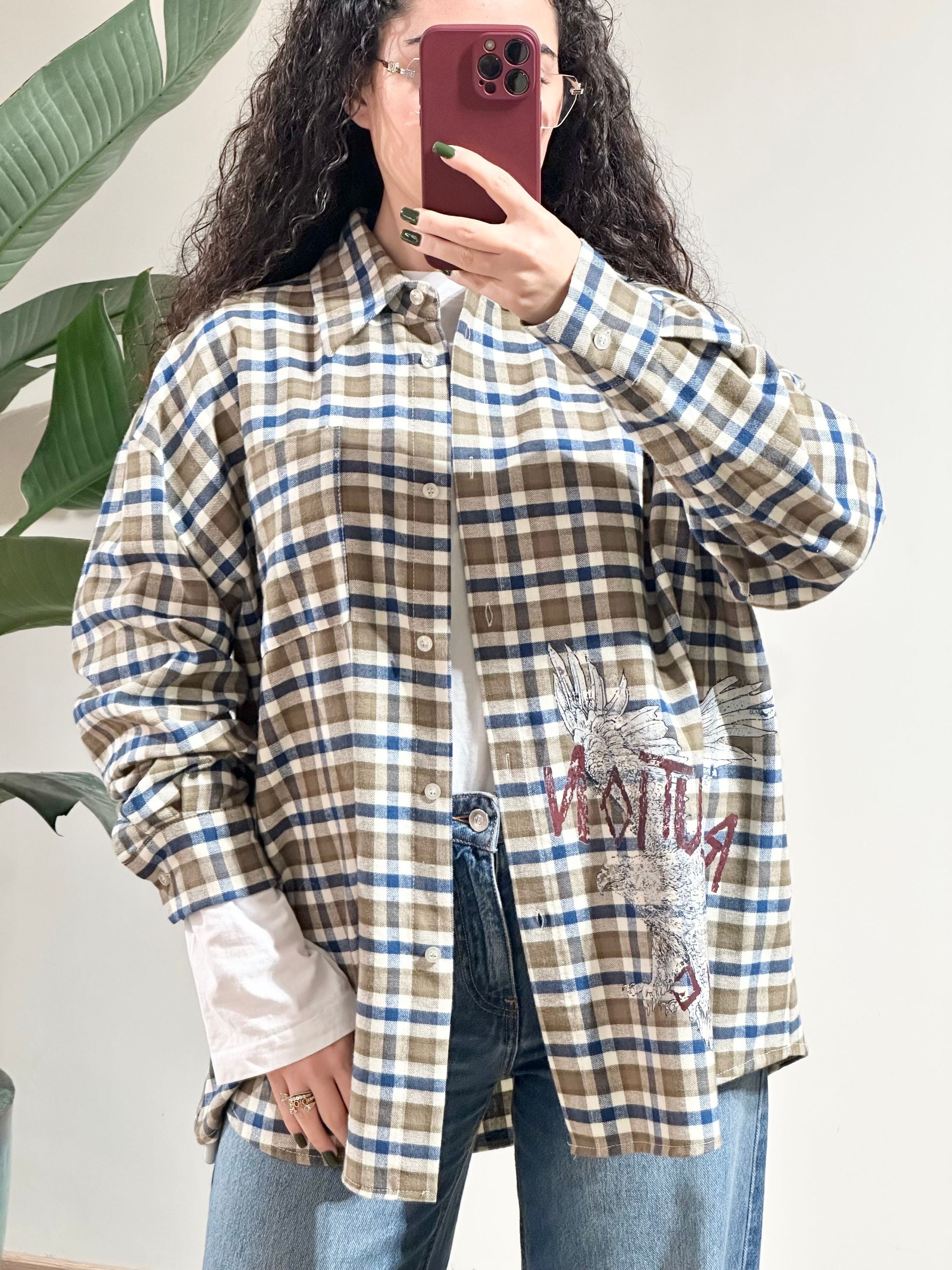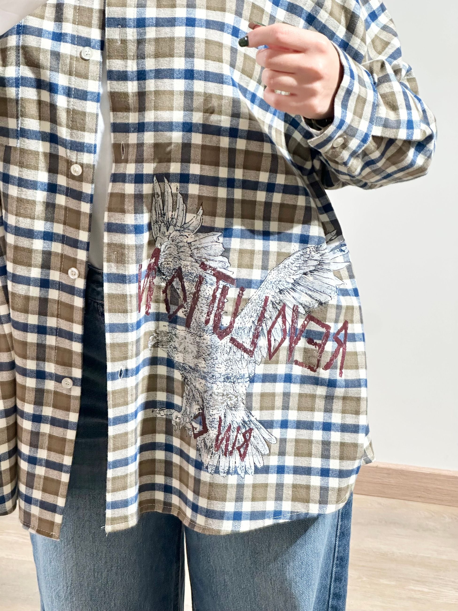 Camicia donna over a quadri con stampa revolution collo revers chiusura con bottoni