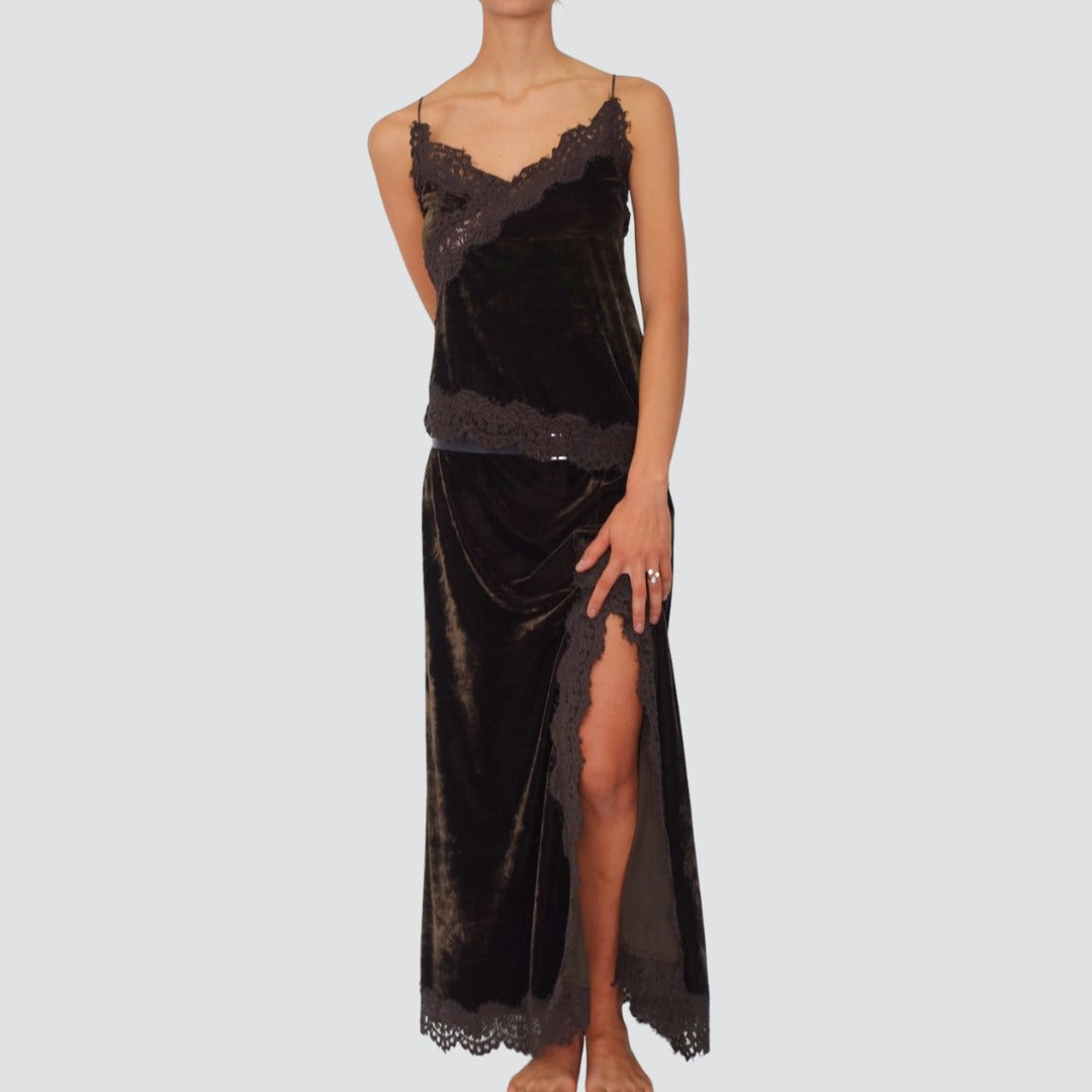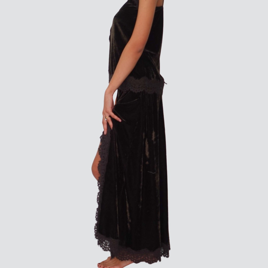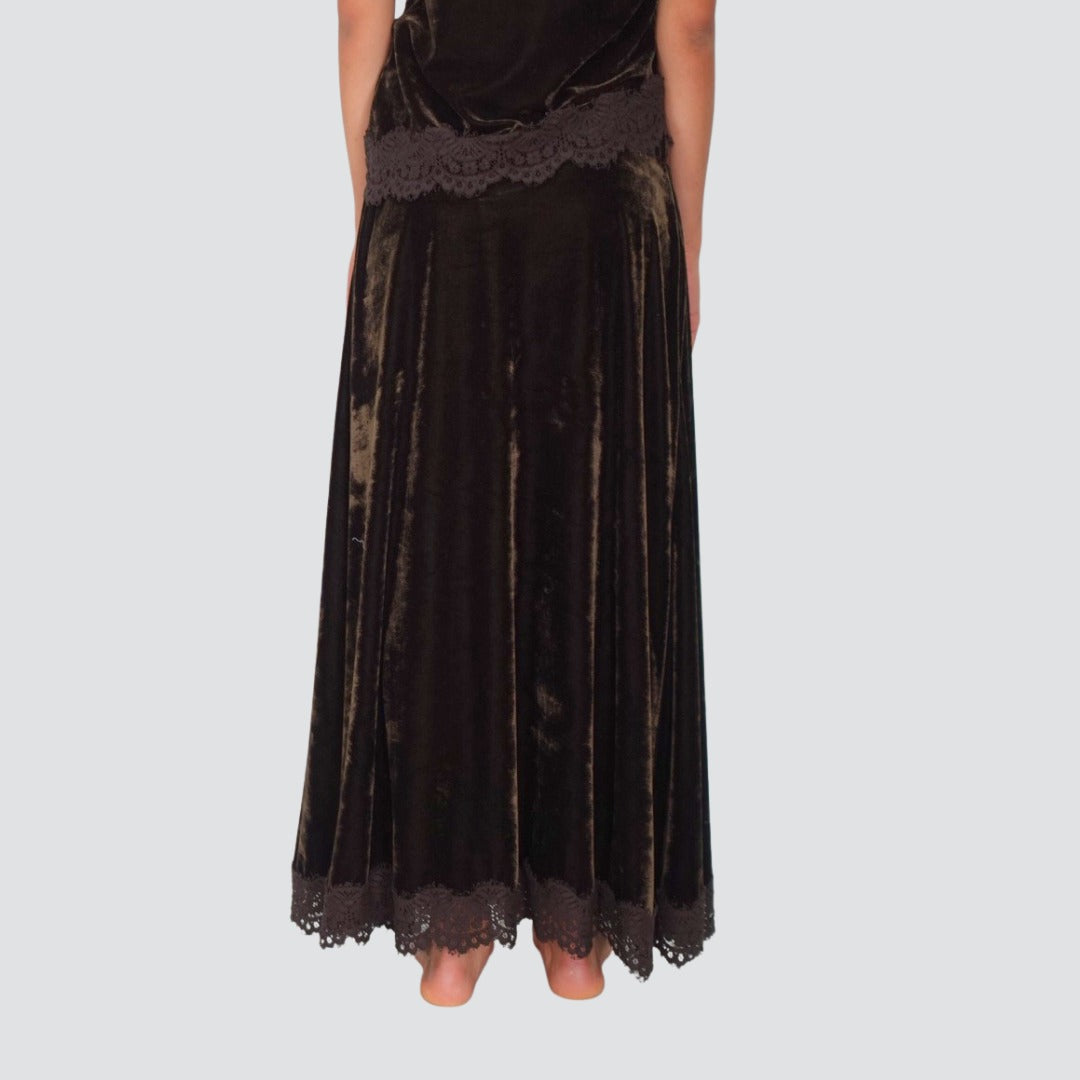 Gonna lunga in ciniglia con spacco bordato di pizzo sulla gamba e doppia cintura