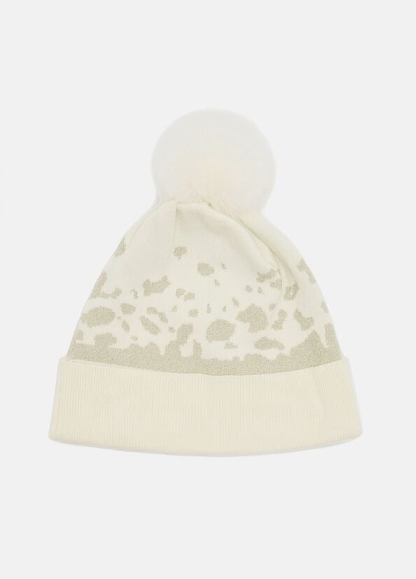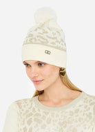 motivo animalier jacquard con pompon risvolto a costine logo in metallo