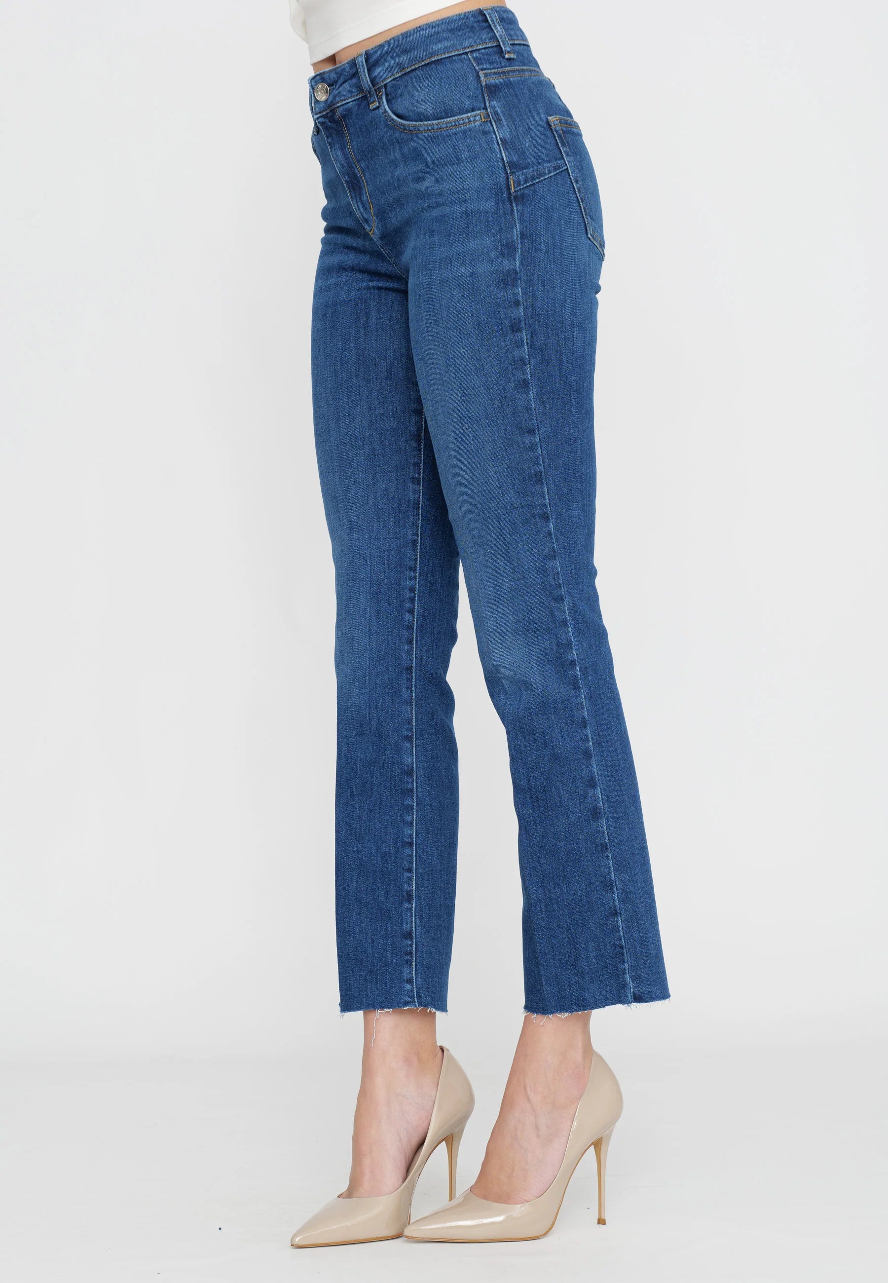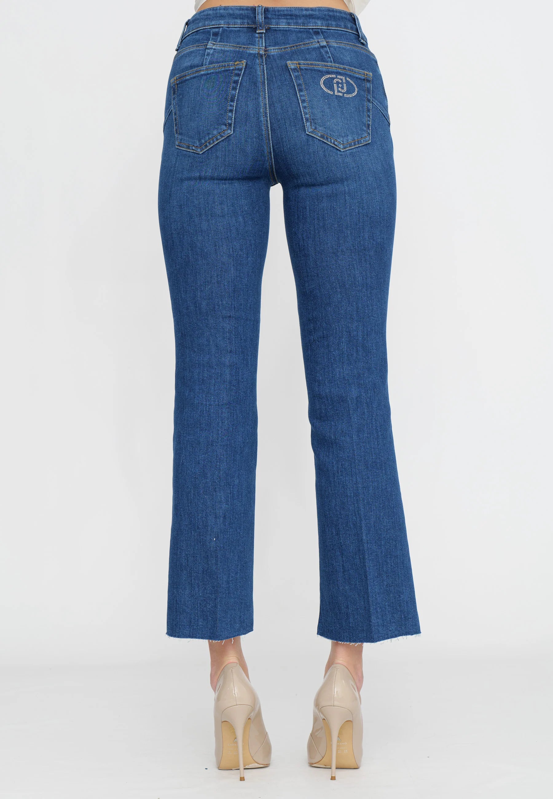 Jeans a trombetta con fondo a taglio vivo, vita alta, tasca posteriore con logo strass e tagli bottom up.