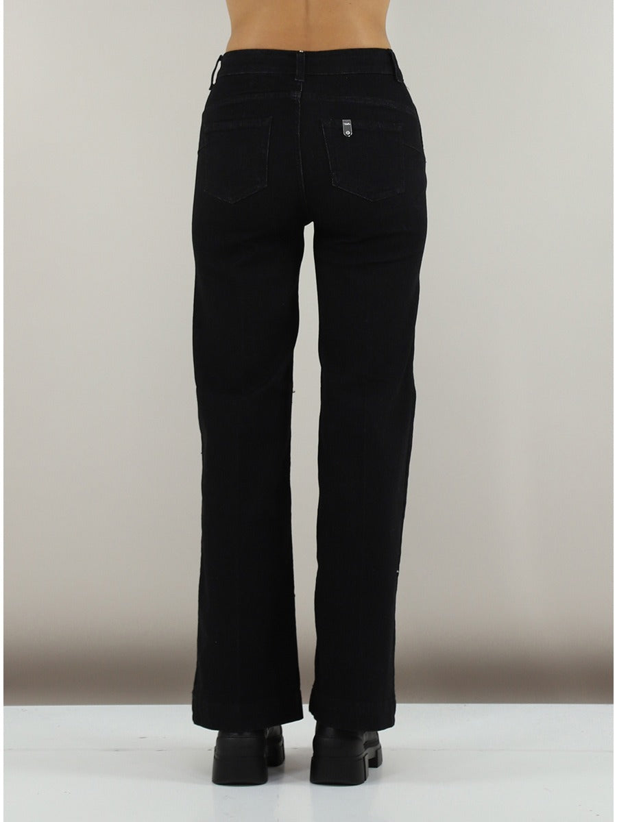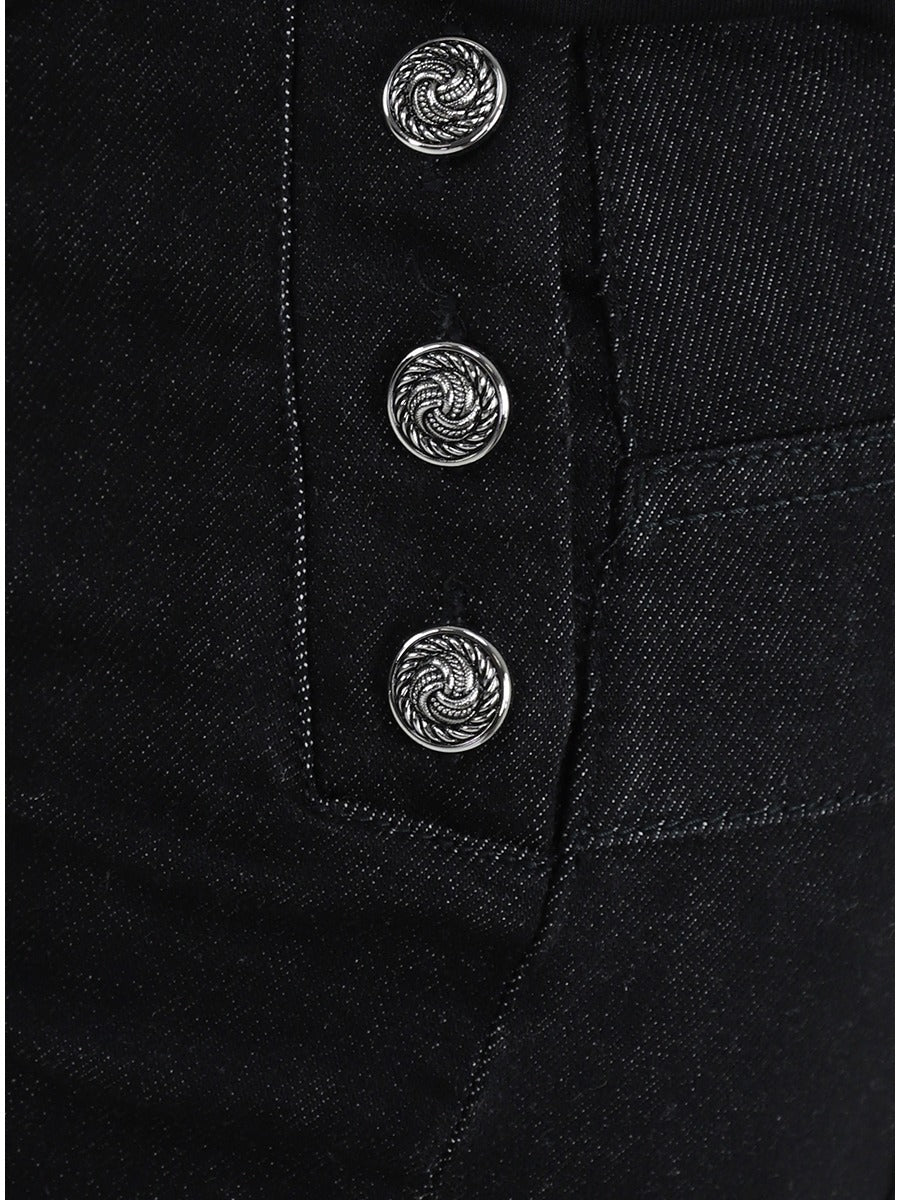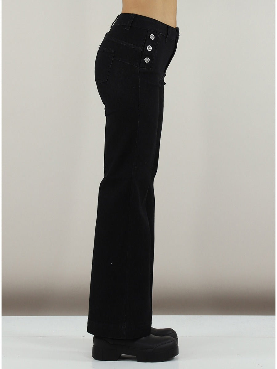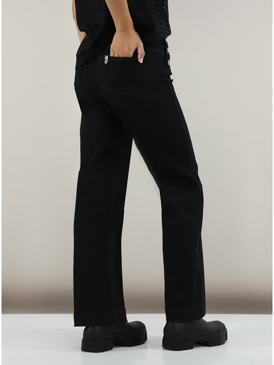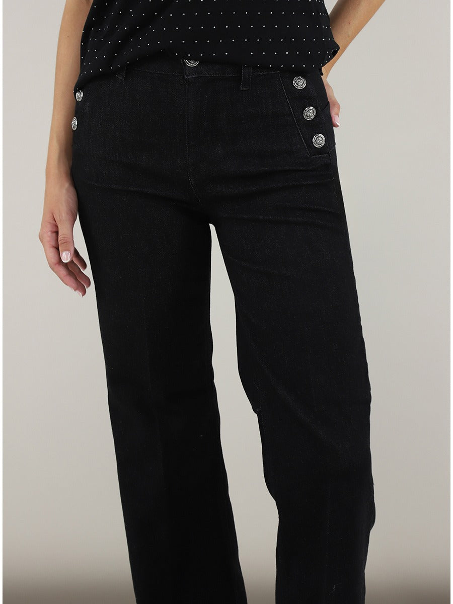 Jeans donna in denim elasticizzato vita alta con bottoni decorativi sui lati chiusura con cerniera e bottone dettaghli logo in metallo e brillantino sulla tasca posteriore