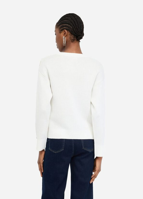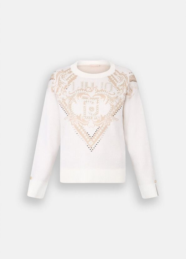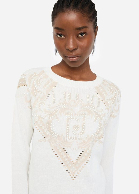 Maglia donna in misto lana motivo jacquard con borchie e strass scollo rotondo e maniche lunghe