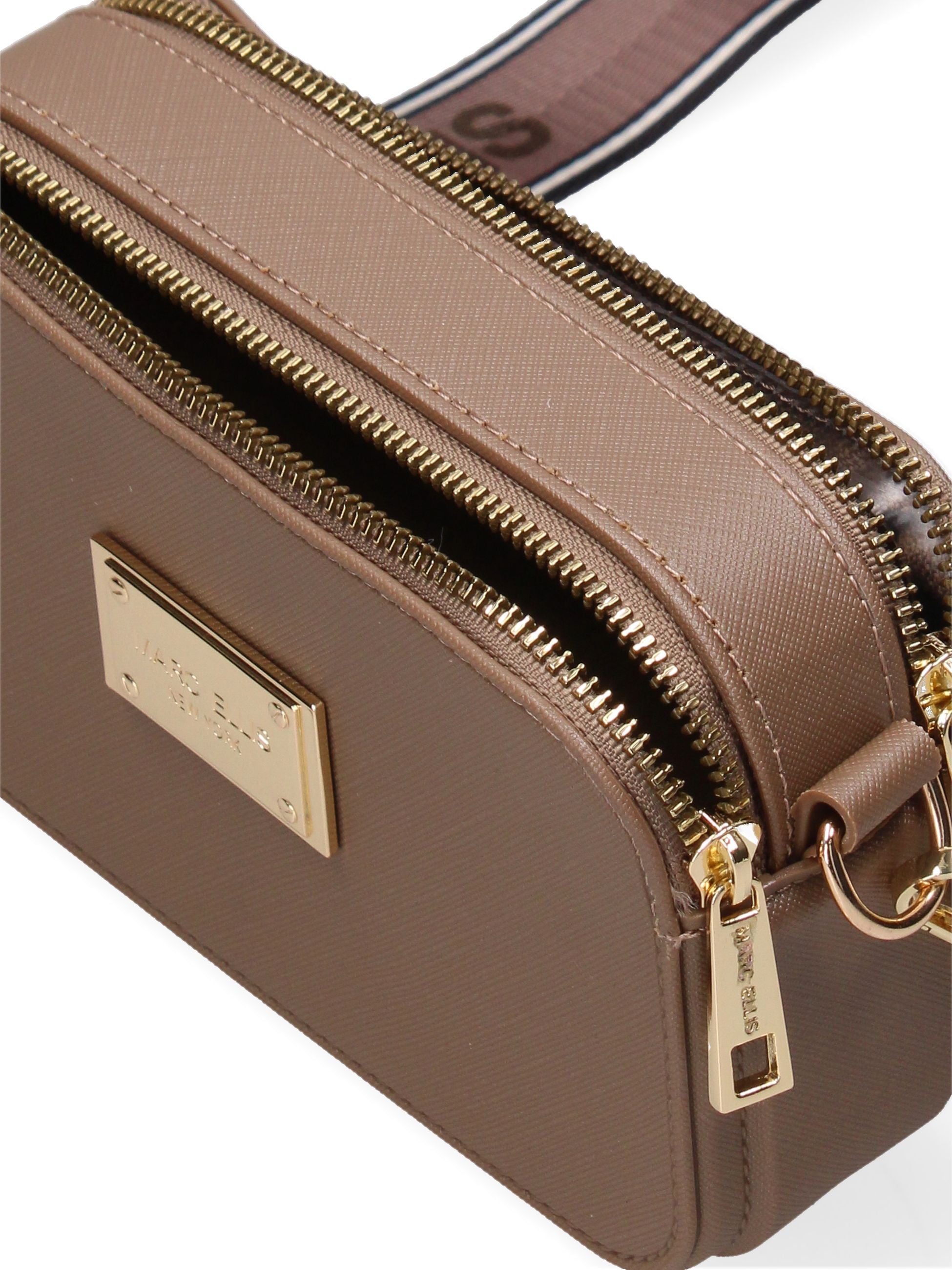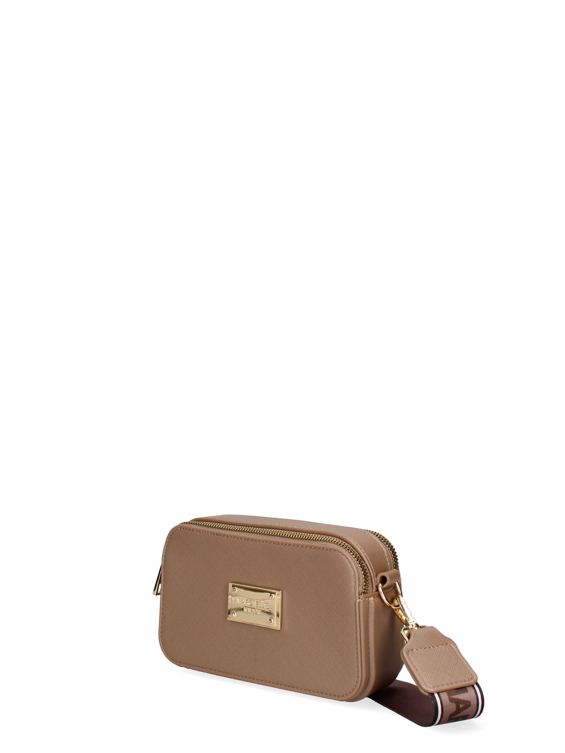 La borsa mini a tracolla Marc Ellis offre uno stile elegante e strutturato, grazie al suo materiale effetto saffiano e alla silhouette compatta. La doppia chiusura a zip e il logo metallico smaltato frontale la rendono anche pratica e funzionale, mentre la tracolla regolabile in tessuto la rende comoda da indossare.