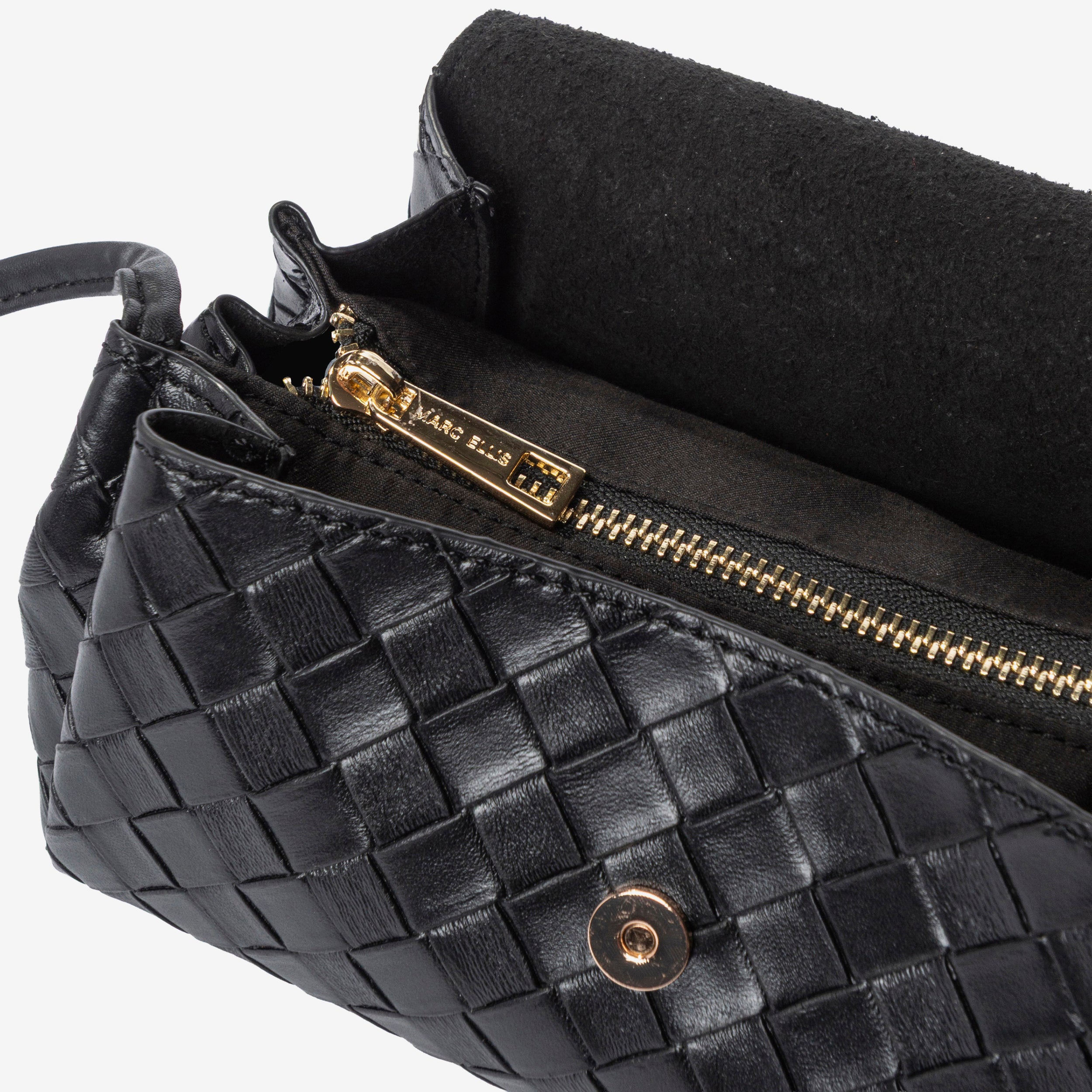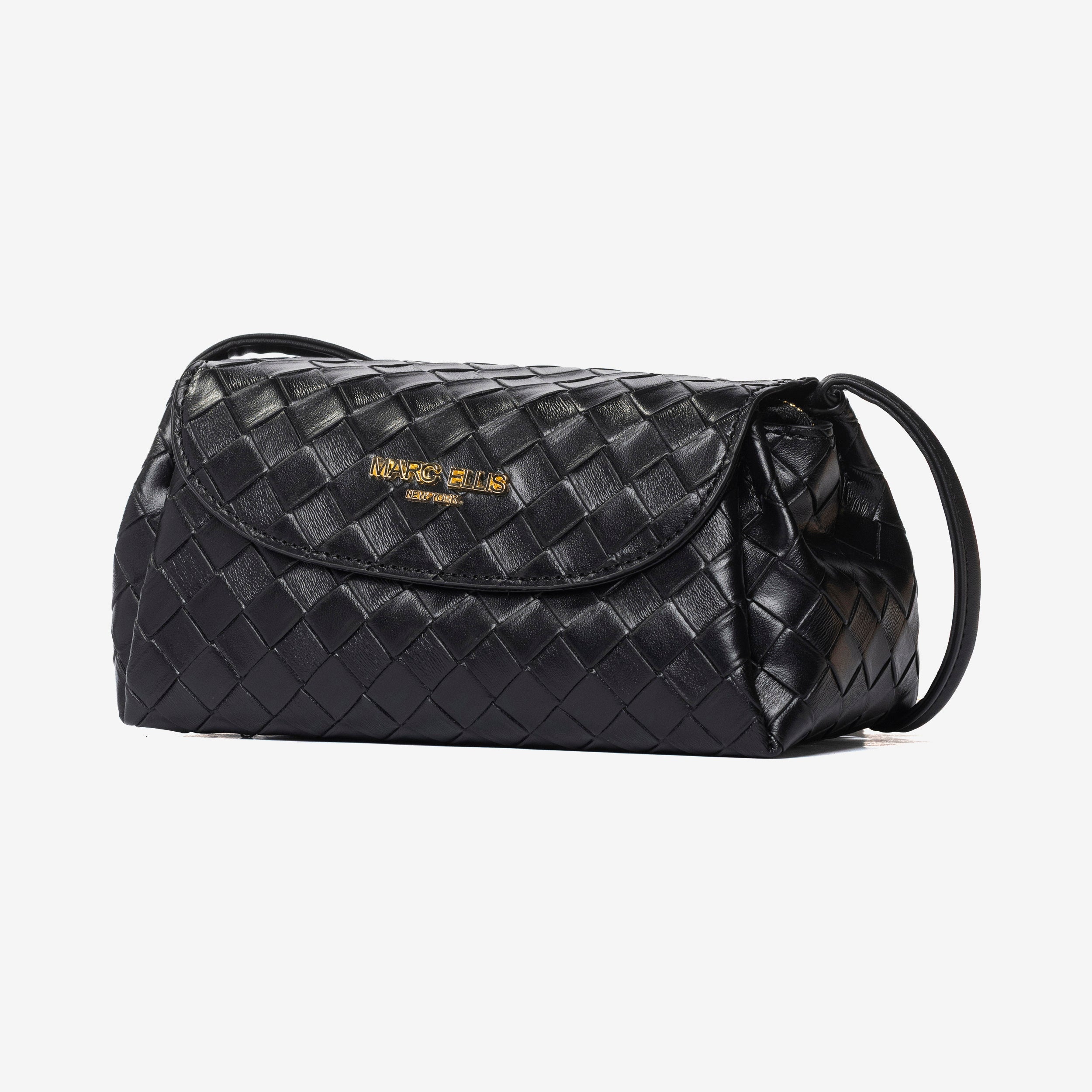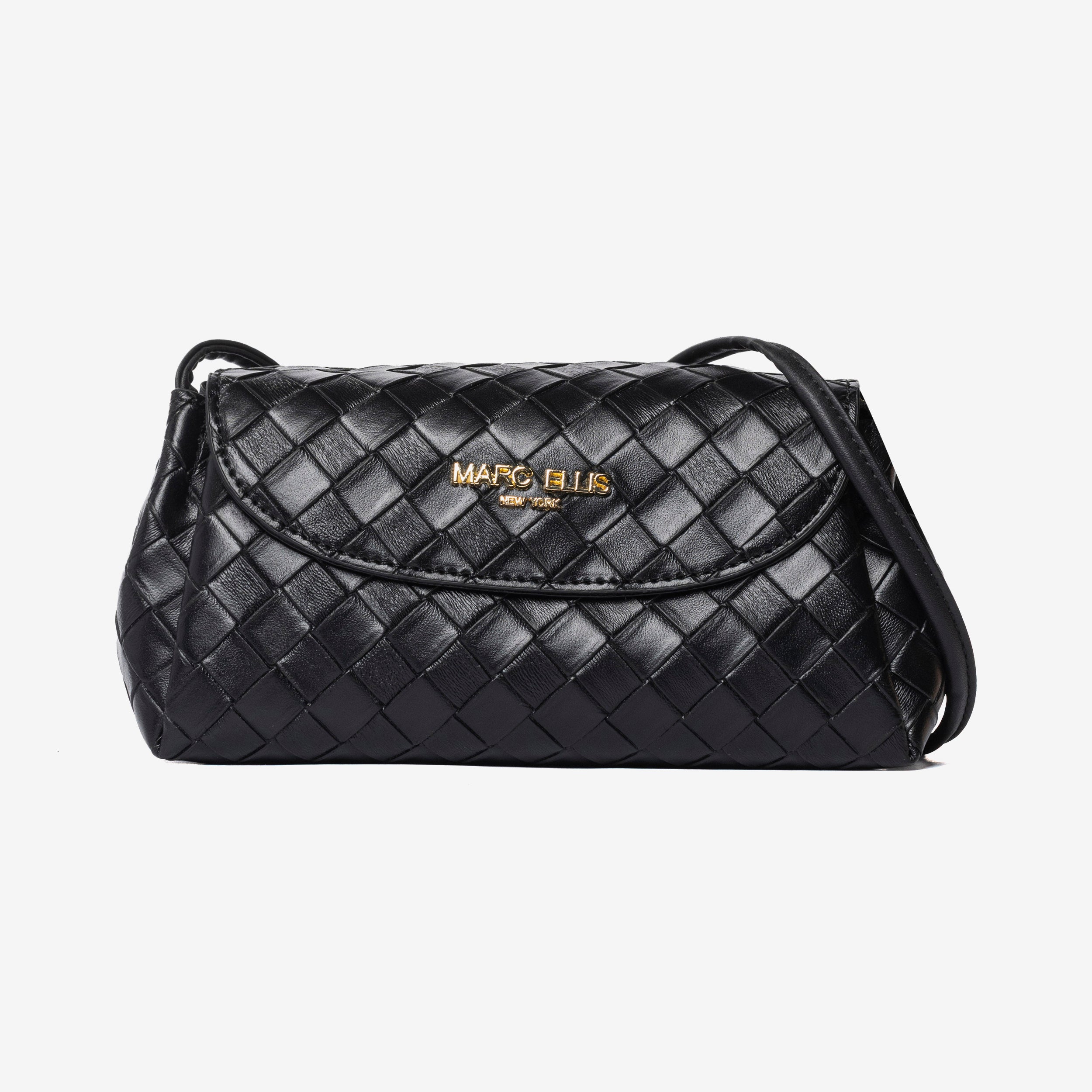 MARC ELLIS Borsa a tracolla Milenka nera da donna. La lavorazione effetto woven dona eleganza e ricercatezza, mentre la chiusura a patta con bottone magnetico assicura praticità. L'interno è organizzato con scomparto principale e tasca con zip, ideale per riporre con ordine gli oggetti essenziali. Logo frontale dorato a rilievo. Dotata di manico superiore per portarla a mano e di tracolla regolabile e removibile, che permette di indossarla anche a spalla o crossbody per un look più versatile. Un accessorio raffinato e funzionale, perfetto sia per il giorno che per la sera. Dimensioni: 20cm x 10cm x 11cm. Stagione autunno inverno.