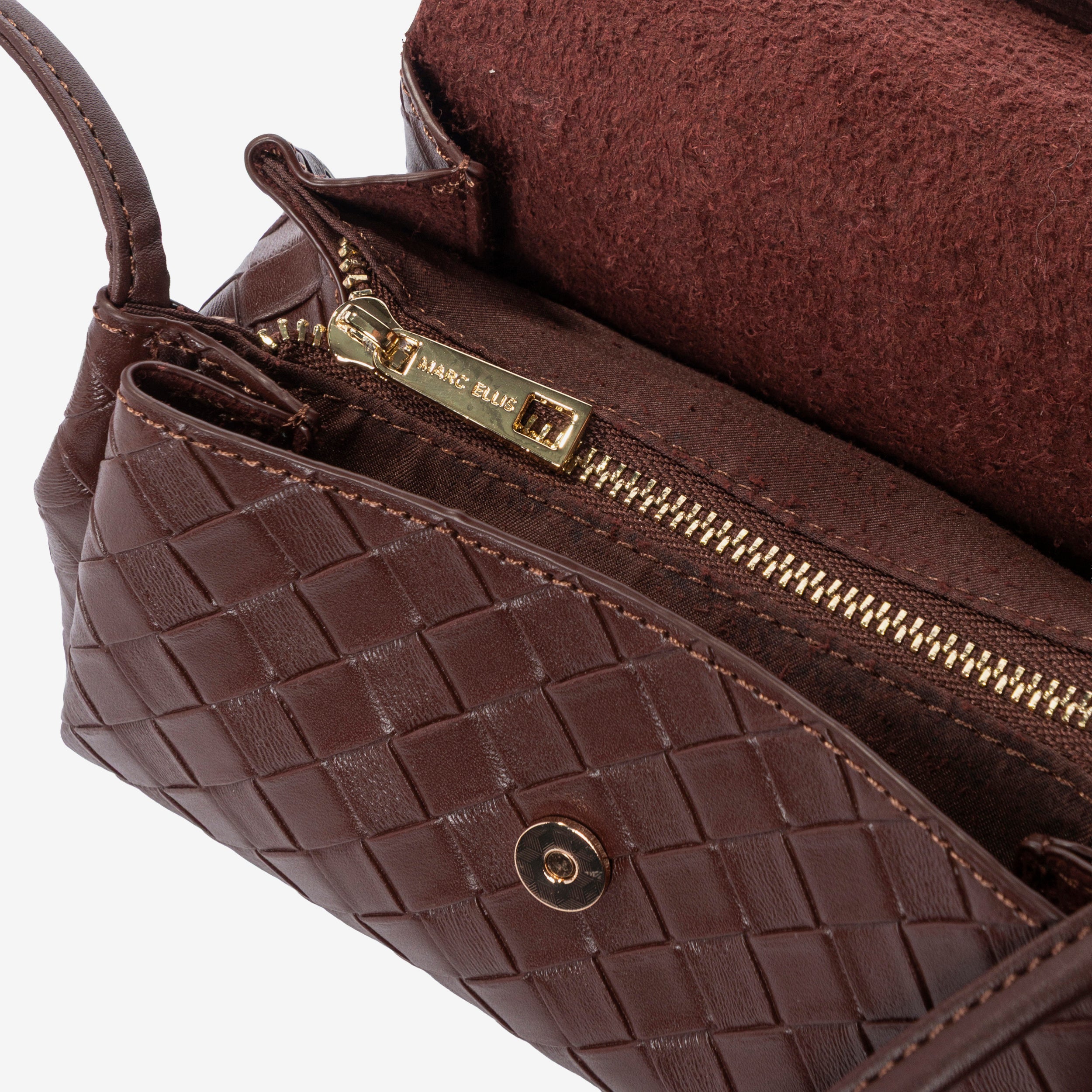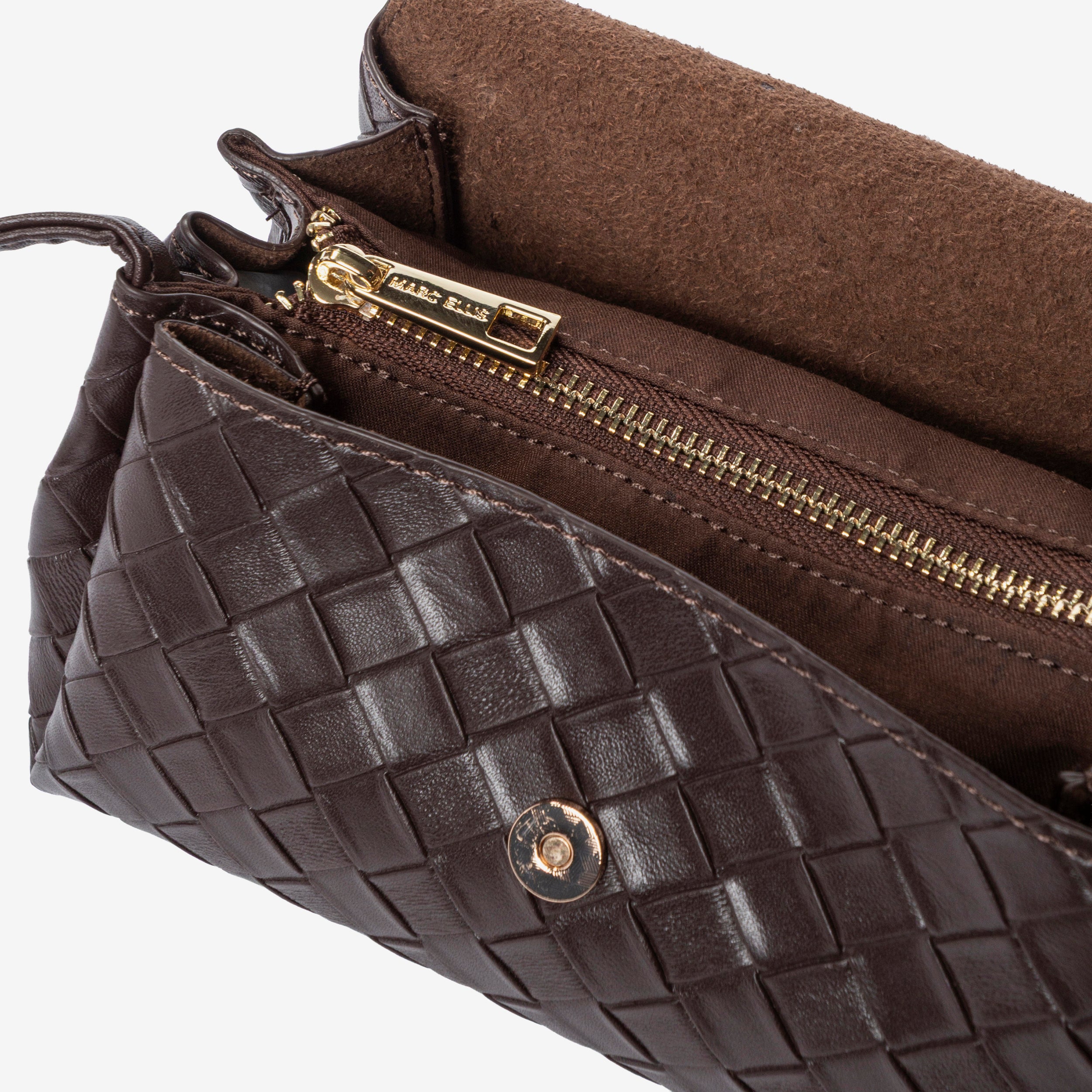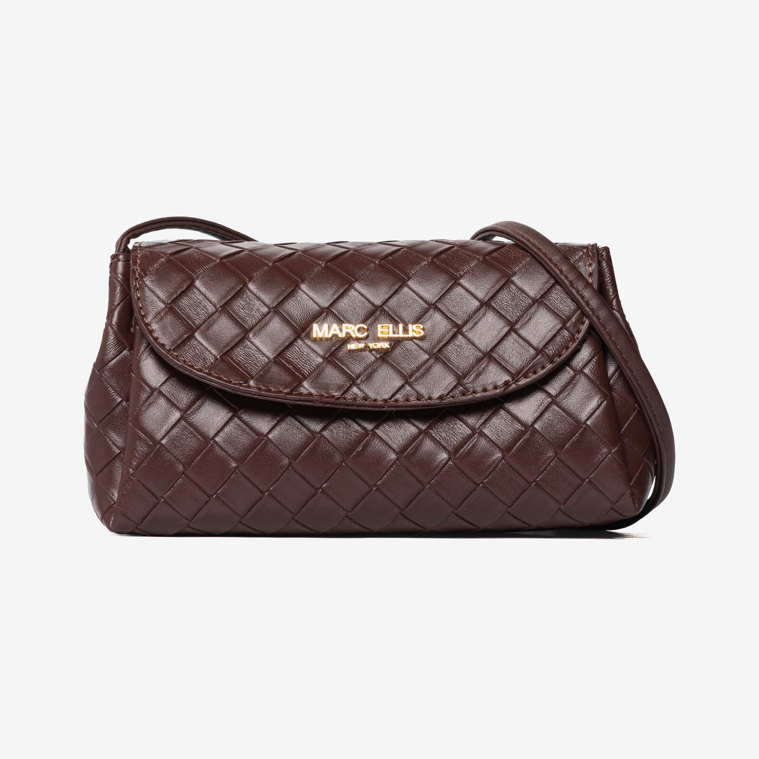 MARC ELLIS Borsa a tracolla Milenka nera da donna. La lavorazione effetto woven dona eleganza e ricercatezza, mentre la chiusura a patta con bottone magnetico assicura praticità. L'interno è organizzato con scomparto principale e tasca con zip, ideale per riporre con ordine gli oggetti essenziali. Logo frontale dorato a rilievo. Dotata di manico superiore per portarla a mano e di tracolla regolabile e removibile, che permette di indossarla anche a spalla o crossbody per un look più versatile. Un accessorio raffinato e funzionale, perfetto sia per il giorno che per la sera. Dimensioni: 20cm x 10cm x 11cm. Stagione autunno inverno.