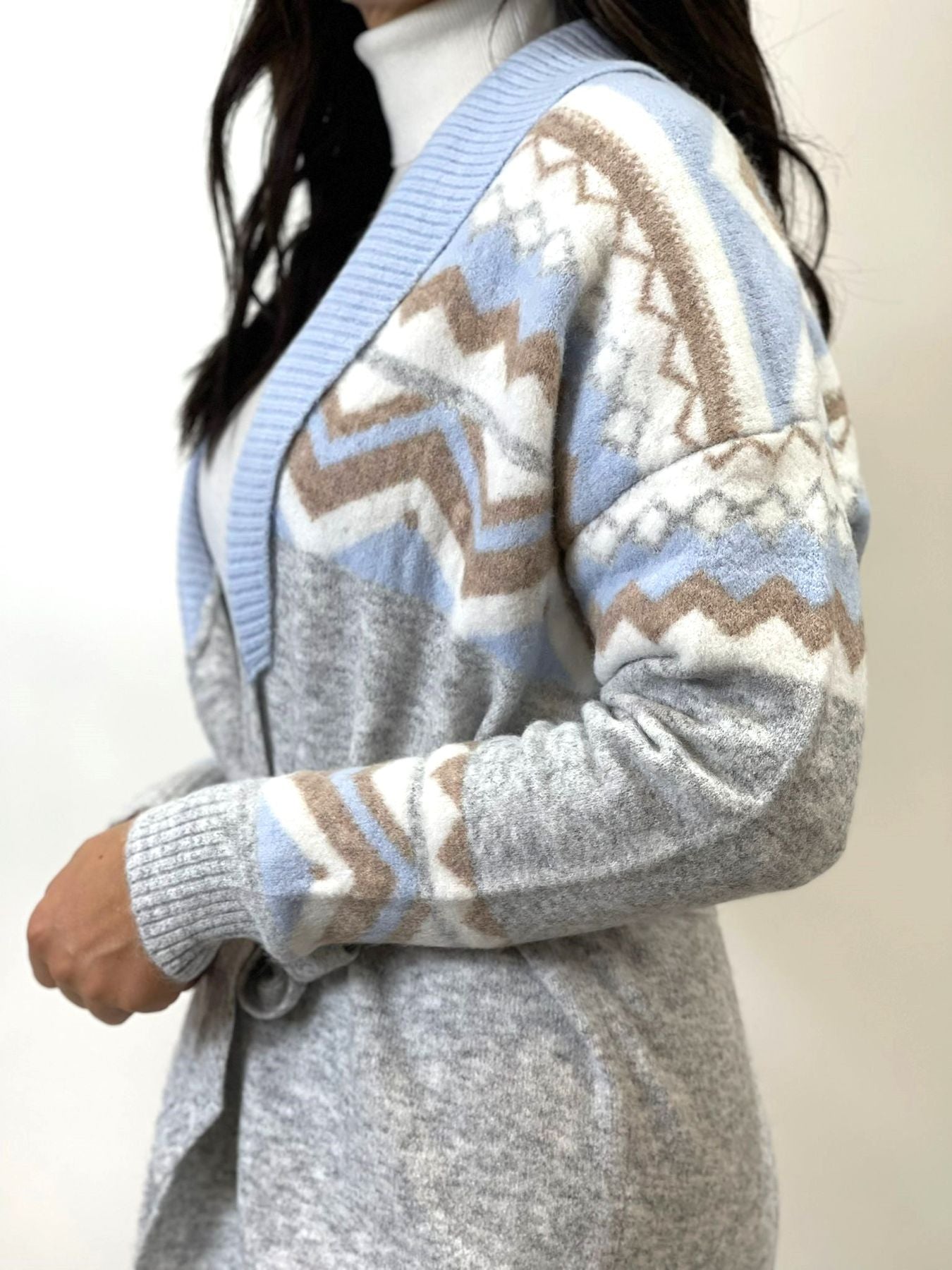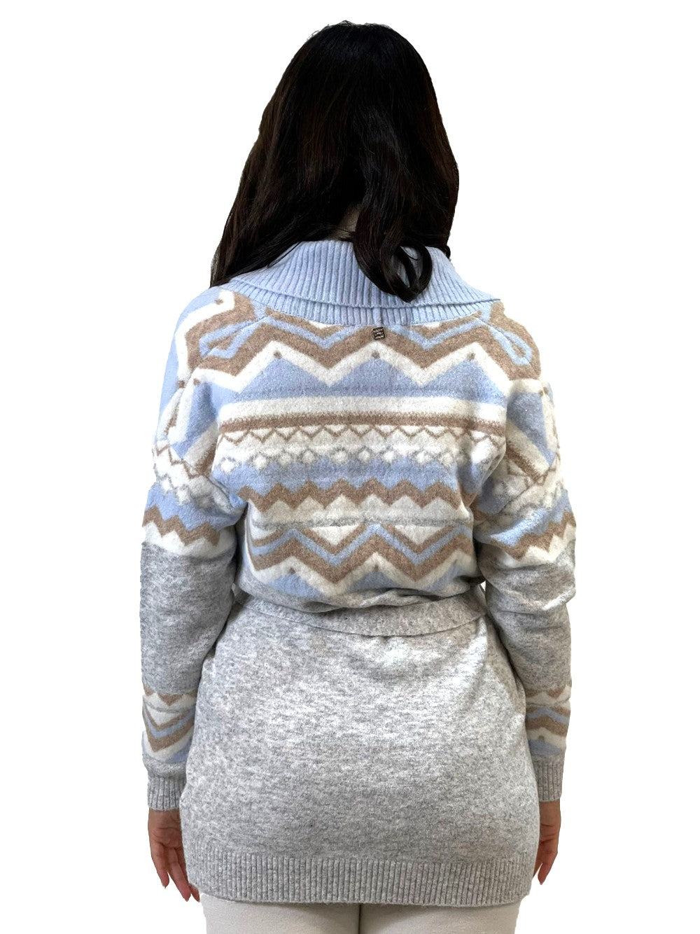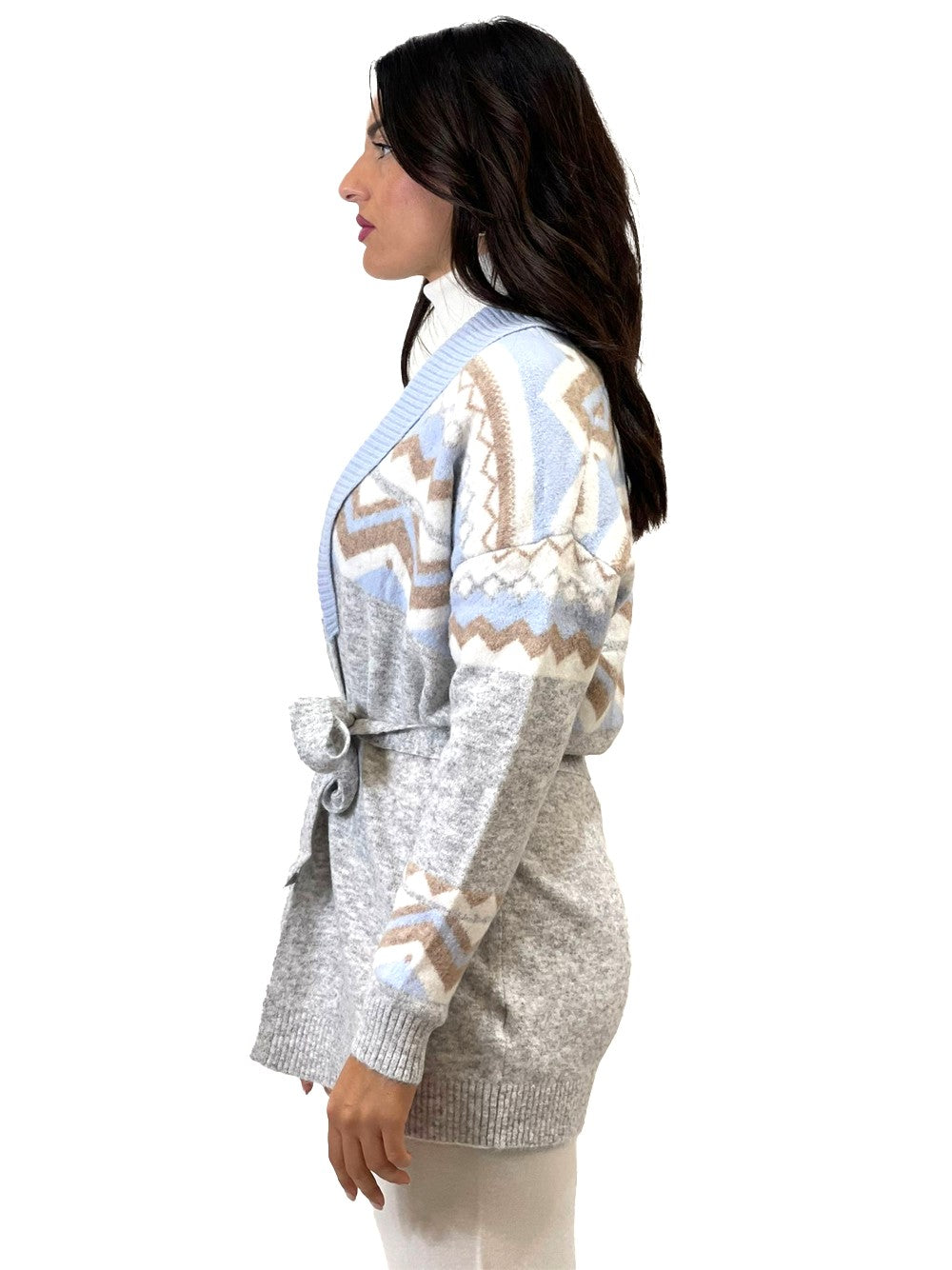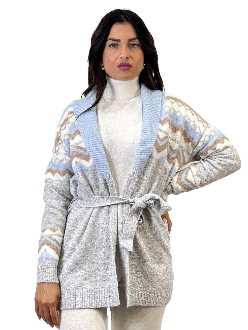 Cardigan donna soft in maglia jacquard con cintura in vita.